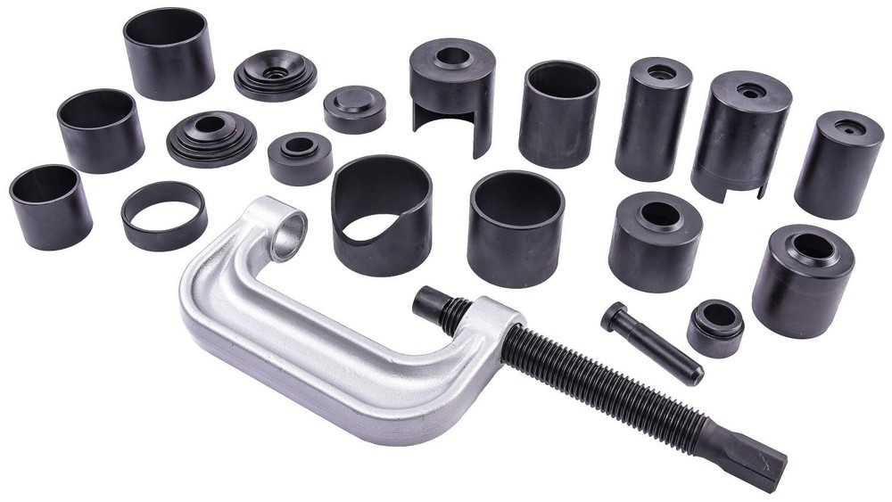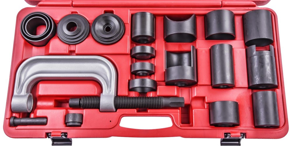 Ball Joint Service Kit20-Piece SetRemove/Install Ball Joints, Brake Pins, and U-JointsConstruction: SteelIncludes:(1) C-Press(1) Short Pin(7) Receiving Tubes(3) Adapters(8) Cups(1) Carry Case Parts Breakdown JEGS 555-80639 Ball Joint Service KitMake removing and installing press-fit ball joints, drum brake pins, and u-joints easy with the ball joint service kit from JEGS. This 20-piece kit has most of your needs covered. With a range of tubes, adapters, and cups, designed to fit with the included c-press, you can complete most jobs in the comfort of your garage.JEGS 555-80639 Ball Joint JEGS 80639 Ball Joint Service Kit 20-Piece Set Remove/Install Ball Joints Brake Ball Joint Service Kit 20-Piece Set Remove/Install Ball Joints, Brake Pins, and U-Joints Construction: Steel Includes: (1) C-Press (1) Short Pin (7) Receiving Tubes (3) Adapters (8) Cups (1) Carry Case Parts Breakdown JEGS 555-80639 Ball Joint Service Kit Make removing and installing press-fit ball joints, drum brake pins, and u-joints easy with the ball joint service kit from JEGS. This 20-piece kit has most of your needs covered. With a range of tubes, adapters, and cups, designed to fit with the included c-press, you can complete most jobs in the comfort of your garage. JEGS 555-80639 Ball Joint Service Kit Features: Red plastic blow-molded case securely holds each part in its specific location Designed for press-fit ball joints, will not work with the bolt-in type Fits the 1210 series and larger u-joints Measurements C-Press Opening dimensions: 6 1/8 in. L x 2 1/8 in. D Threaded rod: 9 1/8 in. L x 1.120 in. D Bolt head: 7/8 in. Through opening inside diameter: 1.260 in. Adapters Adapter 1 Side 1 dimensions: 1.720 in. D, 2.230 in. D, 2.720 in. D Side 2 dimension: 0.865 in. D (Fits C-press threaded rod) Inside diameter: 0.945 in. Adapter 2 Side 1 dimensions: 2.225 in. D, 2.720 in. D Side 2 dimension: 0.865 in. D (Fits C-press threaded rod) Inside diameter: 0.0515 in. Adapter 3 Outside diameter: 1.435 in. Stepped flange diameter: 1.220 in. (Fits C-press bottom opening) Inside diameter: 0.815 in. Cups Cup 1: Dimensions: 2 7/8 in. L x 2 in. OD Inside diameter: 1.800 in. Internal depth: 2 3/8 in. Bottom opening diameter: 0.235 in. Cup 2: Dimensions: 3 5/8 in. L x 2.500 in. OD Inside diameter: 2.165 in. Internal depth: 3 1/8 in. Stepped flange dimensions: 2.465 in. OD x 1 in. H Notch dimensions: 1.240 in. W x 5/8 in. H Bottom opening diameter: 0.435 in. Cup 3: Dimensions: 3 3/4 in. L x 1.995 in. OD Inside diameter: 1.780 in. Internal depth: 3 1/8 in. Bottom opening diameter: 0.230 in. Cup 4: Dimensions: 2 in. L x 2 1/2 in OD Inside diameter: 2 1/4 in. Internal depth: 1 1/2 in. Bottom opening diameter: 1.065 in. Cup 5: Dimensions: 3 3/8 in. L x 2.880 in. OD Inside diameter: 2.625 in. Internal depth: 2 7/8 in. Notch: 2 in. L x 2 3/4 in. W Bottom opening diameter: 1.065 in. Cup 6: Dimensions: 7/8 in. L x 2 1/4 in. OD Inside diameter: 1.815 in. Internal depth: 3/8 in. Bottom opening diameter: 0.890 in. Cup 7: Dimensions: 3/4 in. L x 2.240 in. OD Inside diameter: 1.890 in. Internal depth: 1/2 in. Bottom opening diameter: None Cup 8: Dimensions: 2 1/2 in. L x 2. 1/4 in OD Inside diameter: 2 in. Internal depth: 2 in. Stepped flange dimensions: 1/4 in. L x 2.165 in. OD Bottom opening diameter: 1 in. Pin Short Pin Length: 3 in. Head dimensions: 0.875 in. D x 0.255 in. T Long Pin (Installed in C-Press) Length: 3.700 in. Head Dimensions: 0.870 in. D x 0.920 in. T Tubes Tube 1: Dimensions: 1 3/4 in. L x 2 in. OD Inside diameter: 1 3/4 in. Tube 2: Dimensions: 1 3/4 in. L x 2 1/2 in. OD Inside diameter: 2 1/4 in. Tube 3: Dimensions: 2 1/4 in. L x 3 in. OD Inside diameter: 2 3/4 in. Tube 4: Dimensions: 2 1/4 in. L x 3 in. OD Inside diameter: 2 3/4 in. Scalloped dimensions: 1 1/8 in. L x 2 1/2 in. W Tube 5: Dimensions: 2 1/4 in. L x 2 3/4 in. OD Inside diameter: 2.430 in. Tube 6: Dimensions: 2 3/4 in. L x 2 1/2 in. OD Inside diameter: 2 1/4 in. Tube 7: Dimensions: 7/8 in. L x 2 1/2 in. OD Inside diameter: 2 1/4 in. Case Dimensions: 24 3/8 in. L x 13 in. W x 3 5/8 in. D From the iconic mail order catalog to a fully-stocked digital commerce experience, we have built a preferred destination for every gear-head, professional racer, weekend warrior and restoration nut who wants to take their vehicle to the next level. Around here, we don't just sell parts - we rely on them when driving our own cars around racetracks, dirt trails, and interstates across the country. Parts may be our business - but grease, fuel, exhaust, power, and speed are what we live for. Today, more than 350 people are employed by JEGS and the business draws in hundreds of thousands of customers each year. Yet, we maintain the culture stared by Jeg Coughlin from the very beginning: a family-run performance shop that preserves a trusted relationship with each and every customer. From the iconic mail order catalog to a fully-stocked digital commerce experience, we have built a preferred destination for every gear-head, professional racer, weekend warrior and restoration nut who wants to take their vehicle to the next level. Around here, we don't just sell parts - we rely on them when driving our own cars around racetracks, dirt trails, and interstates across the country. Parts may be our business - but grease, fuel, exhaust, power, and speed are what we live for. Today, more than 350 people are employed by JEGS and the business draws in hundreds of thousands of customers each year. Yet, we maintain the culture stared by Jeg Coughlin from the very beginning: a family-run performance shop that preserves a trusted relationship with each and every customer. From the iconic mail order catalog to a fully-stocked digital commerce experience, we have built a preferred destination for every gear-head, professional racer, weekend warrior and restoration nut who wants to take their vehicle to the next level. Around here, we don't just sell parts - we rely on them when driving our own cars arou