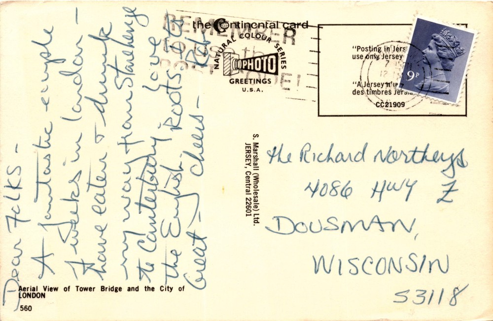 MAKE AN OFFER. THE MORE YOU BUY THE BETTER DEAL I WILL ACCEPT The postcard mentions a fantastic experience in London, specifically mentioning Starchenge, Canterbury, and the English Great. The sender mentions eating and drinking in these locations and sends cheers from Jersey. The postcard also includes a wholesale company's address in Jersey, as well as a reference to Natura, Continental card, Colour Cophoto, and Greetings from the USA.