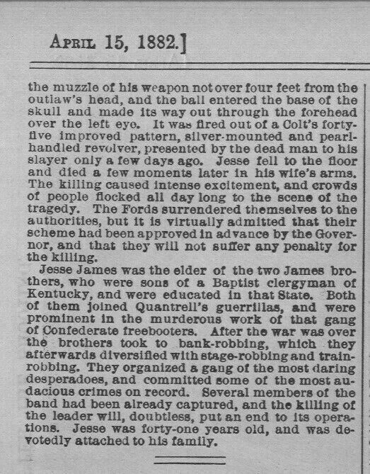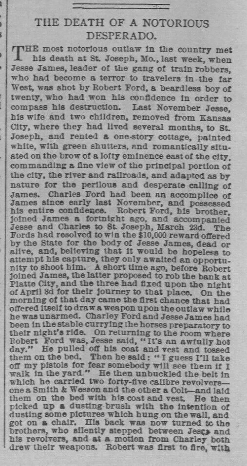 Antique Engravings, Prints, Maps and Newspapers sells only original/authentic material. Museums, Historical Societies, Universities, Educators, Movie sets Menu Engravings Newspapers Antiques Maps Civil-War-Prints Baseball Thomas-Nast Hunting-Prints Old-West-Engravings JESSE JAMES NOTORIOUS DESPERADO KILLED IN ST. JOSEPH MISSOURI HOUSE EXCITEMENT AFTER THE SHOOTING 1882 JESSE JAMES HISTORY Description This genuine antique engraving is titled "MISSOURI - THE HOUSE AT ST. JOSEPH IN WHICH THE NORORIOUS DESPERADO JESSE JAMES WAS KILLED APRIL 3 - THE POPULAR EXCITEMENT AFTER THE SHOOTING", published in "Frank Leslie's Illustrated" April 1882. This dated engraving from the year of 1882 is 11 x 15 inches in size. It is in excellent condition, highly displayable and ready for framing and is guaranteed to be as described. I do not deal in copies/reproductions. This beautiful and decorative antique chromolithograph would make a great addition to any Home, Office or Restaurant decor! I have provided Antique Engravings, Prints, Maps & Newspapers globally to museums, Institutions, art dealers, researchers, genealogists, movie sets, interior designers, curators, authors, knowledgeable collectors and beginners too. The comments buyers have made in my "feedback" file are an indication of the quality product and exceptional service I deliver. Authenticity of all items, as described in each listing, and the accuracy of that description, is guaranteed unconditionally. SHIPPING POLICY Shipping will be free. International airmail shipping will be $15. All items will be shipped in a acid free archival poly bag and securely packaged in a sturdy reusable flat or mailing tube to assure safe delivery. I will combine multiple purchases for just one shipping charge. Feedback will be left on all transactions and I would appreciate you doing the same. PAYMENT POLICY Payment must be received no later than 10 days through PayPal. RETURN POLICY I have had very few inquiries for item returns. In the event of such a request, the transaction will be evaluated and a refund offered if the item differs substantially from the description presented. My goal is Customer Satisfaction! ADDITIONAL INFORMATION At your fingertips here at this website you have a gallery of many thousands of Antique Engravings, Prints, Maps and Newspapers. Find the subject matter you are looking for using my Store Search engine provided. All newspapers listed in my eBay store feature unique ads, stories and opinions that bring past values, beliefs and attitudes back to life like no other medium can duplicate. Every item I sell is genuine/original, NOT reproductions and guaranteed to be as described. Be sure to check out the other select engravings and vintage newspapers I have listed at the moment on eBay and book-mark this site as I will be listing other historical items each week. I welcome comments! Thank you very much for taking the time to stop in and look at these remarkably well preserved historical relics of the past! About ENGRAVINGS PRINTS MAPS NEWSPAPERS I am a seller and buyer of historic ANTIQUE ENGRAVINGS, PRINTS, MAPS AND NEWSPAPERS and have provided these to museums, Institutions, art dealers, researchers, genealogists, movie sets, interior designers, authors, curators, knowledgeable collectors and beginners too. Usefull Links About Us Payment Shipping Returns Feedback New Arrivals Ending Soon Contact Us Newsletter Add our store to your favorites to receive newsletters about new items & special promotions! Thank you For visiting our Store © Copyright, ENGRAVINGS PRINTS MAPS NEWSPAPERS. All rights reserved. Listing and template services provided by inkFrog