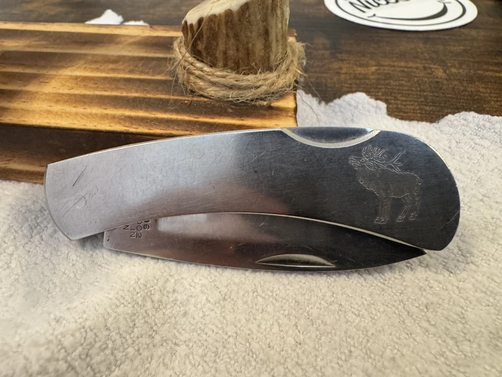 This is a vintage JET-AER Corp pocket knife, the Futura G-96 Model No. 6002, made in Japan in the 1980s. It features a stainless steel drop point blade under 2.75 inches, with a plain edge and a lockback mechanism. The handle also made of stainless steel, includes a moose inlay design. The knife is a manual opening type, ambidextrous, and has a single blade.