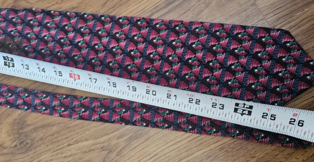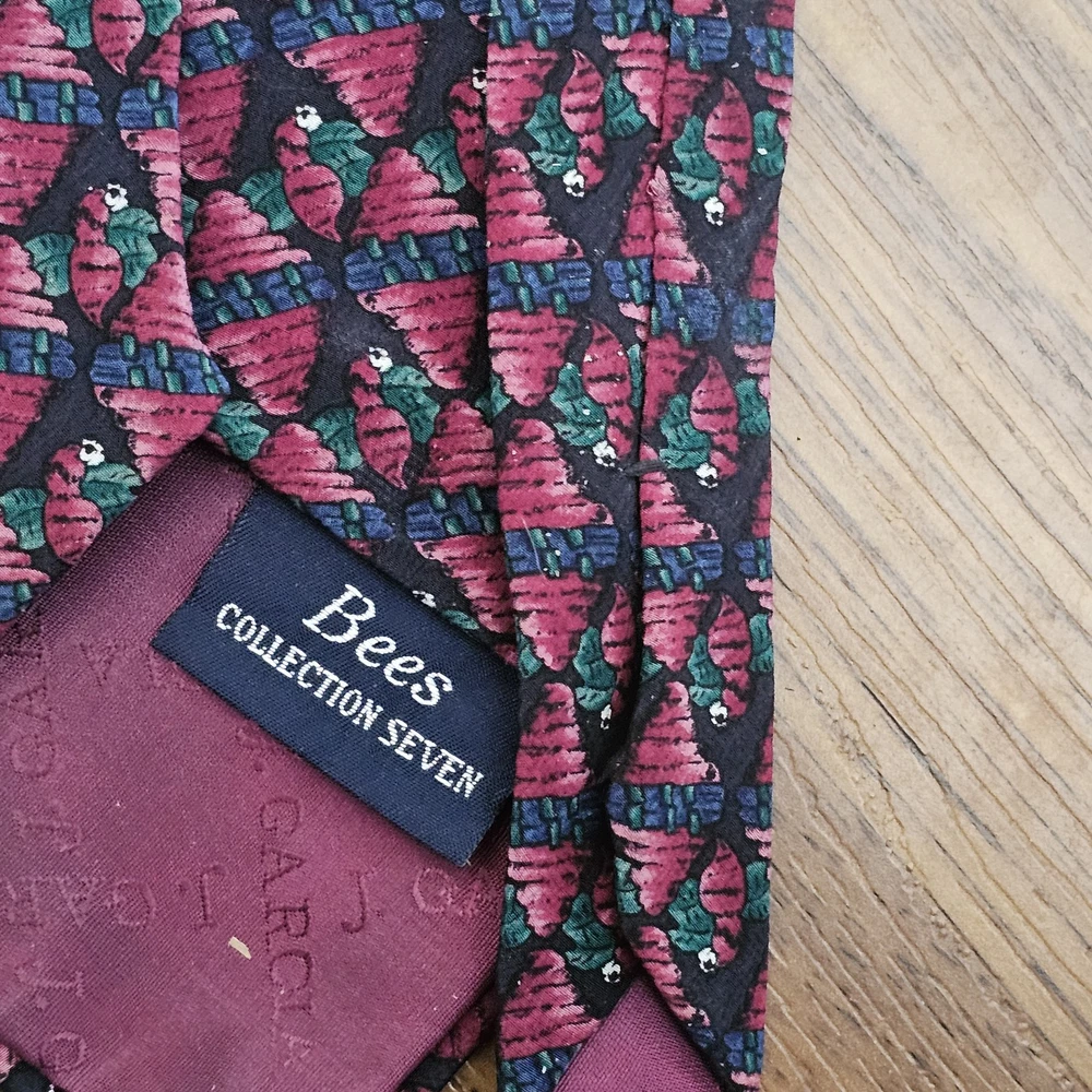 This is a J.Garcia men's necktie featuring a geometric abstract art design in navy blue and purple colors. Made of 100% silk, the tie has a classic length and width. It is designed to be tied and showcases a unique pattern inspired by bees.