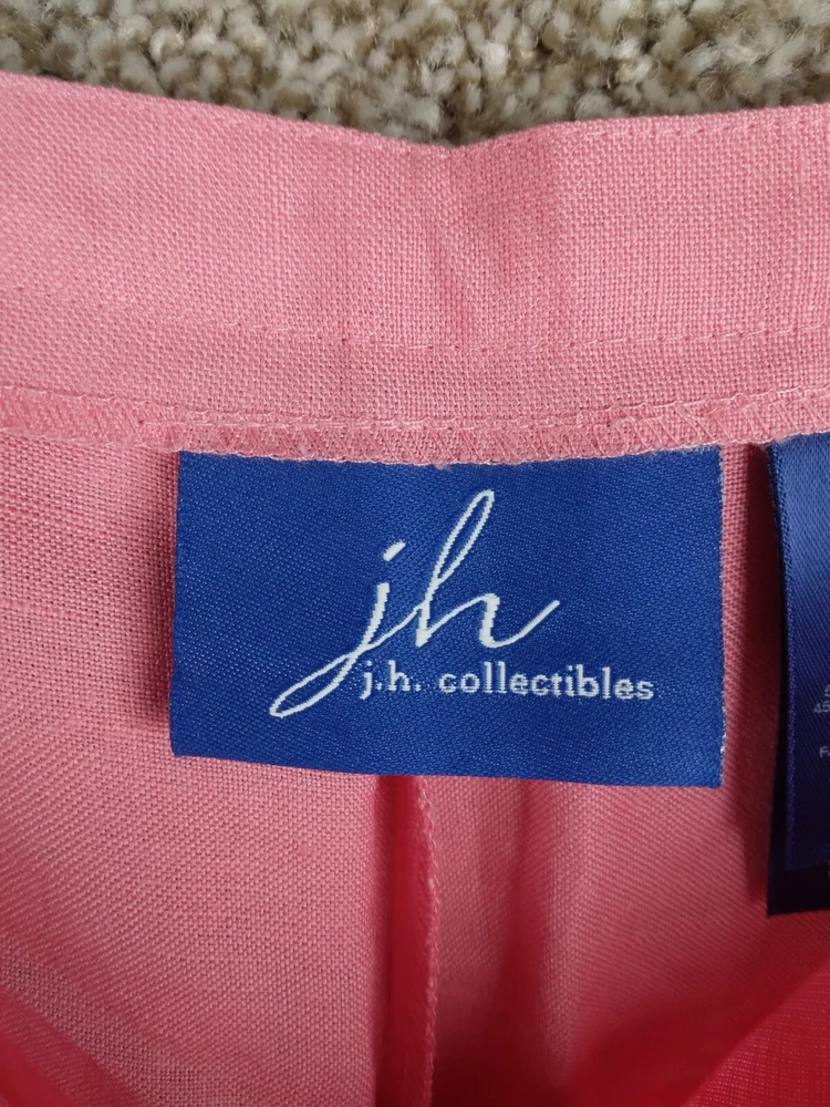 For Sale: A pair of pre-owned J.H. Collectibles Linen Blend Cropped Capri Pants Size: Women's 18 Measurements: Refer to photos above. Great pair of pants from an excellent brand! In good gently used condition with no major flaws such as rips, tears, or stains. We ship items daily, so plan to receive your item(s) quickly! We also combine & discount shipping for orders with multiple items. From a smoke-free home. We accept domestic 30-day returns. We provide a variety of measurements on all items. Measurements are approximate and as close to accurate as possible but certain fabrics and styles can have a slight variation. Please be sure to check all measurements on used garments as they have been laundered and might vary from other items in the same style. Please message me with any question you may have, I answer most questions very quickly!