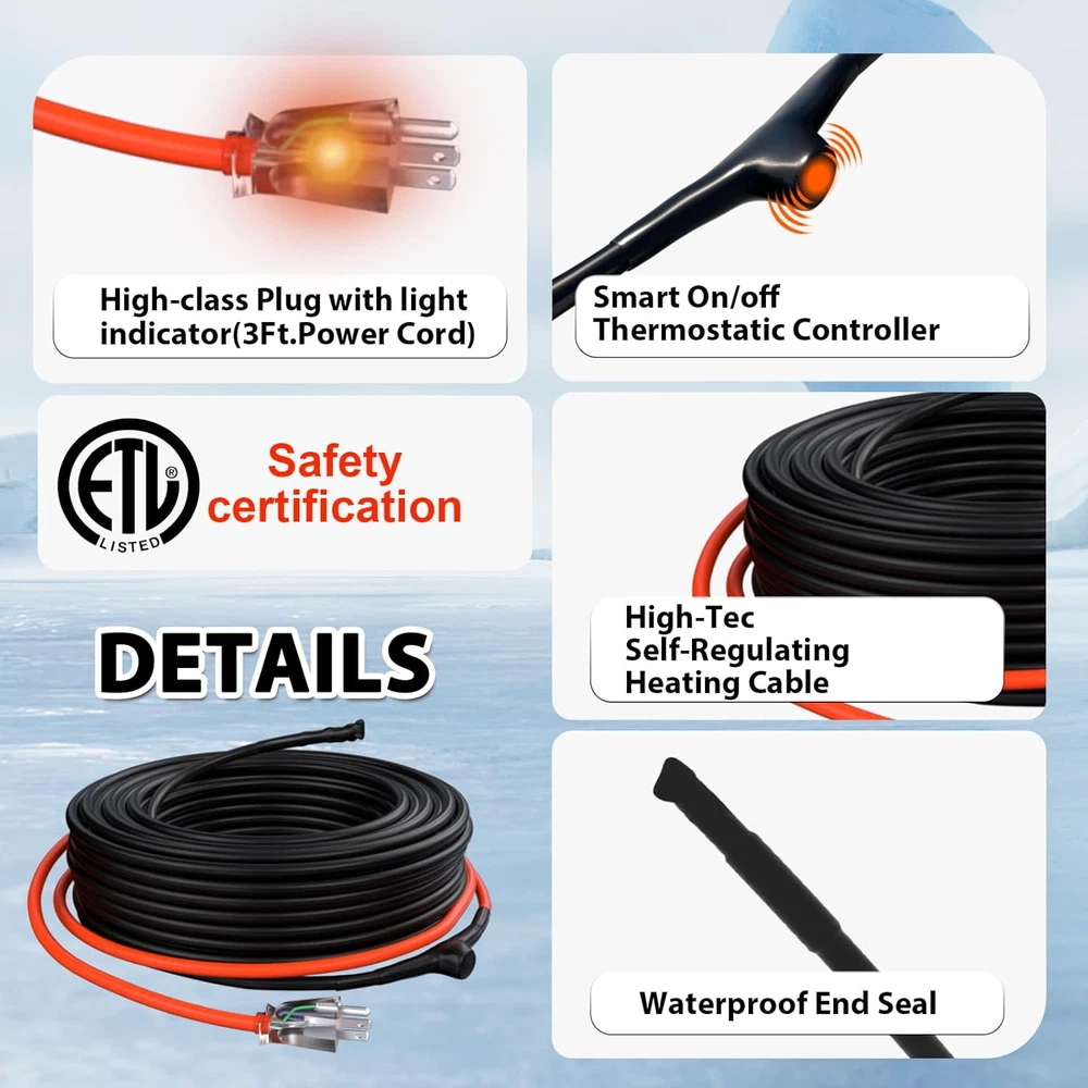 Menu Other Items Feedbacks About Us Contact Us Add To Favorites JHSF 40Ft Self-Regulating Heat Cable for Pipe Freeze Protection, Energy-Saving, Pipe Heat Tape for Metal and Plastic Home Supply Pipes, Keeps Water Flowing at -40°F, ETL Listed, 120V [Pipe Freeze Protection] Pipe Heating Cable, 3 W/ft, energy-efficient design. Safeguard your pipes and reduce electricity costs. Maintains water flow in temperatures as low as -40°F (-40°C). Includes a 2 Ft power cord and heating cable options ranging from 3 Ft to 160 Ft. This product is backed by up to USD 2 million in product liability insurance, providing you with added peace of mind and security in your purchase. [Compatible with Different Pipe Materials] Our water pipe heat cable is versatile, suitable for various pipe types. It works effectively with both metal and plastic water pipes, delivering reliable freeze protection across different materials. Whether it's copper, PVC, or stainless steel, our cable guarantees exceptional performance, ensuring your pipes remain secure and operational even in extreme weather conditions. [ETL Certified Safety] Our Self-Regulating Heating Cable is ETL certified, ensuring top-notch quality and safety. This certification confirms that our water line heat tape meets rigorous industry standards for performance and safety. Rest assured in the reliability of our pipe heat cables, providing exceptional freeze protection for your water pipes. Don't settle for less—choose a product that excels in both quality and safety. [High-Tech Self-regulating Heating Technology] Our water pipe heat tape features self-regulating technology, automatically adjusting heating power in response to ambient conditions, ensuring it never overheats or causes burns. This intelligent functionality optimizes energy usage, ensuring efficient and dependable pipe freeze protection. [Efficient Integrated Thermostat] Our pipe heat trace features a built-in thermostat, activating at 38℉(3℃) and deactivating at 50℉(10℃). This intelligent system regulates power output, operating only when needed for optimal energy efficiency. Rest assured, your water pipes are protected from freezing while minimizing energy usage. [Easy Installation and Versatile Length Range] Our pipe heat tape is designed for easy installation, with pre-installed features for user convenience. Whether straight, spiral, or overlap, it adapts effortlessly to your needs. Available in lengths from 3ft to 160ft, it offers versatile options for various applications, from residential to industrial. Product Description 1 Self-Regulating Tech 2 Automatic Thermostat 3 ETL Approved 1 Length Selection 2 Test Before Installation 3 Four Steps to Install HEATIT Pipe Freeze Protection Series You can Choose Add to Cart Add to Cart Add to Cart Add to Cart Add to Cart Add to Cart Add to Cart Customer Reviews 4.5 out of 5 stars 3,921 4.5 out of 5 stars 3,921 4.4 out of 5 stars 44 5.0 out of 5 stars 2 4.6 out of 5 stars 3,063 4.5 out of 5 stars 656 4.6 out of 5 stars 408 Price $22.99 $ 22 . 99 $29.99 $ 29 . 99 $28.99 $ 28 . 99 $13.99 $ 13 . 99 $14.99 $ 14 . 99 $34.89 $ 34 . 89 $45.99 $ 45 . 99 Output @ 50°F(10°C) 3W/FT 5W/FT 5W/FT 7W/FT 7W/FT 5W/FT 5W/FT Build-in Thermostat ✔ ✔ ✘ ✔ ✔ ✘ ✘ Application Pipe Freeze-protection Pipe Freeze-protection Pipe Protection/Roof De-icing Pipe Freeze-protection Pipe Freeze-protection Pipe Protection/Roof De-icing Pipe Protection/Roof De-icing Cable Structure Self regulating Self regulating Self regulating Regular (Constant wattage) Regular (Constant wattage) Self regulating Self regulating Certification ETL ETL ETL ETL,CSA ETL,CSA ETL ETL Cold Lead 2 Ft with Light Indicator Plug 3 Ft with Light Indicator Plug 6 Ft with Light Indicator Plug 3 Ft with Light Indicator Plug 2 Ft with Light Indicator Plug 3 Ft with Light Indicator Plug 3 Ft with Light Indicator Plug Heated Cable Length 3FT to 120FT 3FT to 160FT 2FT to 130FT 3FT to 30FT 3FT to 80FT 6FT to 150FT 6FT to 150FT Spiral,Wrap or Cross ✔ ✔ ✔ ✘ ✘ ✔ ✔ NON-water-filled Pipes ✔ ✔ ✔ ✘ ✘ ✔ ✔ Dimension Width: 0.32"| Thickness: 0.22" Width: 0.32"| Thickness: 0.22" Width: 0.32"| Thickness: 0.22" Width: 0.49"| Thickness: 0.2" Width: 0.31"| Thickness: 0.21" Width: 0.32"| Thickness: 0.22" Width: 0.3"| Thickness: 0.2" Item Specification Item model number 40 ft Part Number 6947881590234 Style 40 ft Mounting Type Ceiling Mount Item Package Quantity 1 Color Black Material Type 3W/FT Product Dimensions 22 x 4 x 4 inches Material 3W/FT Country of Origin China Batteries Required? No Item Weight 2.2 pounds Batteries Included? No Special Features Durable Size 40 ft Is Discontinued By Manufacturer No Included Components 1 Dimensions Shipping Returns Additional Info Product Dimensions: 4.0 inches x 22.0 inches x 4.0 inches. Weight: 2.2 lb Fast shipping is very important for us. Our standard shipping service is FREE. Your order will be shipped within 1-3 business days upon full payment received. Most items are delivered within 3-5 business days, however, please allow 3-10 business days. We are shipping only to USA. We only ship to the confirmed Paypal address. We reserve the right to cancel any order for any reason at any time. We are not responsible for undeliverable addresses. We offer a 30 day return policy from checkout winning date. Your satisfaction is guaranteed! If for any reason you are unhappy with your item, just return it within 30 days for a full refund, minus shipping cost. Please contact us prior to initiating a return so that we can issue you a refund authorization. Items defective upon receipt must be packaged in their retail packaging as if new and returned with a detailed description of the problem. Return shipping fees are not refundable. We reserve the right to decline any returns if the above guidelines are not followed. All of our items, unless otherwise stated, will only run on 120 volts. Please check to make sure your country complies with these speci