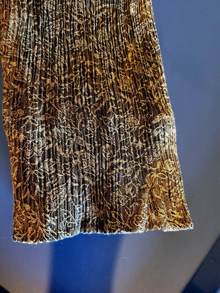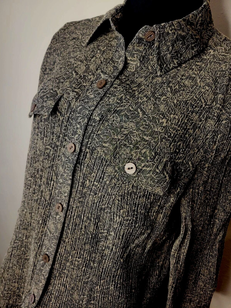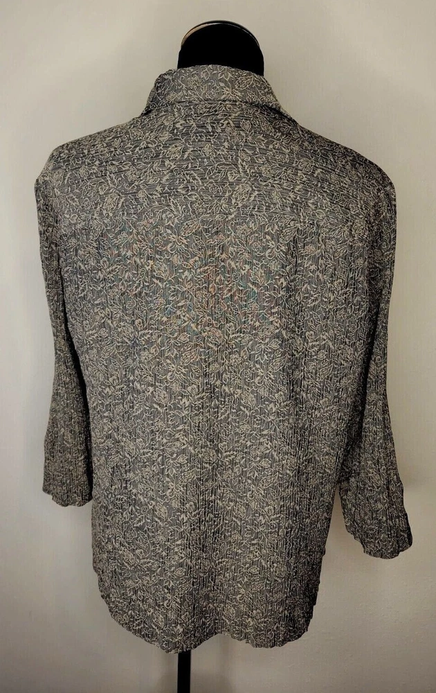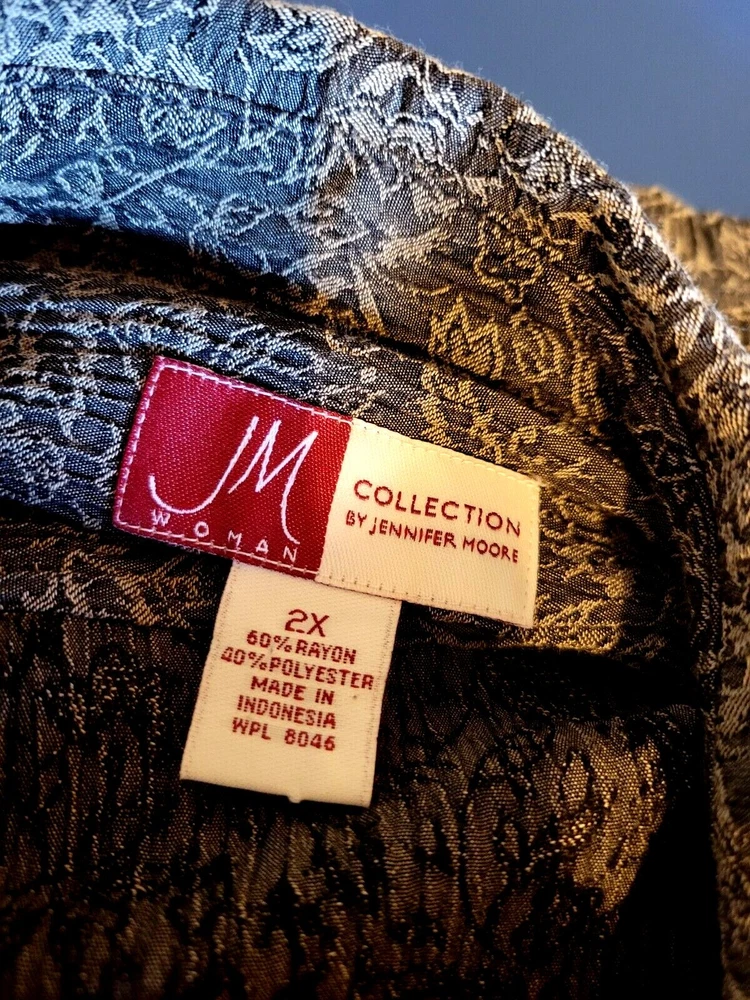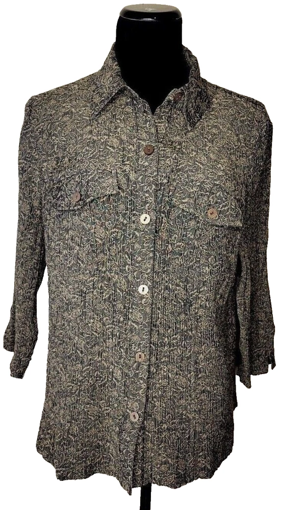 JM Collection by Jennifer Moore women's 2X rayon/polyester blend button front 3/4 sleeve shirt. Brown with floral print. Crinkle type material. Two front pockets. Slit at sleeve. Runs small for a 2X. Would say it is more likely a XL. Beautiful shirt is excellent condition. Chest: 22" Length: 25"