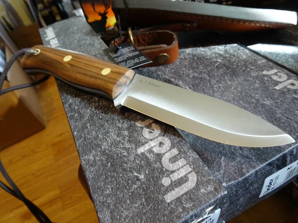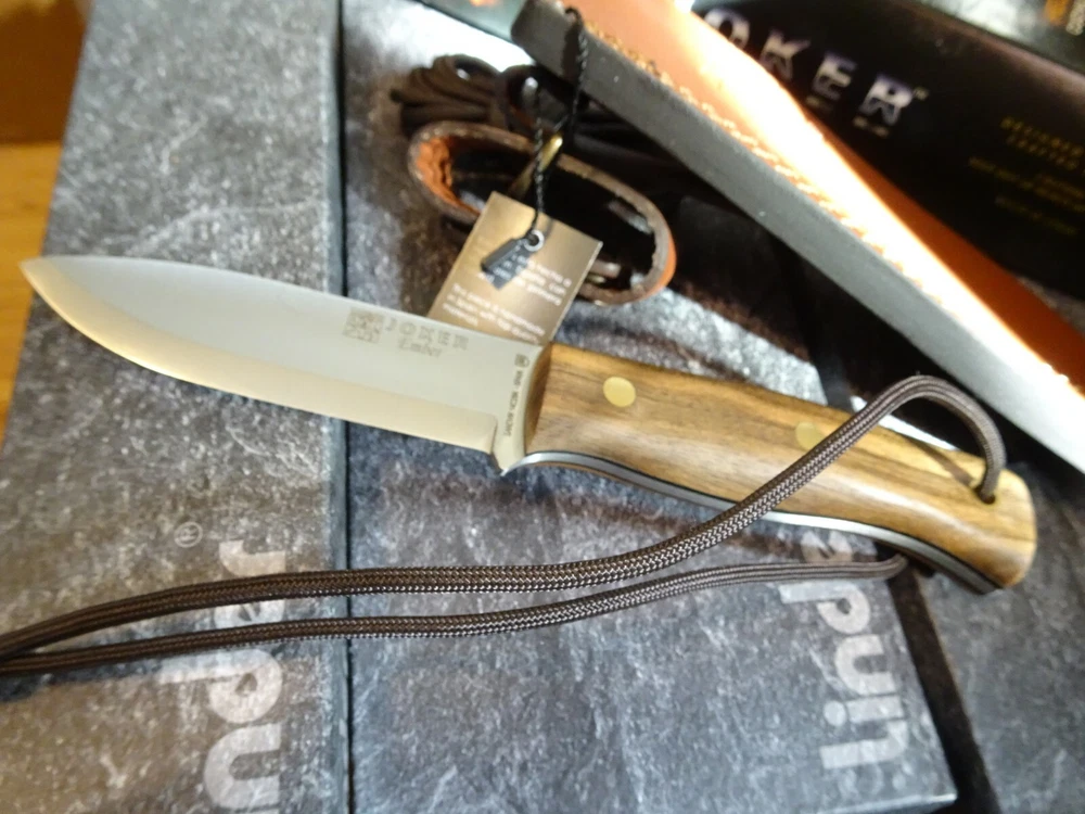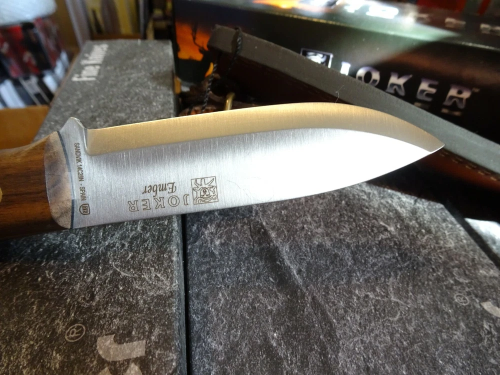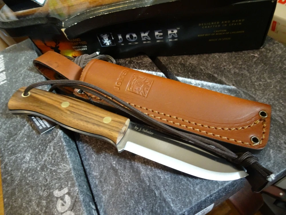 JOKER BRAND CUTLERY HANDCRAFTED SPORTING CUTLERY 8.88" WOOD / WALNUT HANDLE BUSHCRAFT SURVIVAL KNIFE, CN-122 MADE IN VERY LOW QUANTITIES, AND HAS A VERY SHARP BLADE PLUS A GENUINE EMBER WOOD HANDLE AND A 4" LONG SANDVIK 14C28N STAINLESS STEEL BLADE DROP POINT. THIS IS THE ONLY KNIFE WE HAVE WITH THIS ALLOY FOR THE BLADE. DESIGNED BY J. SABATER in very Limited Quantities only 450 knives made this year. Only 3 left, This Joker Brand of Hand-Made Sporting Cutlery is called "EMBER" BS-9 Model # JKRCN122, Weight 6.1oz. with the leather sheath 9.5oz. The Blade is very sharp 4" long with a 4" blade edge, 1 1/8" wide, 1/8" thick, Full Tang Construction, and a Drop Point Design we have no other blade that looks like this one does. The Handle is a High-Grade of EMBER which is a wood type Walnut it is used mainly for hand-made high dollar gifts. with a ton of grain giving it a great look, they cut finger grooves into the wood and put two 1/4" Brass Rivets in the handle and a Lanyard Hole with a tie-down then all of this goes into a Brown High-Grade Leather Belt Sheath double-stitched and riveted and it has a safety ring. The handle is Ember a type of walnut wood and this is the 1st time I have had a knife with this type of handle so I looked it up and found diddly everything I read was about a hot coal in a fire, but looking even future I did find people use it for hand made carved expensive gifts of all kinds. We also wanted to tell you about the alloy, Sandvik 14C28N ® is a martensitic stainless chromium steel with a chemistry optimized for high quality professional knife applications. The chemical composition provides a unique combination of properties including: Excellent edge performance Very high hardness Good corrosion resistance Sandvik 14C28N ® is mainly recommended for knife applications which put very high demands on edge sharpness, edge stability and corrosion resistance. Examples are pocket knives, chefs knives, hunting knives and fishing knives. FEATURES; 8.88" overall. 4" satin finish 14C28N Sandvik stainless Scandi grind blade. Walnut handle. Full, extended tang. Lanyard hole. Includes 2m of 550 paracord. Brown leather belt sheath We put 12 pictures of this very high-quality Joker Bushcraft Knife for you to view, you should also know these are sold-out we just got the last of what Joker had this is one beautiful knife you may want to look at it very hard. Again we found Joker is using two superior materials to make this knife . and we will give you $$$$$$$$$$$$$$$$$$$$$$ FREE SHIPPING $$$$$$$$$$$$$$$$$$$$$$$$$$ to help get one in your hands, in the U.S. only. WE THANK YOU AND GOD BLESS YOU. by adding my eBay Store to your Favorites, . - Sign up and receive our emails, why SALES that is the only email we will ever send to you. We are always trying to get different knives into your hands, so by saving you some money maybe you will try out a new brand. Plus every listing we have is put on sale from the highest to the lowest priced items, and lastly many times we put knives that there are only 1 or 2 left in our stock by receiving our email you will get first shot at these items, Thank you Greg