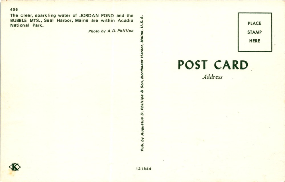 MAKE AN OFFER. THE MORE YOU BUY THE BETTER DEAL I WILL ACCEPT This postcard features a photograph of Jordan Pond and the Bubble Mountains in Seal Harbor, Maine, which are located within Acadia National Park. Jordan Pond is a picturesque body of water known for its clear and sparkling waters, surrounded by beautiful scenery. The Bubble Mountains are two rounded peaks in the park that offer stunning views of the surrounding landscape.