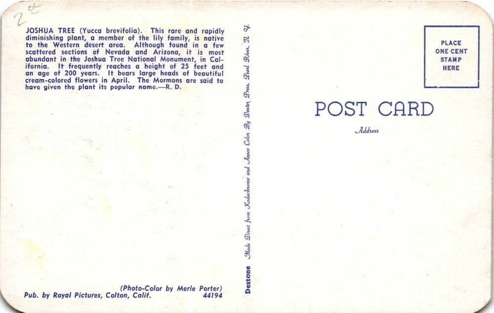 The postcard features a photo of a Joshua Tree (Yucca brevifolia), a rare plant native to the Western desert area, particularly abundant in the Joshua Tree National Monument in California. The plant, a member of the lily family, is known for its rapid diminishing population.