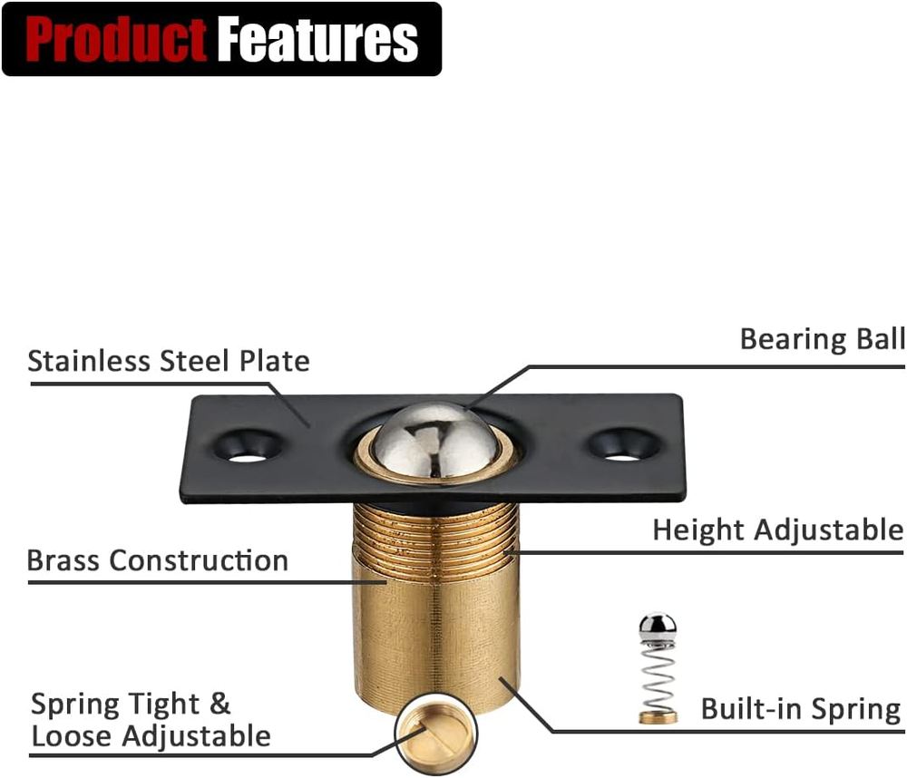 Store New Arrivals Add to Favorite View Feedback JQK Closet Door Ball Catch Hardware, Stainless Steel Catch Adjustable with Strike Plate, Black Finish 2 Pack, HBC100-BK-P2 Description Item model number HBC100-BK-P2 Part Number HBC100-BK-P2 Style Modern Finish Stainless Number of Pieces 2 Mounting Type Flush Mount Item Package Quantity 2 Color Black Brand JQK Material Stainless Steel Batteries Required? No Package Dimensions 4.17 x 2.76 x 1.57 inches Item Weight 5.1 ounces Batteries Included? No Color Name Black Special Features Easy to Install Manufacturer JQK Hardware Finish Type Stainless Size Name 2 Pack Size 2 Pack 【ALL METAL Ball Catch】 solid stainless steel and brass construction, rust-proof & toughness ensuring high quality and longevity 【Smooth Spring & Ball】 Used on closet doors with dummy knobs or levers and forms secure closure and smooth open. 【universal replacement hardware】 10 mm adjustable ball catch, screw hole distance: 40 mm 【Please check the dimension before purchase】 you can see it in the 2nd picture. 【Super easy to install】 4 screws (stainless steel, too) to secure it in place Product Description JQK Hardwares Add to Cart Add to Cart Add to Cart Add to Cart Add to Cart Add to Cart Add to Cart Customer Reviews 4.6 out of 5 stars 4,921 4.5 out of 5 stars 8,230 4.6 out of 5 stars 2,470 4.5 out of 5 stars 685 4.5 out of 5 stars 4,458 4.5 out of 5 stars 3,144 4.2 out of 5 stars 175 Price $7.39 $ 7 . 39 $6.99 $ 6 . 99 $10.99 $ 10 . 99 $7.40 $ 7 . 40 $7.60 $ 7 . 60 $17.60 $ 17 . 60 $29.99 $ 29 . 99 Product Name Ball Door Catch Magnetic Door Catch 3.54" Door Stopper Wedge Door Stopper 5" Door Hasp 3/8" Inset Cabinet Hinges 1/2" Partial Overlay Hinge Material — — — — — — — Colors — — — — — — — Installation — — — — — — — Packs — — — — — — — ABOUT US We offer the best prices around on high quality products. Our E-store includes media such as books, movies, music and games while offering electronics, toys, sporting apparel, clothing, tools, general home, garden items and more. SHIPPING We are always working hard to ensure your package arrives as soon as possible. Please understand that some factors like weather, high postal traffic, and the performance of shipping companies are outside of our control. We offer free shipping to the lower 48 states and ship within 2 business days of payment, usually sooner. We do not accept P.O. Boxes. Please provide a physical address. RETURNS We offer a 30-Day Return Policy on items which you are not completely satisfied with. You have the option for a full-refund or an exchange of the item. No returns are available on items shipped outside of the USA. PAYMENT We accept PayPal. CONTACT US This page content is yet to come Please ad us to your favorite seller and visit again later Thank You