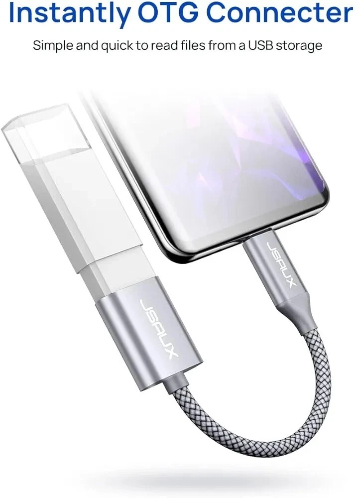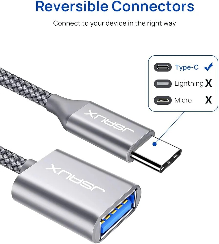 JSAUX USB C to USB Adapter 2 Pack USB Type C Male to USB 3.0 Female OTG Cable 【USB On-The-Go】: Plug in and use computer peripherals, such as flash drive, keyboard, hub, mouse, and more, makes your USB-C devices compatible with USB drives and any other USB devices that support USB On-The-Go. 【USB 3.0 Super Speed Transfer】: Full USB 3.0 super speed data transfer up to 5Gbps, 10x faster than USB 2.0. Transfer files, HD movies, and songs to your USB-C devices in seconds. 【Nylon Tangle-free Design】: Tangle-free Nylon Braided Design, this USB 3.0 Cord is far more dependable than others in its price range. Premium nylon braided cable adds additional durability and is tangle-free. 【Durable Aluminum Body】: Made out of durable aluminum alloy, innovative engineering ensures durability and a long life span. 【What you get】:Compatible with all USB C devices, Samsung Galaxy Note8 S9/S9 Plus S8/S8 Plus, Apple New Macbook Pro, LG G6 G5 V20 and More.