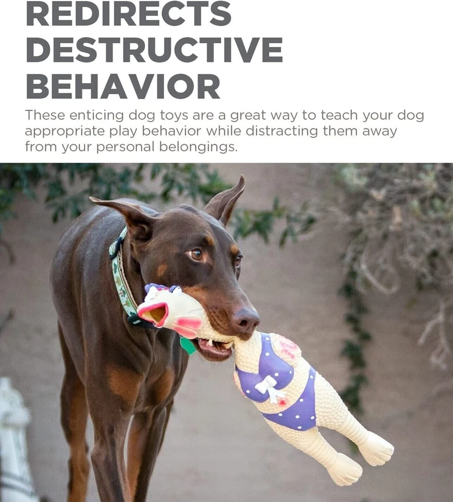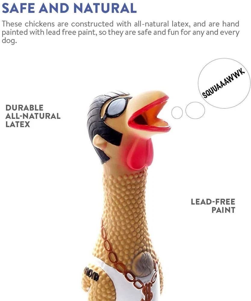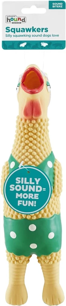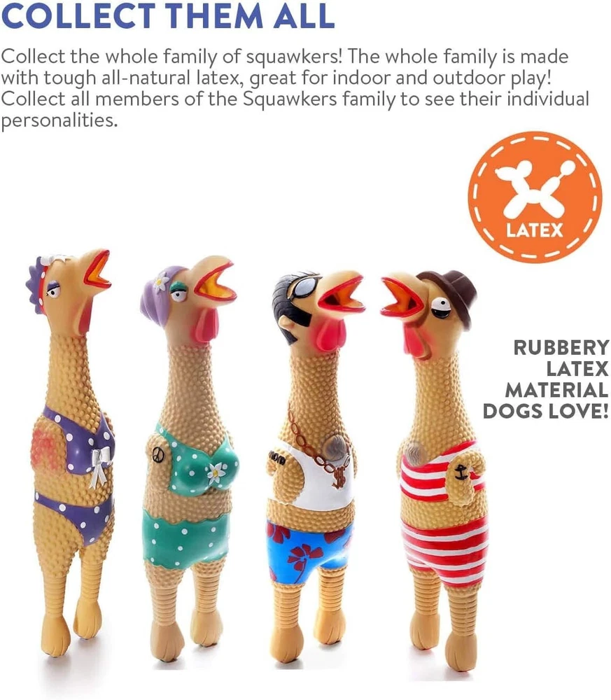 Approximate Size 12x3 This listing is for Grandma Hippie Chick other images shown for illustration purposes only. SILLY SQUAWKING DOG TOY: Squawkers latex rubber dog toys are a collection of funny chicken characters that come with an irresistible squawking squeaker your dog will love! Holiday edition Squawkers make a great gift for the furry friend in your life! REDIRECTS DESTRUCTIVE BEHAVIOR: These enticing dog toys are a great way to teach your dog appropriate play behavior while distracting them away from your personal belongings. MADE WITH SAFE & NATURAL MATERIALS: These interactive dog toys are made of all-natural latex, and are hand painted with lead-free paint, so you can stay worry-free while your pup plays. PLAY IT SAFE: No toy is indestructible. Do not leave toys with unsupervised pets. Remove and replace toy if damaged.