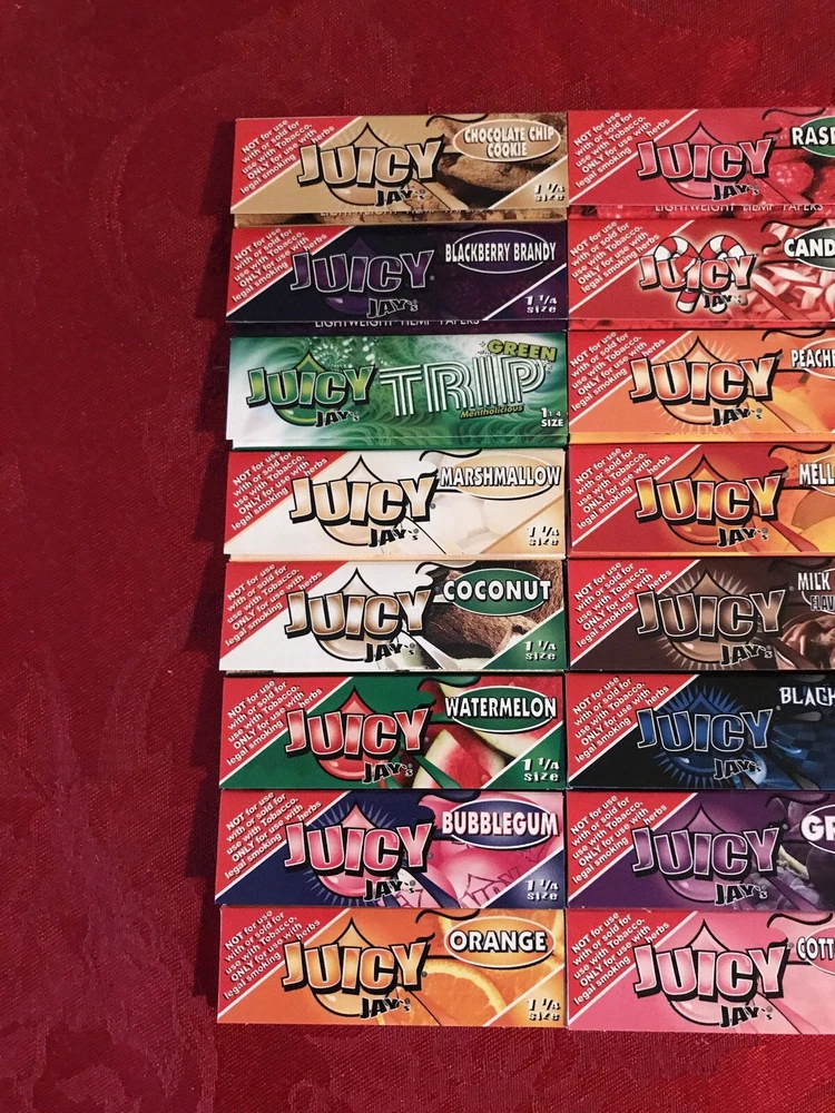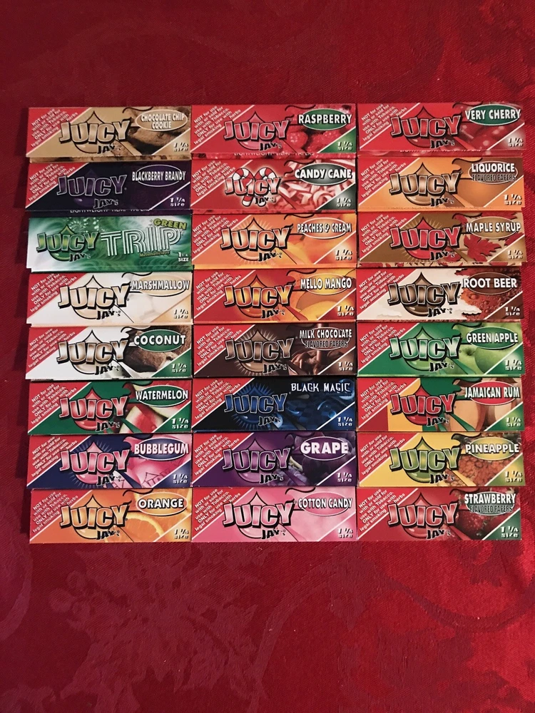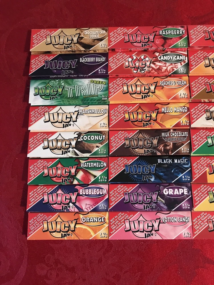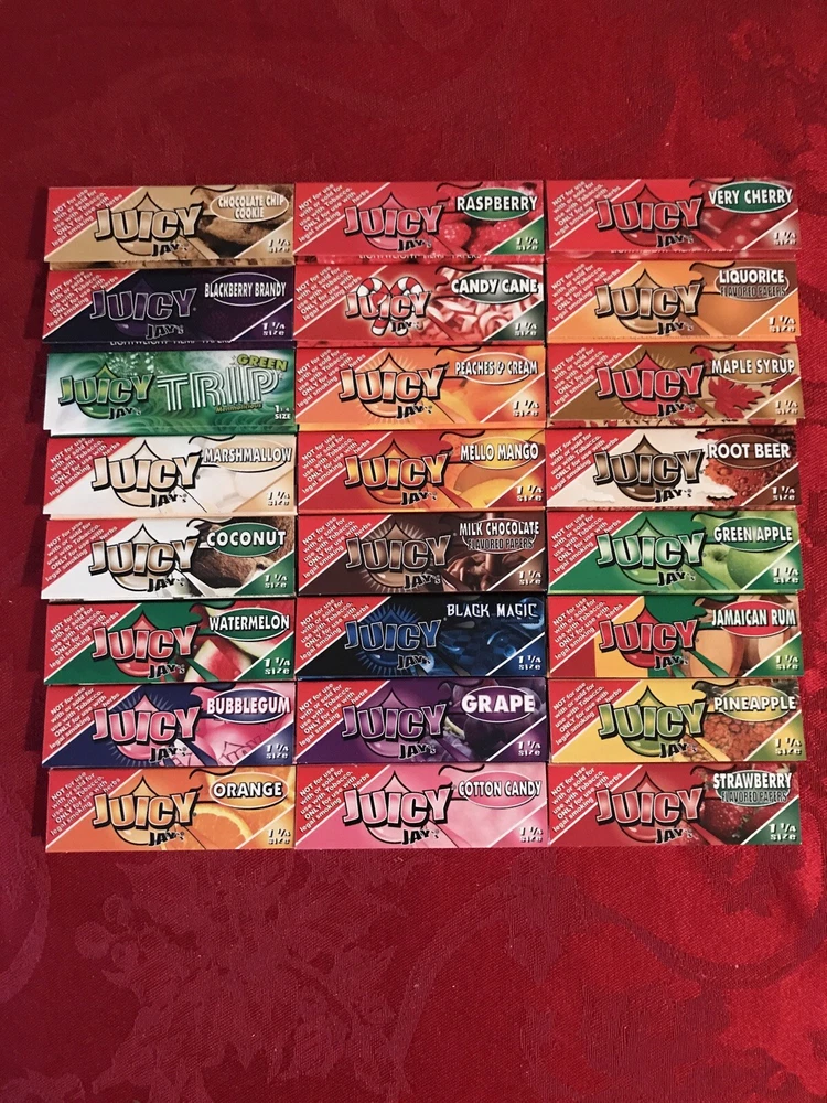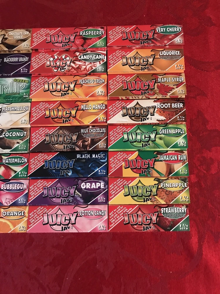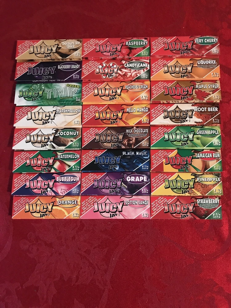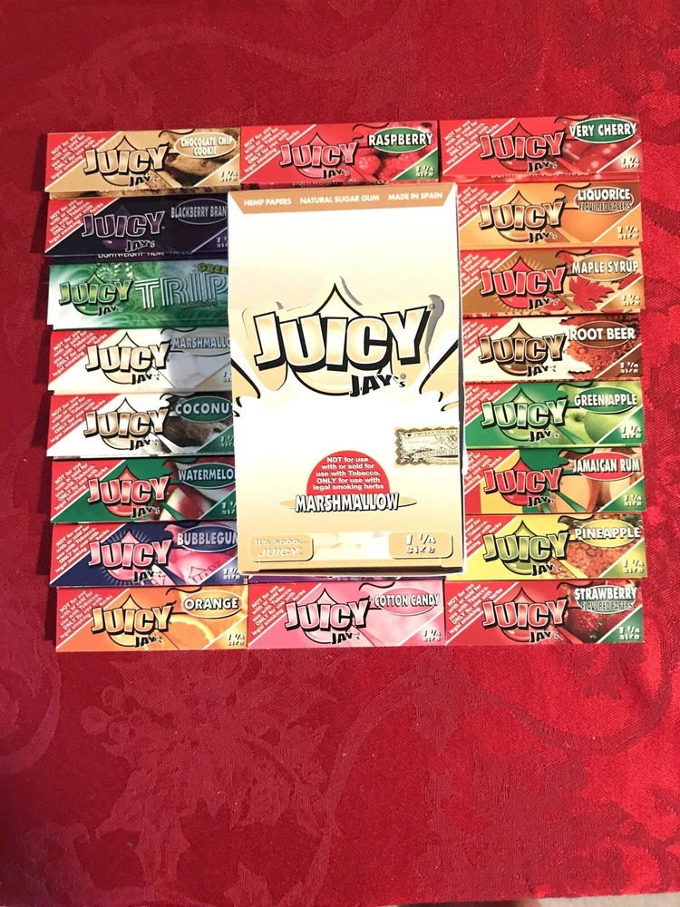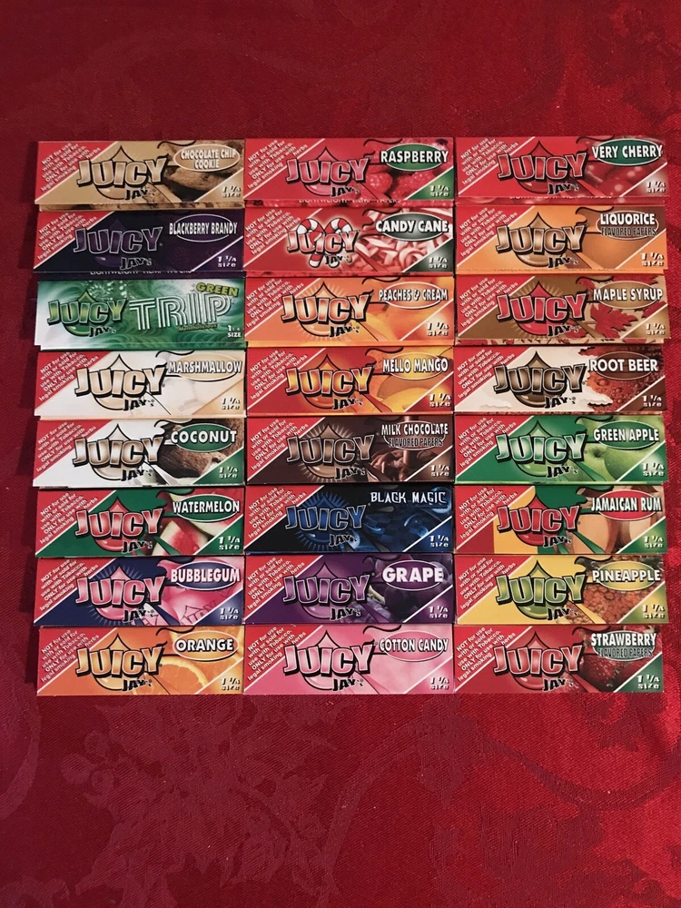 HELLO MY GOOD FRIENDS YOU WILL RECEIVE (10) PACKS OF JUICY JAY'S 1 1/4 SIZE FRESH FLAVORED HEMP CIGARETTE ROLLING PAPERS ALL FLAVORS AVAILABLE!!! JUST SPECIFY IN YOUR SPECIAL CUSTOM ORDER WHAT FLAVOR OR FLAVORS YOU WISH TO CHOSE AND ADD THEM TO YOUR ORDER JUST EMAIL ME!!! THE FLAVORS AND QUALITY MAKE JUICY JAY'S THE MAIN CHOICE FOR MANY SMART CONSUMERS INCLUDING MYSELF FOR A VERY ENJOYABLE AND SMOOTH SMOKE PERIOD!!! YOU SURE CAN TELL THE DIFFERENCE THAT JUICY JAY’S IS MADE OF A SUPERIOR QUALITY AND IS ONE FINE PRODUCT!!! AWESOME SIZE OF 1 1/4 MADE IN ALCOY SPAIN ORIGINALS WITH ALL FLAVORS AVAILABLE (32) EXTRA LIGHTWEIGHT LEAVES PER PACK!!! MY FRIENDS ENJOY THE TRIPLE DRIP FLAVOR SYSTEM JUST LIKE I DO!!! I LOVE IT SUCH A GREAT SMOKE TO ENJOY!!! PLEASE DO CHECK OUT ALL MY OTHER AWESOME FRESH JUICY JAY Flavored Cigarette Rolling Papers!!! PLUS MANY OTHER NEW FINE NAME BRANDS THAT I DO HAVE IN STOCK NOW and I am listing them ALL here so please just COMMUNICATE and EMAIL ME to let me know what you need no worries at ALL EMAIL ME ANYTIME!!! THANKS FOR LOOKING AT MY LISTINGS WITH MORE TO COME MY FRIENDS!!! I WOULD LOVE TO HAVE YOU ALL AS MY REPEAT CUSTOMERS AND I REALLY APPRECIATE YOUR BUSINESS!!! Thanks 🙏🏻 RJFJR*