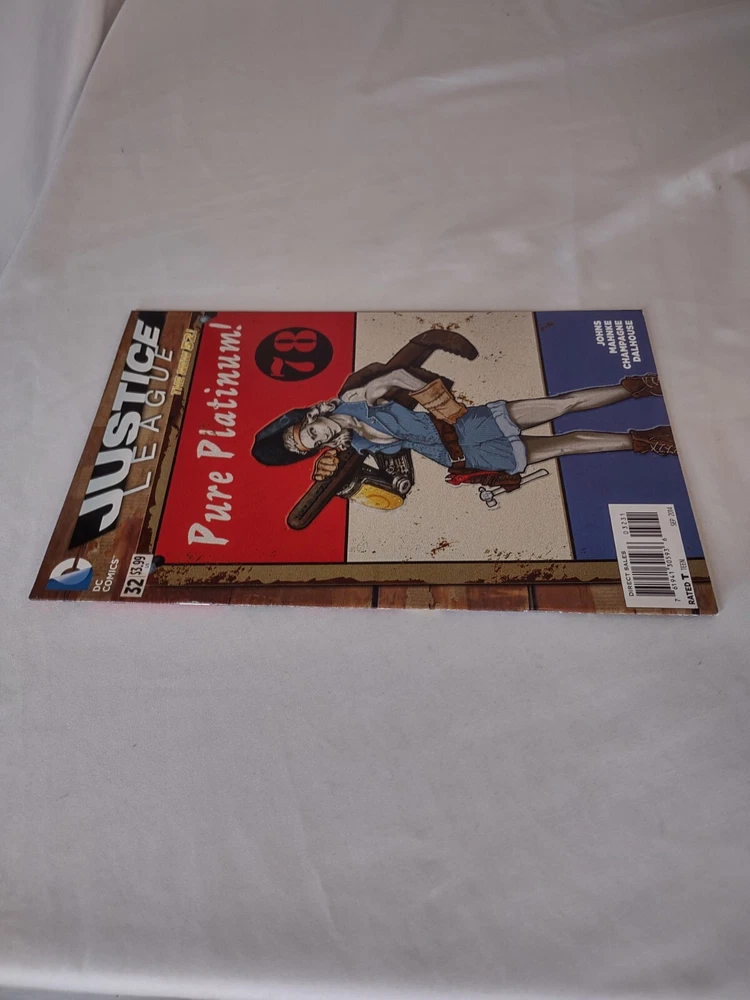 This is a single issue comic book of Justice League #32 with a Jim Fletcher Bombshell Variant Cover. It features the superhero team of Justice League of America from DC Universe and is part of the Modern Age (1992-Now) era. The comic book is written in English language and is intended for a general audience. The comic book is a collectible item and is perfect for fans of superheroes and DC Universe. It is a part of the New 52 series by DC Comics and is a great addition to any comic book collection. The comic book is not personalized, inscribed, or signed.