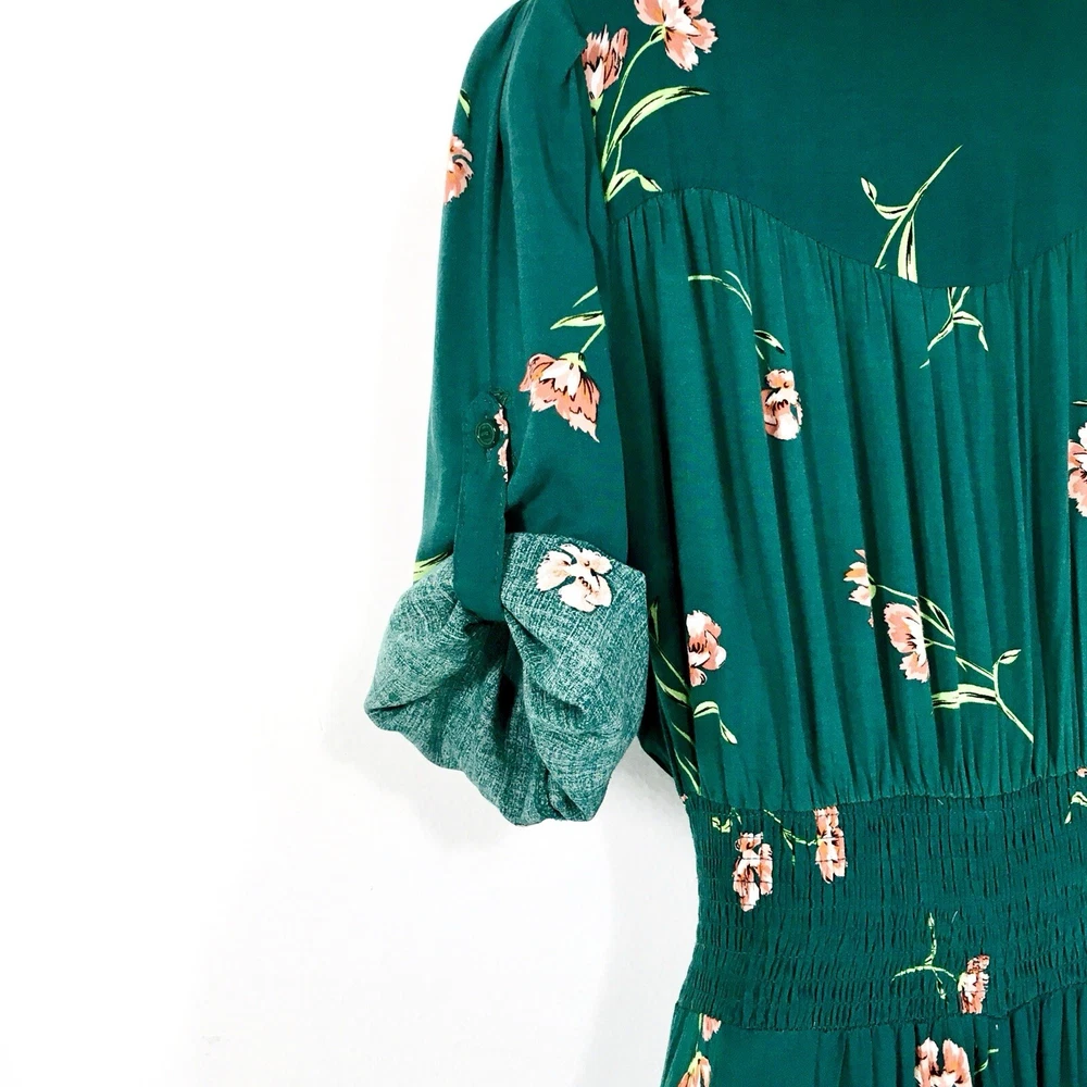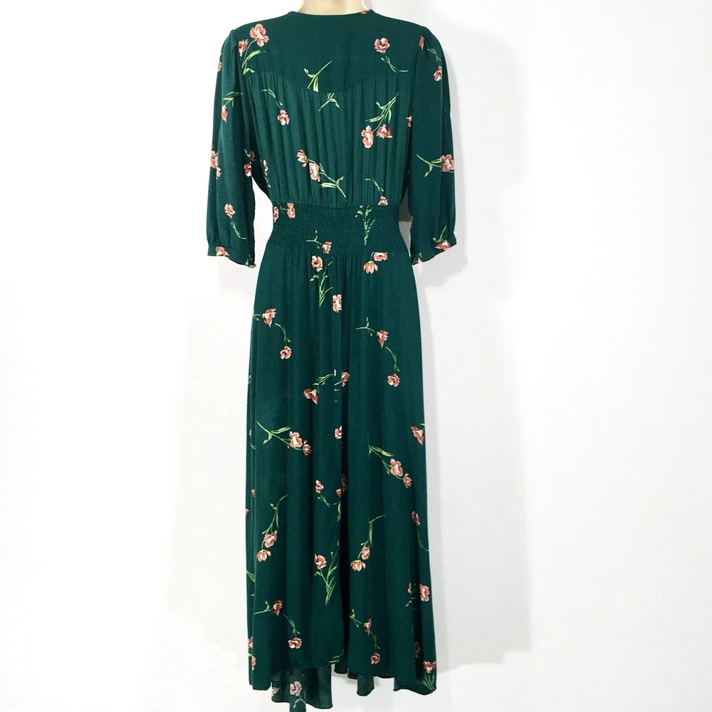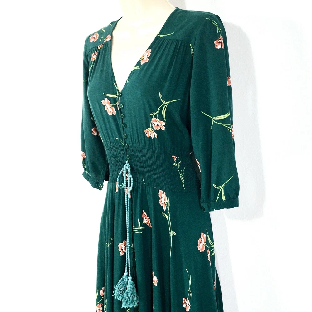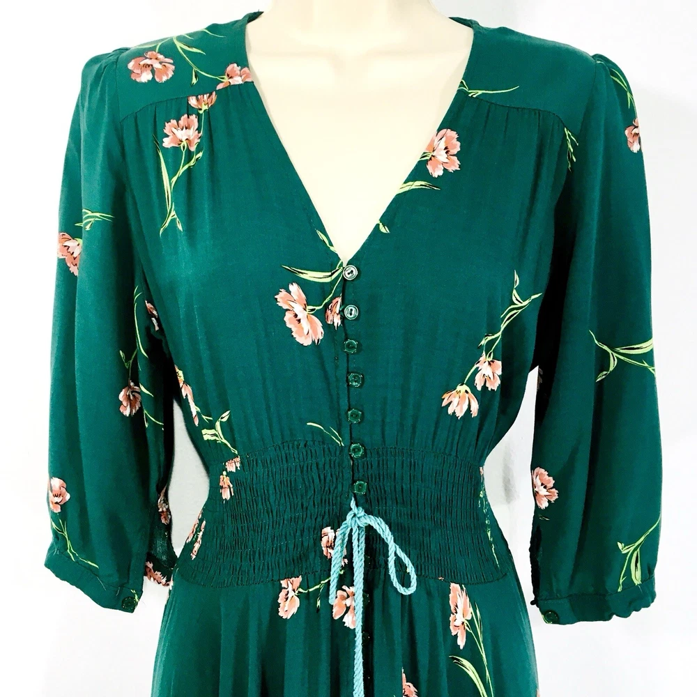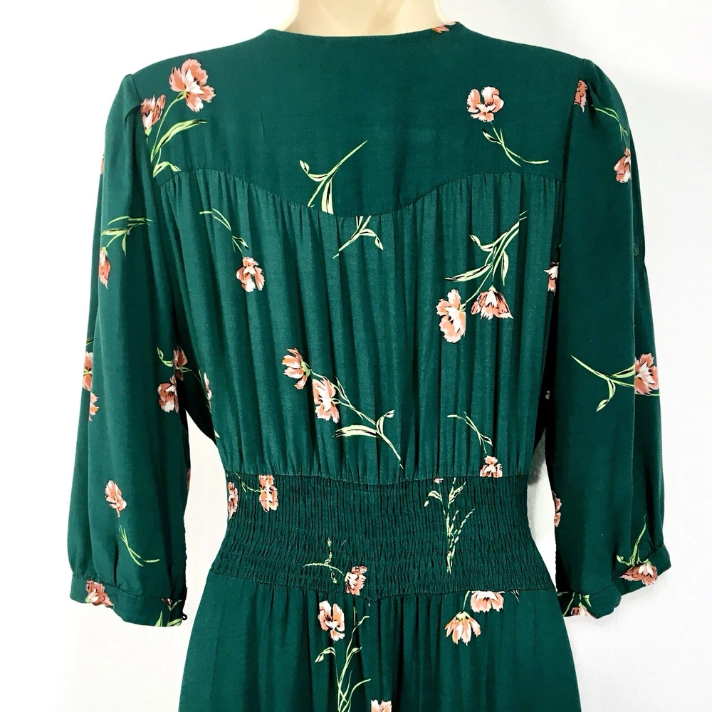 Dark Green Jaase Dress Sz L Button Front 3/4 Sleeve Smocked Stretchy Waistband Approx Flat Measurements- Bust: 21” No Stretch Waist: 14”-17” Stretchy Length: 56”