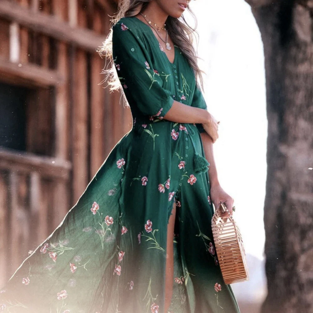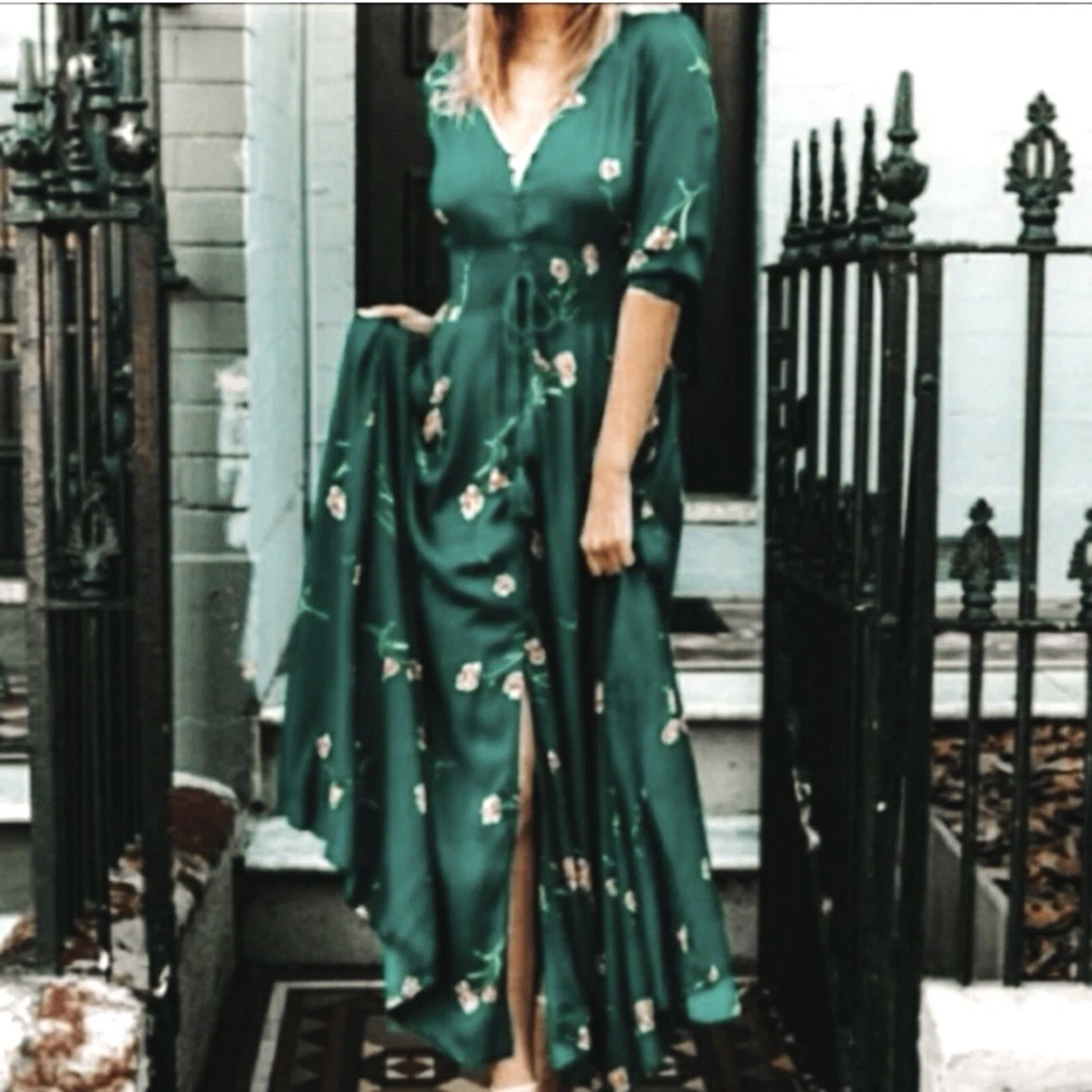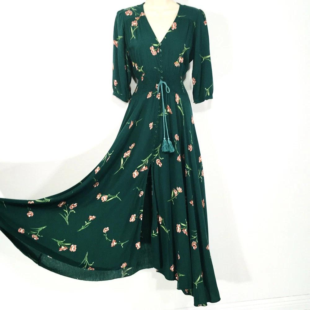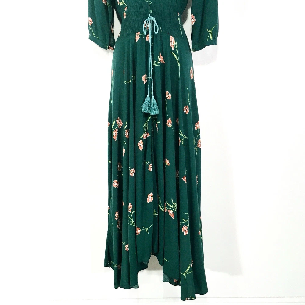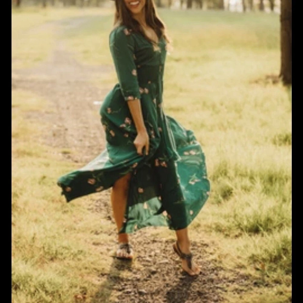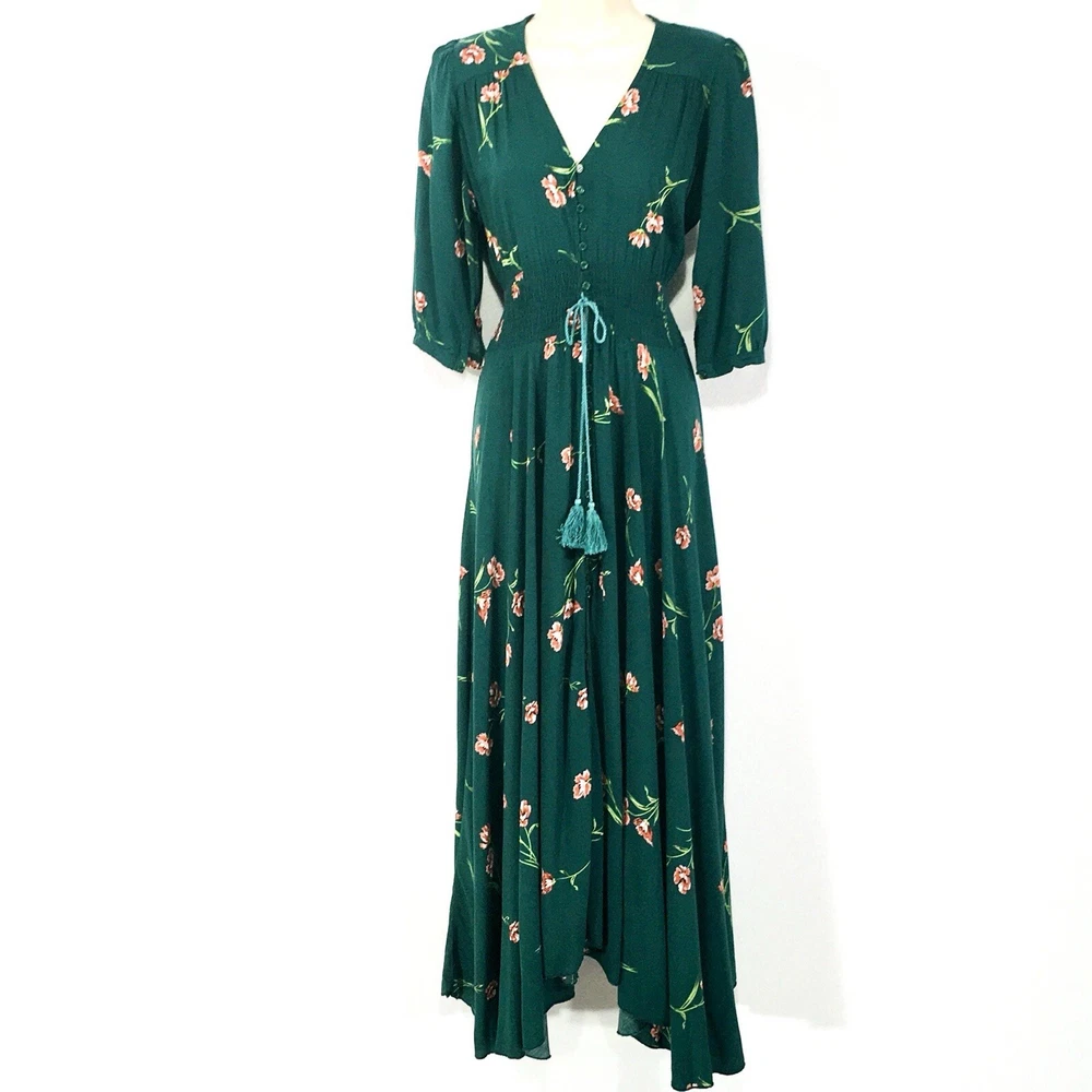 Dark Green Jaase Dress Sz L Button Front 3/4 Sleeve Smocked Stretchy Waistband Approx Flat Measurements- Bust: 21” No Stretch Waist: 14”-17” Stretchy Length: 56”