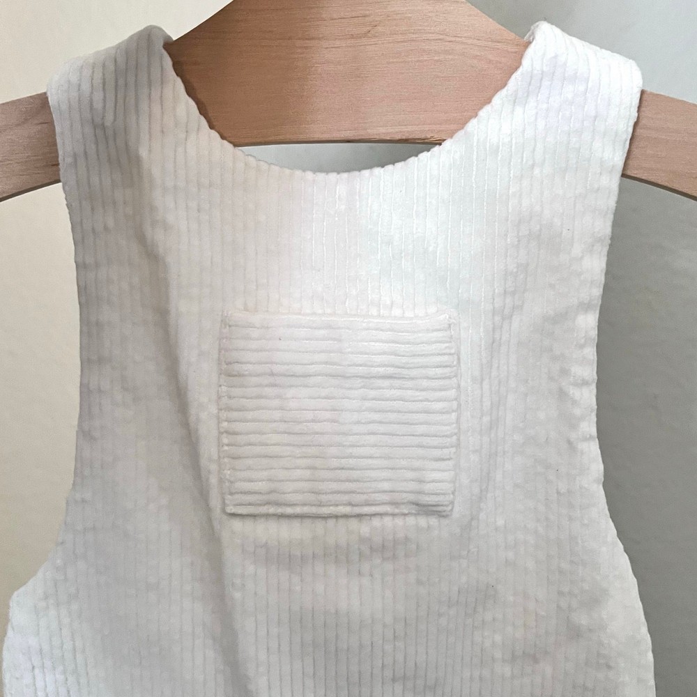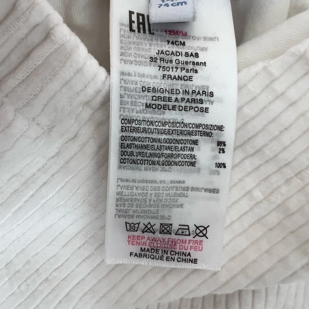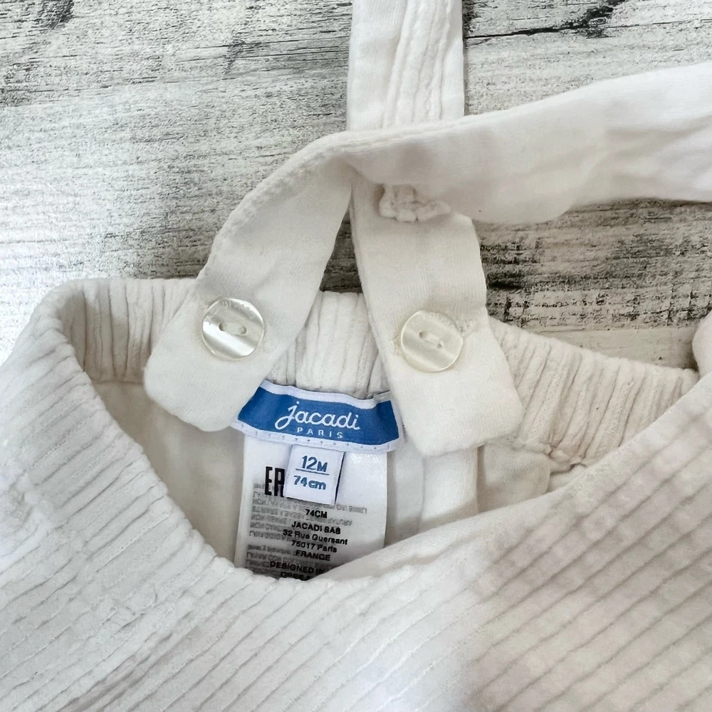Timeless and refined, these Jacadi baby boys’ overalls are crafted from soft white cotton corduroy with a fully lined interior for comfort. Designed in Parisian style with cross-back straps, a front pocket, and discreet snap closures for easy changing. Perfect for family photos, special occasions, or everyday elegance. Styling suggestions: Pair with a button-down shirt for a classic dressed-up look, layer over a bodysuit for everyday wear, or add a cardigan and booties for a timeless photo-ready outfit. • Brand: Jacadi • Size: 12 Months • Color: White • Material: 100% Cotton Corduroy, Fully Lined • Style: Overalls / One Piece • Features: Front pocket, cross-back straps, lined interior, snap crotch, button straps • Neckline: Round • Sleeve: Sleeveless • Closure: Snap crotch, button straps • Fit: Regular • Pattern: Solid • Occasion: Dressy, Family Photos, Special Occasion, Everyday • Season: Fall, Winter, Spring • Condition: Excellent used condition — no flaws • Style aesthetics: classic, timeless, French, elegant, minimal, chic, dressy, modern Ships from the USA. No customs delays, no surprise import fees. Clean, smoke-free, pet friendly home. Bundle to save!