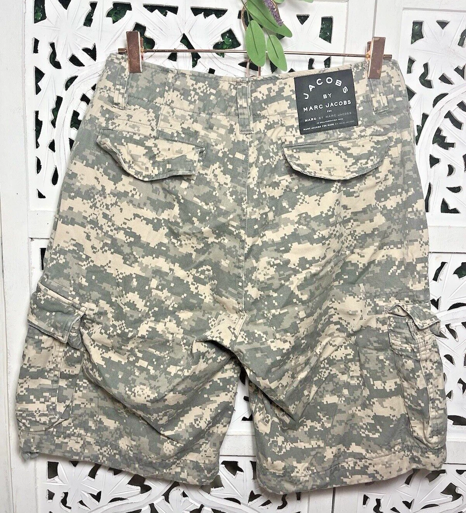 Jacobs by Marc Jacobs Men’s Camo Utility Military Cargo Cotton Shorts Size 27-31. Great Pre-loved condition. Approximate measurement laying flag waist 16 rise 13 hips 22.5 inseam 10.5 length 23.5
