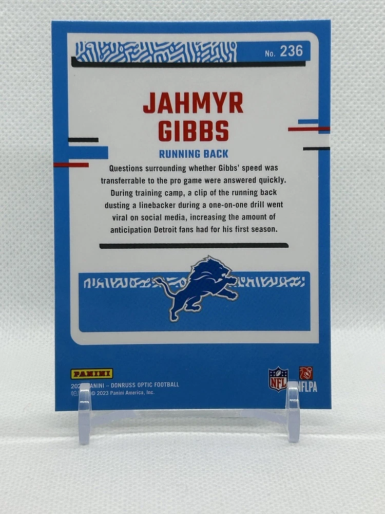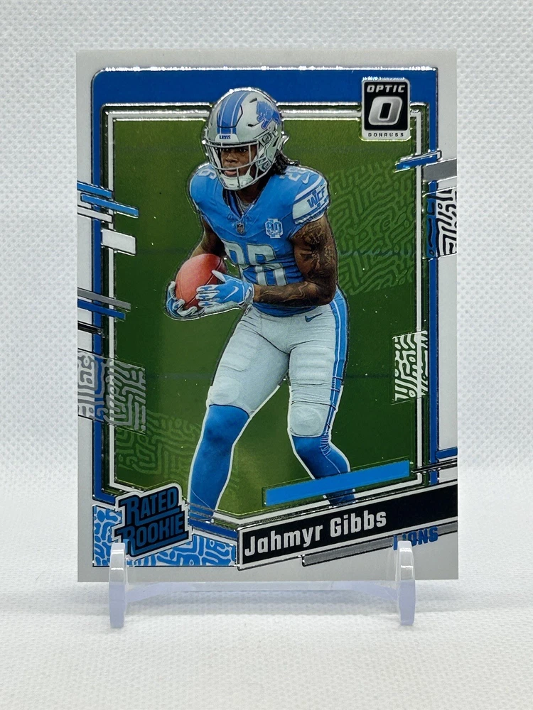 This Jahmyr Gibbs Rated Rookie card is a must-have for any fan of the Detroit Lions or National Football League (NFL). The 2023 Panini Donruss Optic card features the young player in stunning detail, printed on high-quality 35 Pt. card stock. As a Rated Rookie, it's a great addition to any collection and a chance to invest in a player who could have a bright future in the sport. The card is an original and licensed reprint, with English language and autograph authentication by Donruss. It's part of the base set and features the rookie's name and number, as well as a few important aspects like the sport, team, and season. This card is perfect for enthusiasts and collectors alike, and a great way to show your support for the Lions.