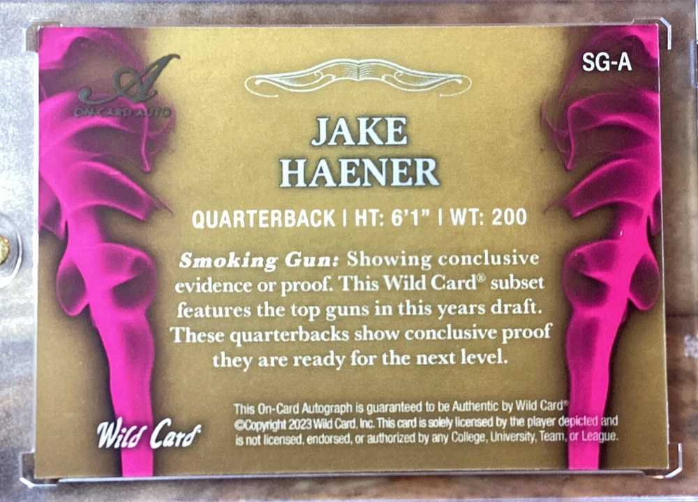 This rare Jake Haener autographed trading card is a must-have for any serious football fan. With a print run of only 5, this Smoking Guns parallel variety card is an original and licensed reprint from the 2022 Wild Card set. The card features the rookie quarterback in his New Orleans Saints and Washington Commanders uniforms and is made of high-quality paperboard, card stock, and paper. At 35 Pt. thickness, this sports trading card is a standard size and is in English language. It was manufactured in the United States by Wild Card in 2023 and is part of the National Collegiate Athletic Association (NCAA) and National Football League (NFL) leagues. Don't miss your chance to own this unique piece of football memorabilia.