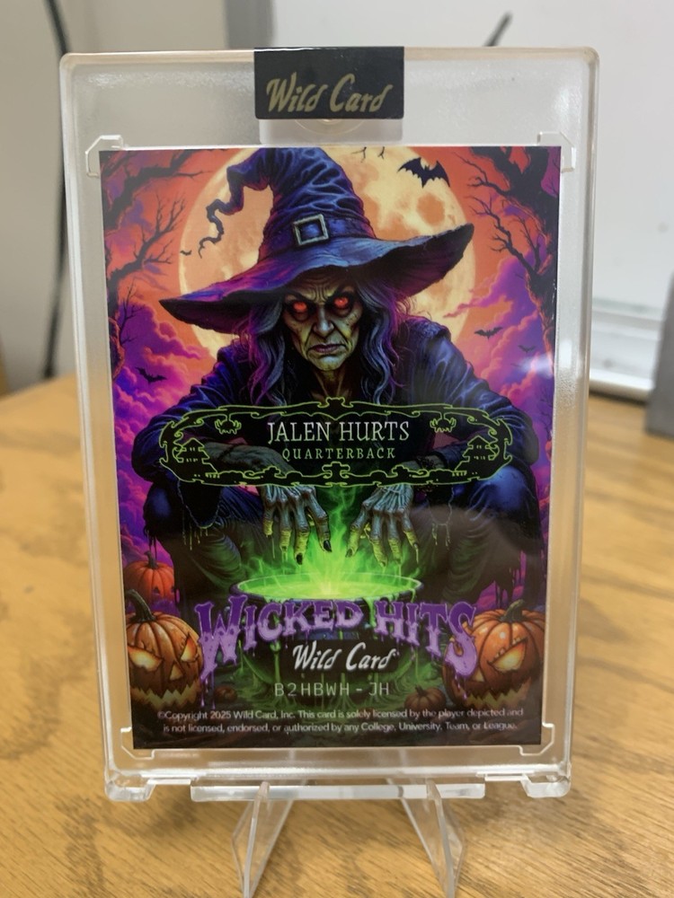 Jalen hurts 1/1 from wild cards haunted hits on the wicked hit parallel and cross hatch shimmer