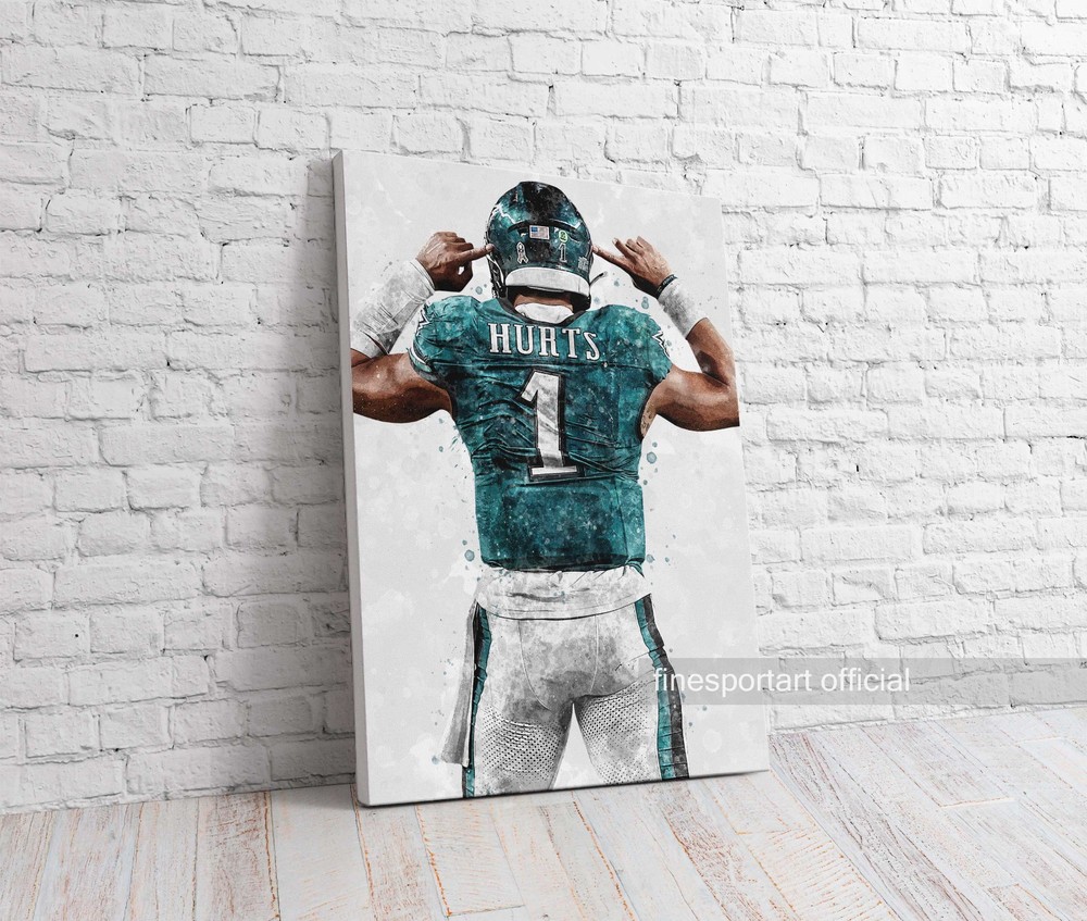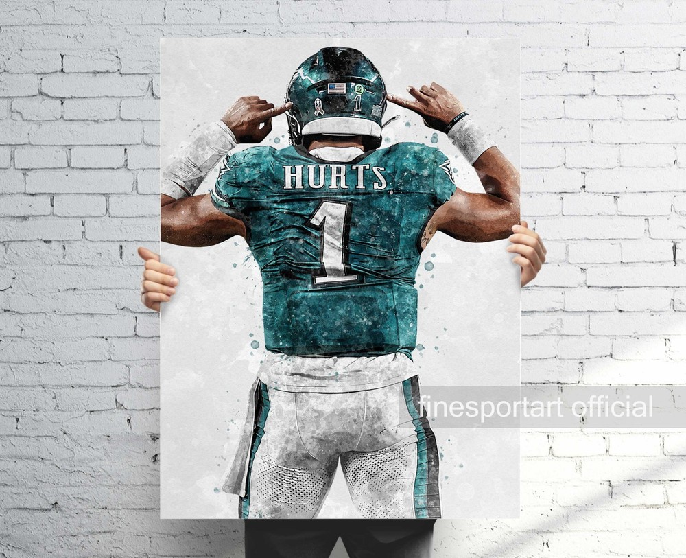 Jalen Hurts poster in Philadelphia Eagles uniform? Yes! We have the best selection of sports posters, canvas prints and wall art for sale. This print will be a great gift for any football fan. QUALITY : *Premium Posters - Museum-quality poster made on thick and long-lasting matte paper. - Paper weight: 200 gsm / 80 lb - Professionally Printed on Epson EP Premium. - Shipped in sturdy packaging protecting the poster. *Canvas Stretched - Cotton canvas composite with a special proprietary coating. - Inner frame made with radial pine sourced from renewable forests. - Soft rubber dots on bottom back corners for support. - High image quality and detail. - Back hanging included. SHIPPING INFORMATION: - FREE SHIPPING on all prints. ✉️Please contact me if you have any questions! DISCLAIMER: "My sports prints are created with my own artistic interpretations using a graphic editor. Any brand names, logo or trademarks used herein remain the property of their respective owners. The listing of any company, drawing, quote and/or their logos is not intended to imply any endorsement or direct affiliation with said company."