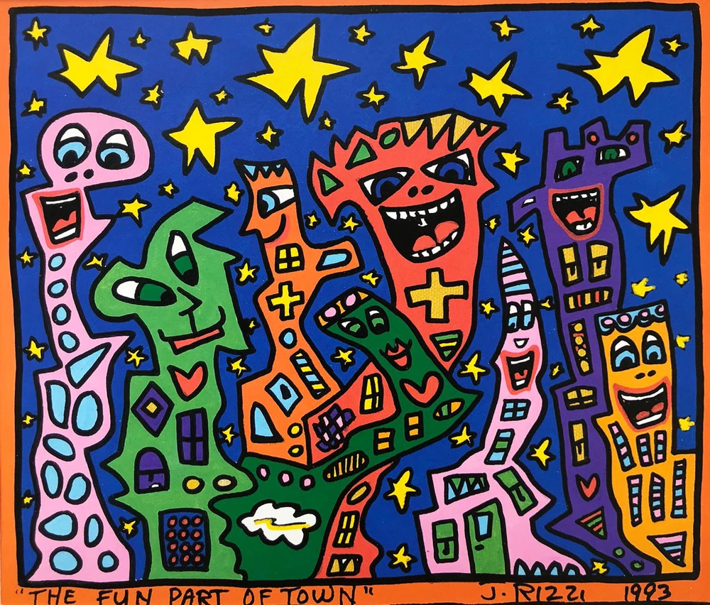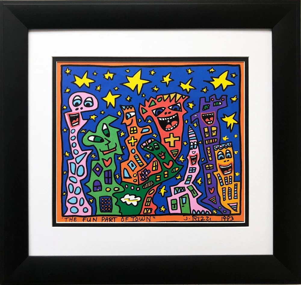 James Rizzi's "The Fun Part of Town" This print is: It is NEWLY CUSTOM FRAMED in a Great Black Wood Frame Double Matted in Black and White Plate Signed Art Print Outside Frame Dimensions measures approx: 16.5" x 15" Image Size measures approx: 10.5" x 9.5" FRAMING ALONE IS WORTH OVER $150! JAMES RIZZI (1950-2011) American pop artist born and raised in Brooklyn, New York. He is most famous for his 3- Dimensional Artwork especially the large elaborate prints and teeming anthropomorphic cityscapes. His delight in delirious detail and elaborate minutiae create a true and unique art brand.