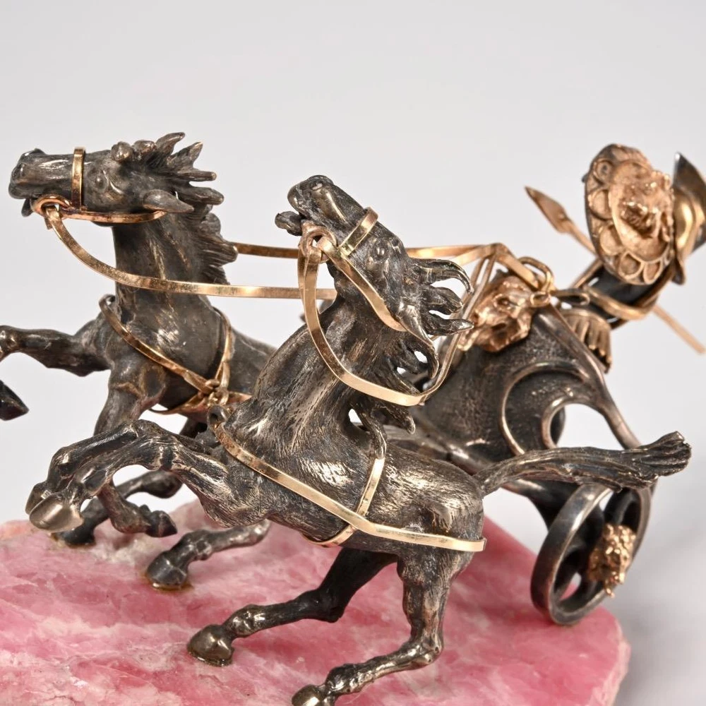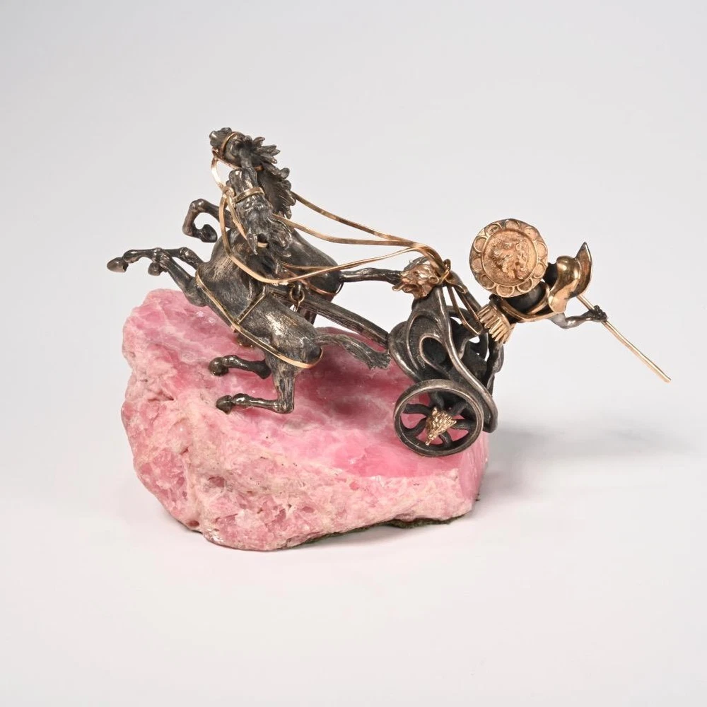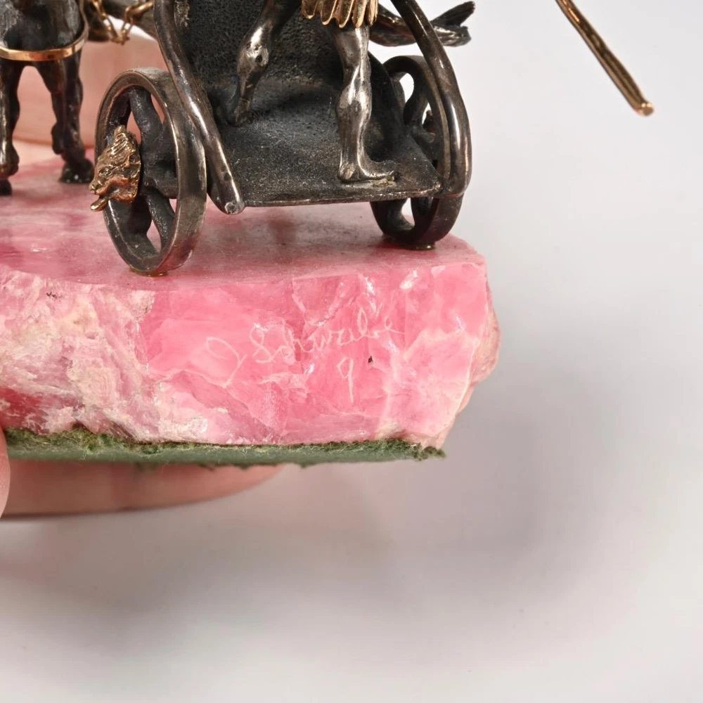 A beautiful gold and silver Achilles on Chariot sculpture handcrafted with precious stones and metals by famed jeweler, James Schwabe. Helmet marked 14k, plus gold-plated silver accents. Emerald eyes, mounted on pink quartz stone base. Measures approx 3.75"h, 3.75"w. Total weight approx 1lb, 5.5oz(610g). Signed J Schwabe. A beautiful gold and silver Achilles on Chariot sculpture handcrafted with precious stones and metals by famed jeweler, James Schwabe. Helmet marked 14k, plus gold-plated silver accents. Emerald eyes, mounted on pink quartz stone base. Measures approx 3.75"h, 3.75"w. Total weight approx 1lb, 5.5oz(610g). Signed J Schwabe. Visit our store to see our complete selection of offerings from several categories including antiques, jewelry & handbags, sterling silver, porcelain, and more. We will combine shipping whenever possible. Also, add us to your favorites by clicking the "Sign up" button in the lower left-hand corner of our store page to receive the latest news from White Room Auctions, including special promotions and new offerings. All International shipments are declared for the full value. Customs and import taxes are paid by the recipient. Returns are accepted only if items are damaged in shipping or not as described. There may be a restocking fee for returns. Images sell! Get Supersized Images & Free Image Hosting Attention Sellers - Get Templates Image Hosting, Scheduling at Auctiva.com. Track Page Views With Auctiva's Counter