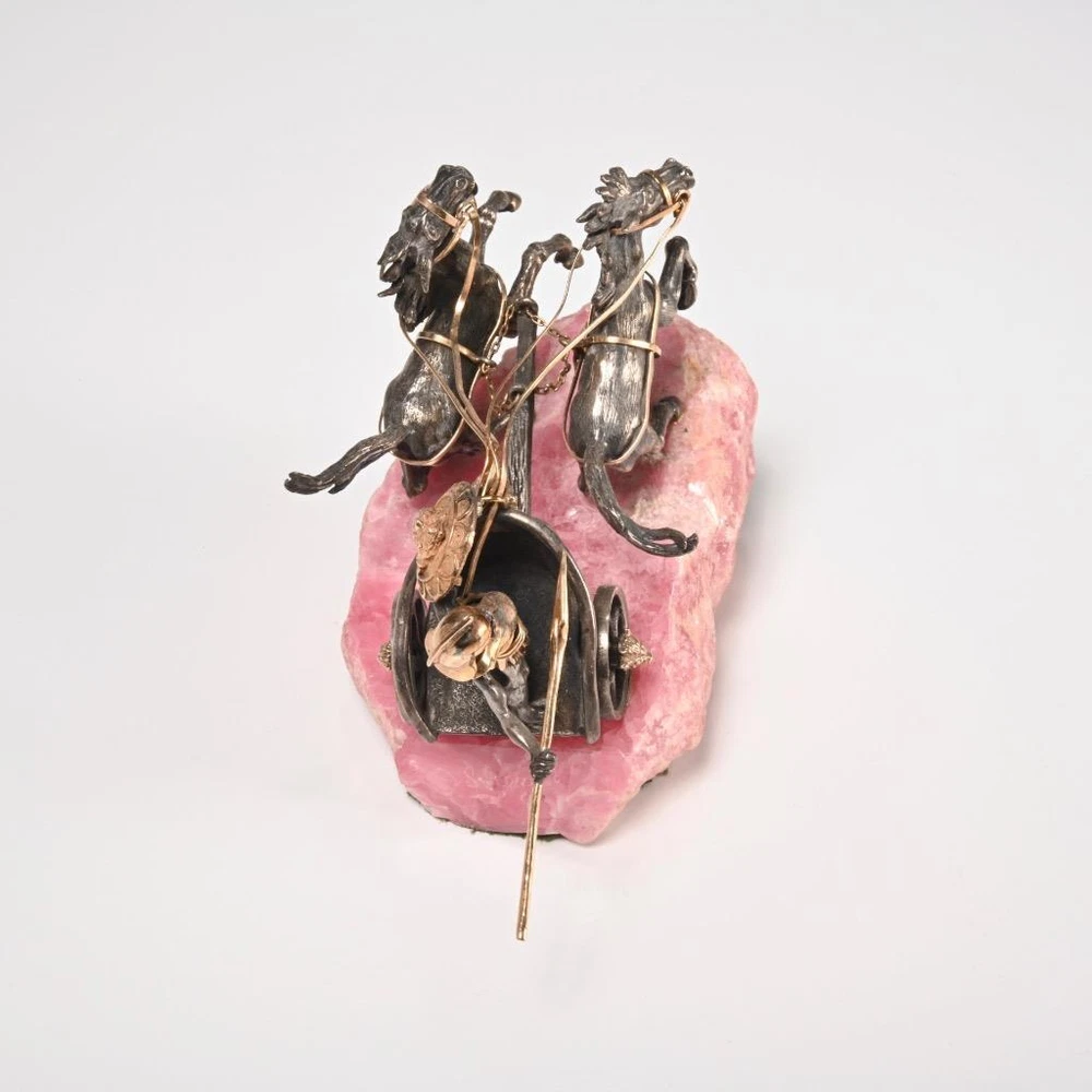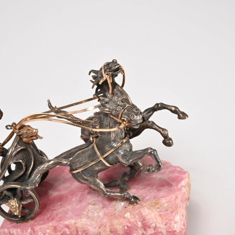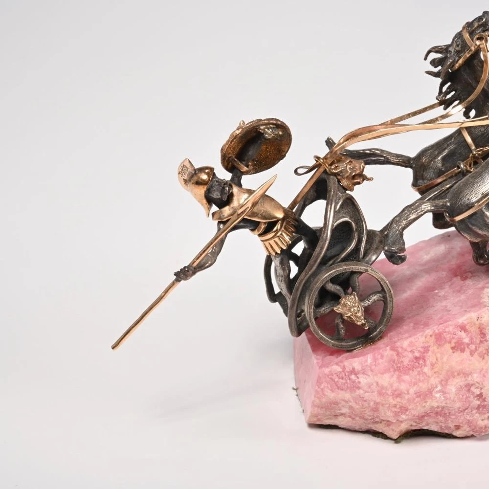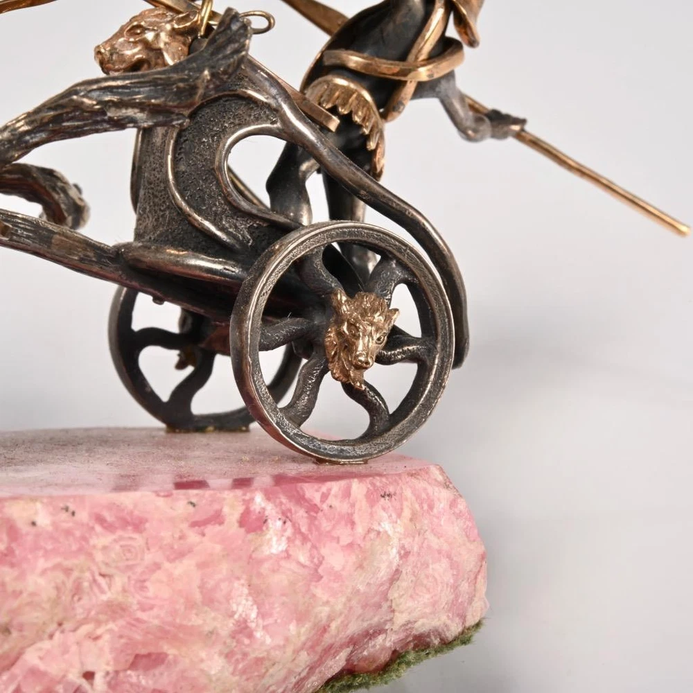 A beautiful gold and silver Achilles on Chariot sculpture handcrafted with precious stones and metals by famed jeweler, James Schwabe. Helmet marked 14k, plus gold-plated silver accents. Emerald eyes, mounted on pink quartz stone base. Measures approx 3.75"h, 3.75"w. Total weight approx 1lb, 5.5oz(610g). Signed J Schwabe. A beautiful gold and silver Achilles on Chariot sculpture handcrafted with precious stones and metals by famed jeweler, James Schwabe. Helmet marked 14k, plus gold-plated silver accents. Emerald eyes, mounted on pink quartz stone base. Measures approx 3.75"h, 3.75"w. Total weight approx 1lb, 5.5oz(610g). Signed J Schwabe. Visit our store to see our complete selection of offerings from several categories including antiques, jewelry & handbags, sterling silver, porcelain, and more. We will combine shipping whenever possible. Also, add us to your favorites by clicking the "Sign up" button in the lower left-hand corner of our store page to receive the latest news from White Room Auctions, including special promotions and new offerings. All International shipments are declared for the full value. Customs and import taxes are paid by the recipient. Returns are accepted only if items are damaged in shipping or not as described. There may be a restocking fee for returns. Images sell! Get Supersized Images & Free Image Hosting Attention Sellers - Get Templates Image Hosting, Scheduling at Auctiva.com. Track Page Views With Auctiva's Counter