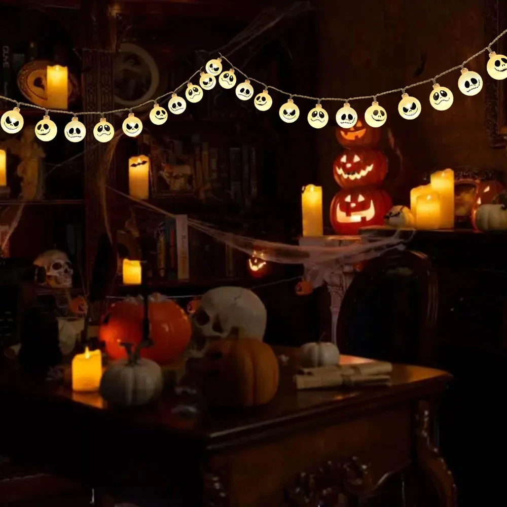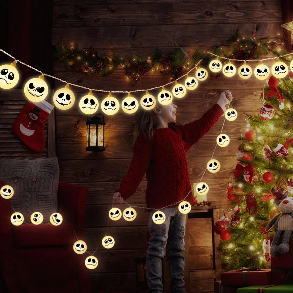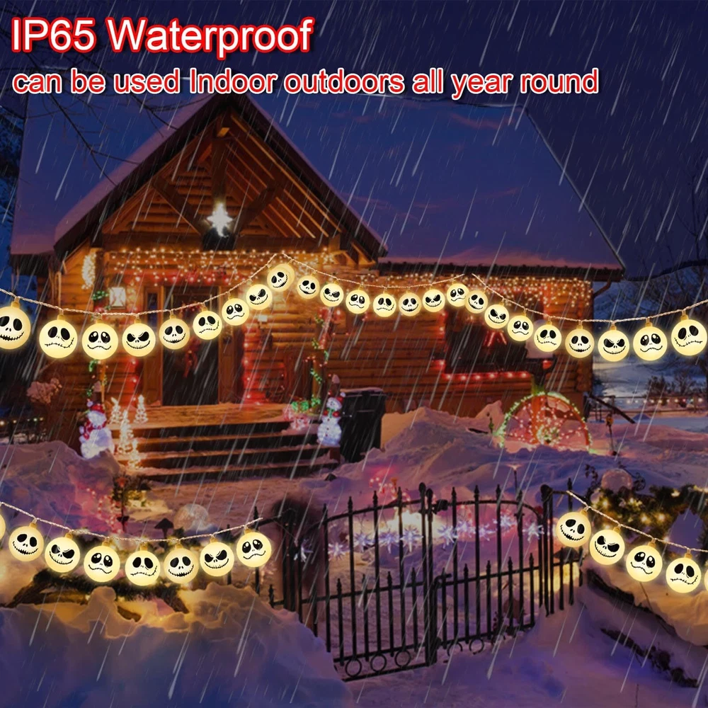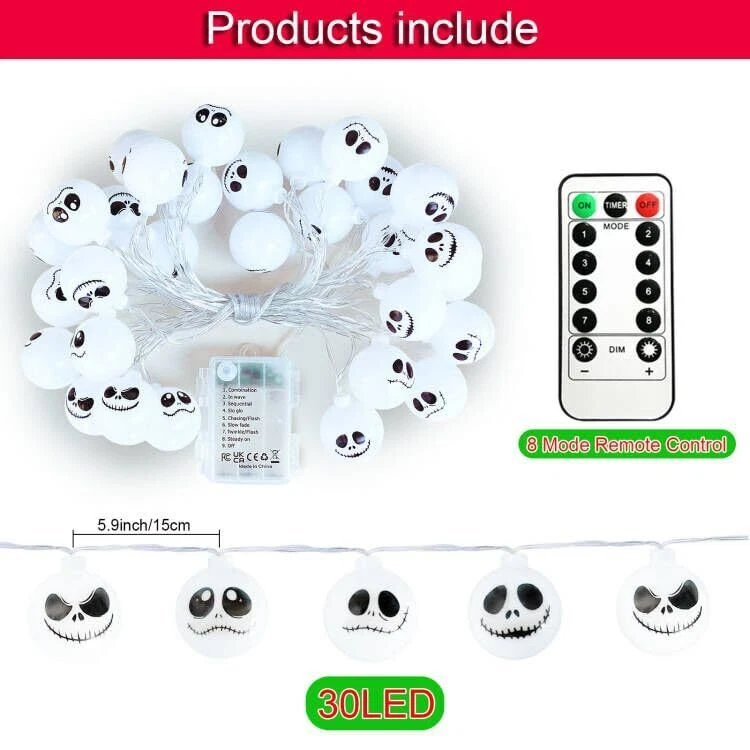 Janchs 30 LED Battery Operated Christmas Lights for Nightmare Before Christmas Decorations, Battery Outdoor Lights for Indoor Outdoor Decorations Home, Bedroom, Patio, Balcony,Christmas Party 【Rich Function】:battery powered, warm white, with Remote, 8 modes, shatterproof and waterproof, memory function, dimmable, timer. 【Unique Outdoor Halloween Decorations】The lights display four different faces for a truly fun and unique christmas yard decoration. 【Outdoor String Lights】:battery operated hanging string lights with 30 bulbs, total length: 26ft,which is enough for wrapping around as your bedroom, living room, dining room, garland, wreath , gazebo, deck, balcony, umbrella. holiday christmas halloween tree or wherever you like to light up. 【Safe & Reliable LED String Lights】:the lights are cool to the touch (even after having them on for hours at 100%). 10 brightness adjustment levels and 8 lighting modes to choose. 【Easy to install 】:no socket is required, no matter how far you are, you can install the battery string lights wherever you want, and hanging wherever you want. 【IP65 waterproof】:Fully Weatherproof, regardless of heavy snow, hot sunny weather, This product is designed with four different faces. It will be the focal point of your spooky garden decor. 【Widely Use for Any Occasions】: great for xmas tree garland wreath garden patio Indoor outdoor christmas decorations. could be used for halloween, christmas or a outdoor party.