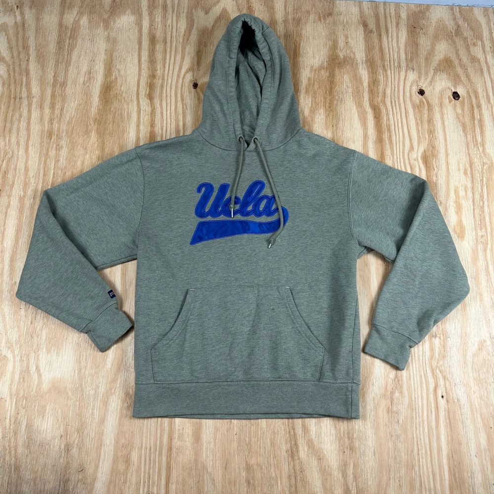 Show your support for the UCLA Bruins with this Jansport hoodie! Made from soft fleece material, this pullover sweater is perfect for basketball games during regular season. The gray color and embroidered team logo make it a stylish addition to any fan's wardrobe. This sweater is designed for men and comes in size small. It is made in Cambodia and is a great way to show your love for the UCLA Bruins. Get ready to cheer on your team in style with this Jansport hoodie! SKU: KG-14-158