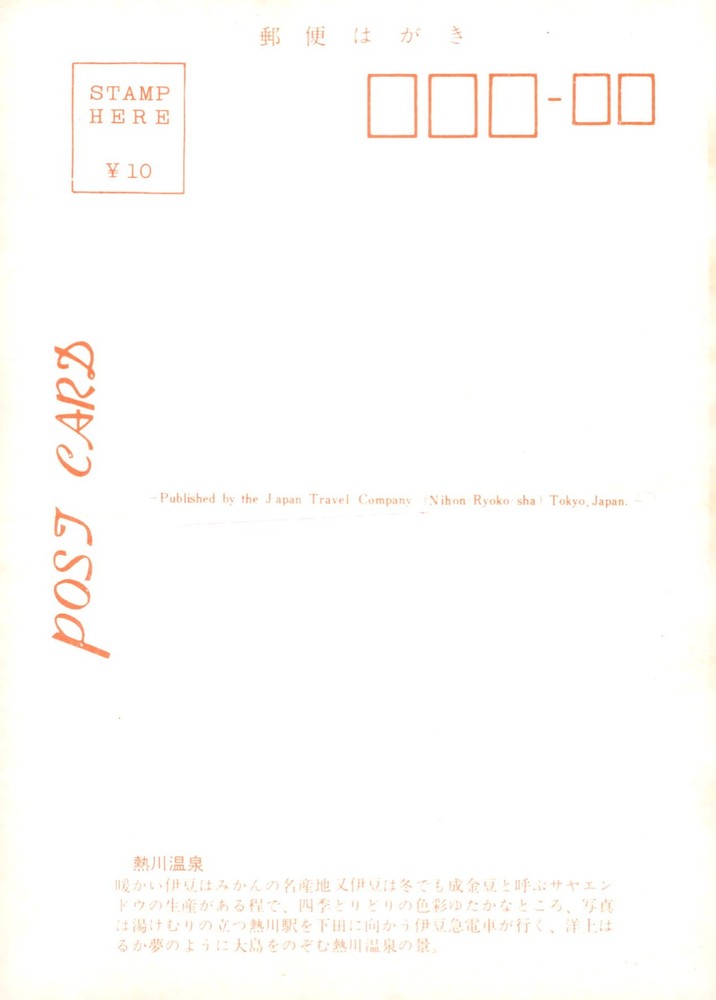 Vintage postcard published by the Japan Travel Company in Tokyo, featuring a stamp area for ¥10. The design includes a scenic view.