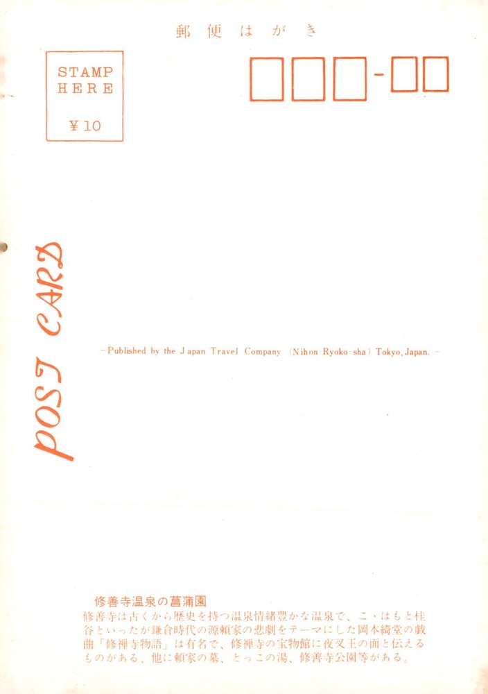 Vintage postcard featuring a stamp from the Japan Travel Company in Tokyo. Published by Nihon Ryoko-sha. Unique design with a cultural touch.