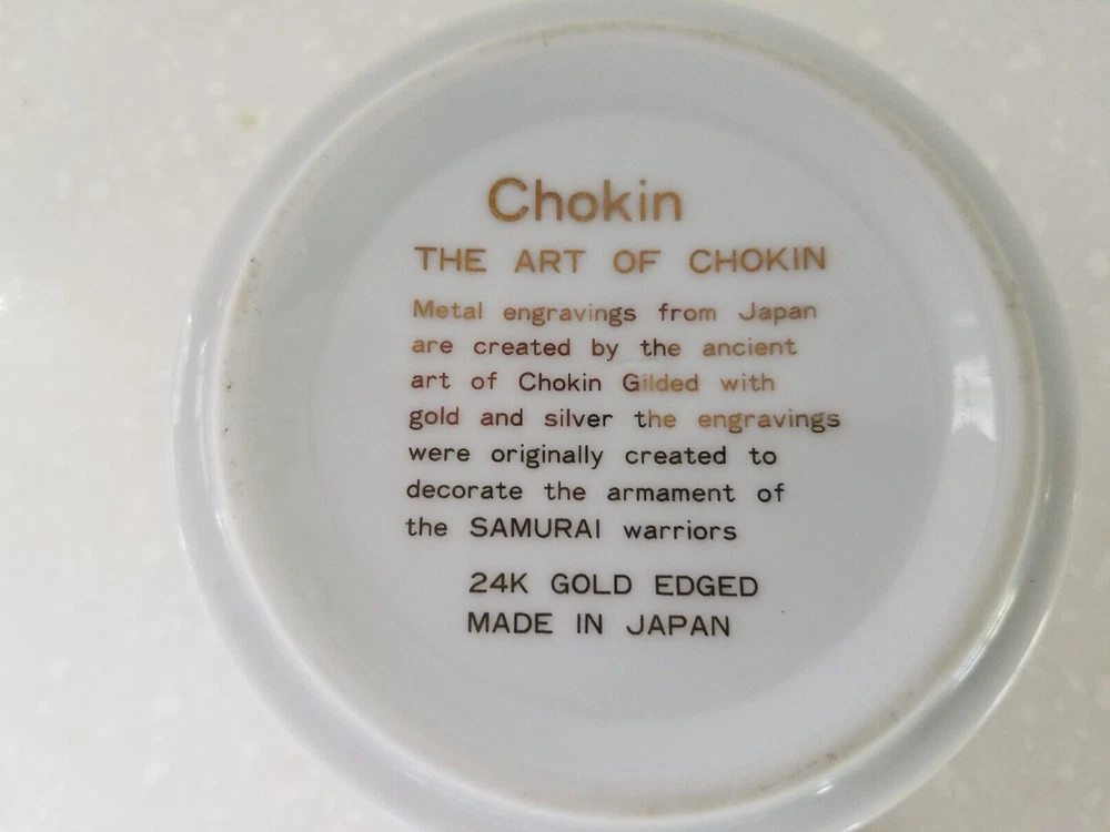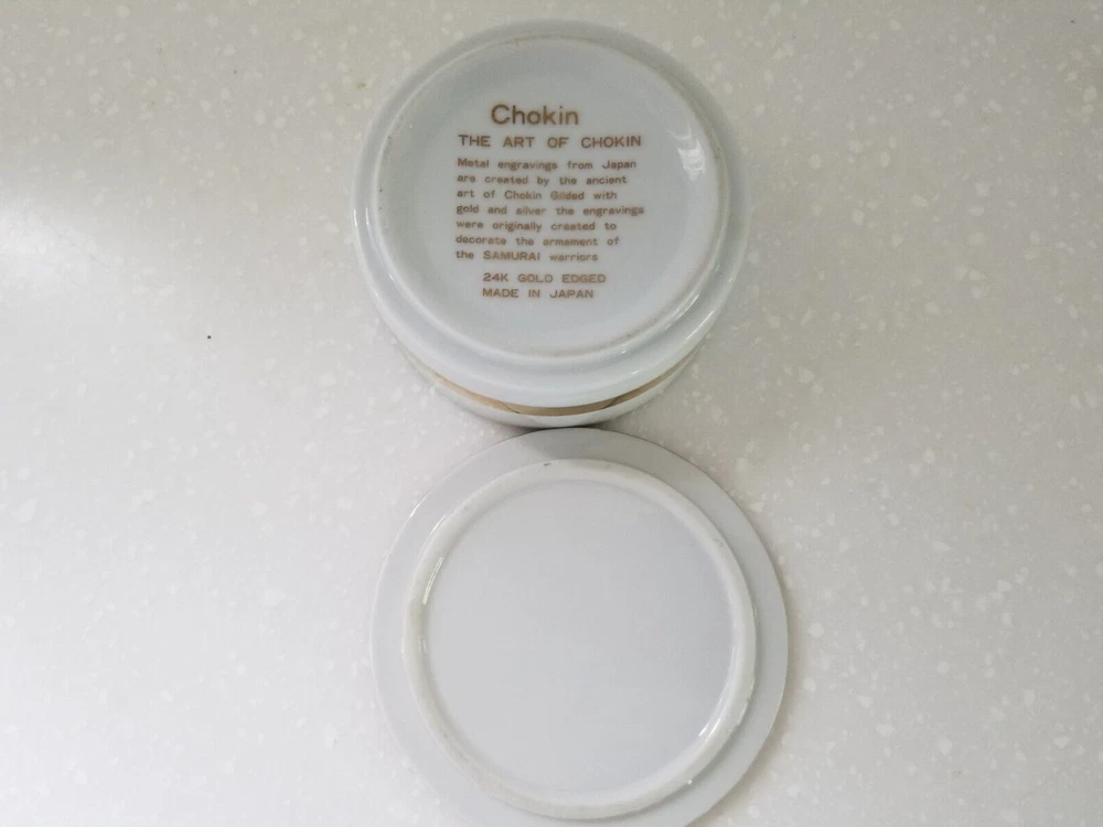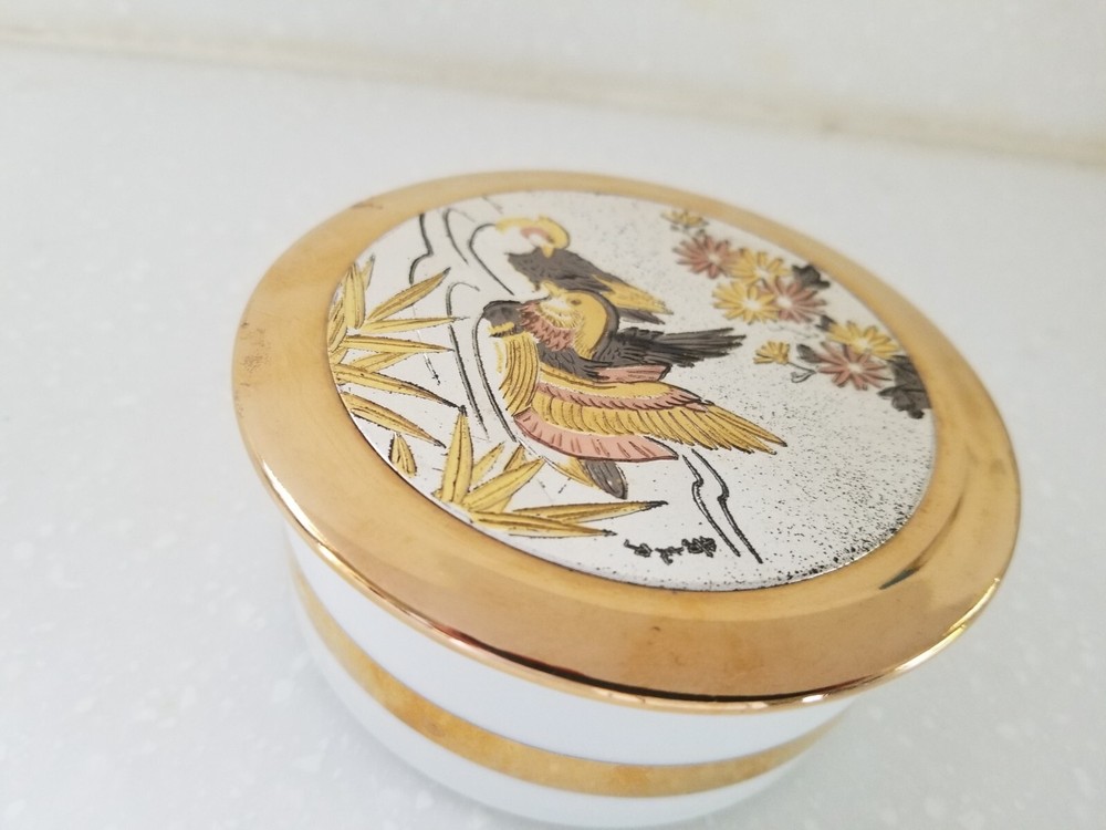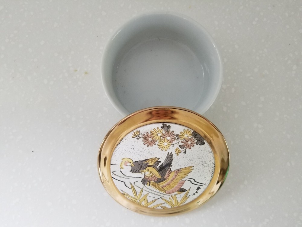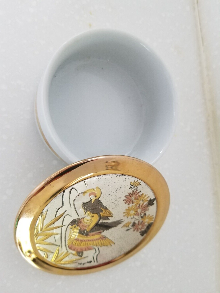 4" inch round collector trinket box with a white porcelain base featuring a decorative design of birds in the Japanese art of Chokin style. It is made in Japan and has intricate 24 Kt gold trim details. A beautiful piece of decorative collectible showcasing Japanese culture and craftsmanship. Very good preowned condition with no chips or cracks. Please view photos.