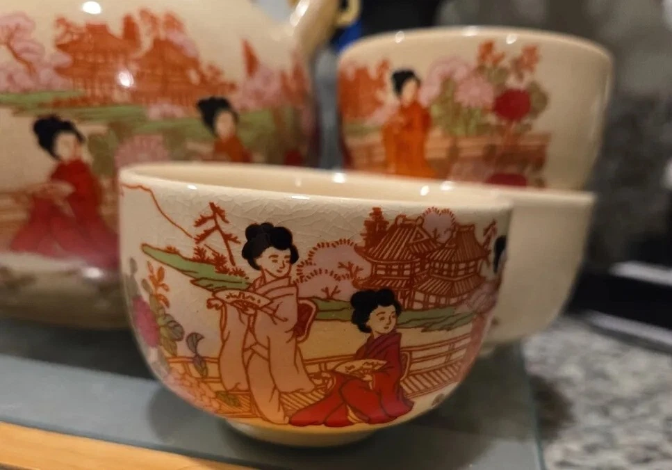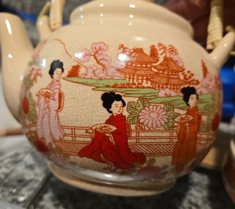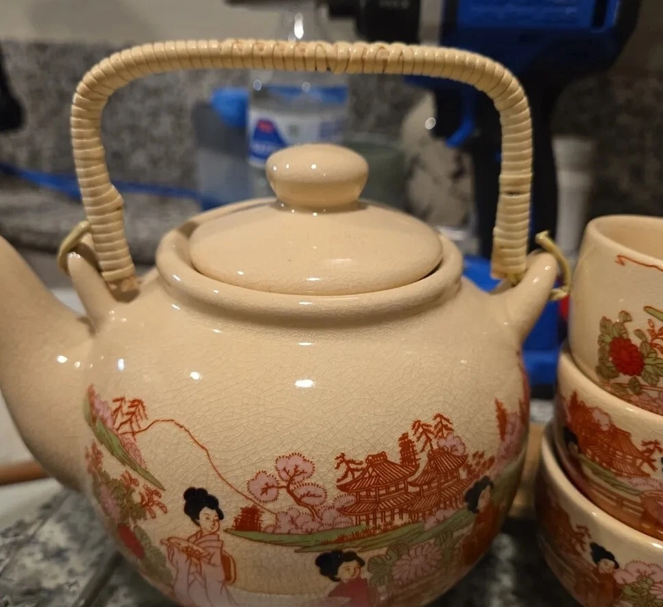 This Japanese tea set is a beautiful addition to any collection. The stoneware pot and cups feature a textured design with bamboo accents and a wicker handle. Handmade in Japan, this set is a true representation of Japanese culture. The provenance of this item is not available, but it is certain to be a unique and special addition to any tea lover's collection. Perfect for entertaining guests or enjoying a quiet cup of tea, this set is a must-have for any tea enthusiast.
