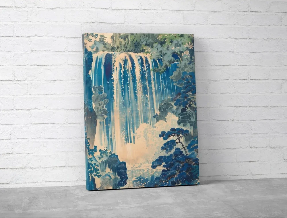 Japanese Waterfall Asian Blue Green Painting Wall Art Canvas Unframed Print Art