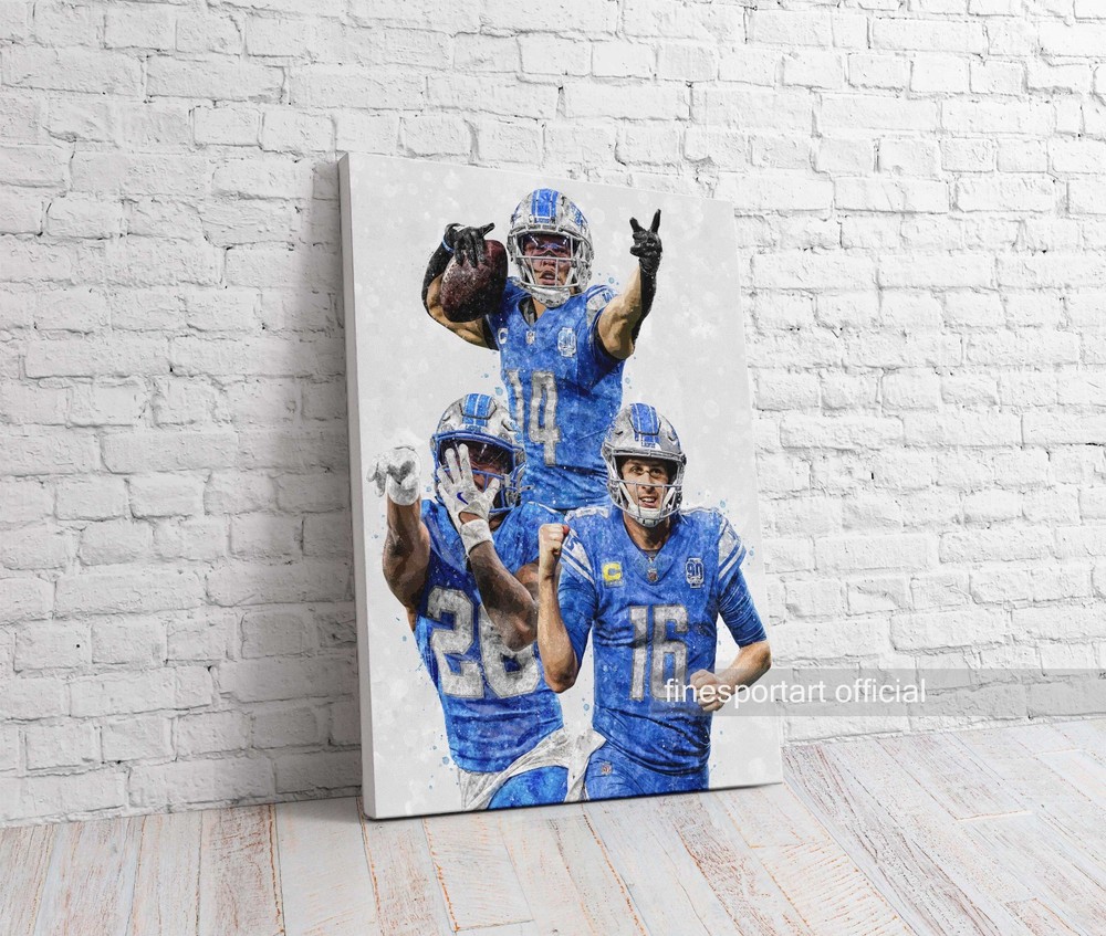 Jared Goff, Amon-Ra St. Brown, Jahmyr Gibbs poster in Detroit Lions uniform? Yes! We have the best selection of sports posters, canvas prints and wall art for sale. This print will be a great gift for any football fan. QUALITY : *Premium Posters - Museum-quality poster made on thick and long-lasting matte paper. - Paper weight: 200 gsm / 80 lb - Professionally Printed on Epson EP Premium. - Shipped in sturdy packaging protecting the poster. *Canvas Stretched - Cotton canvas composite with a special proprietary coating. - Inner frame made with radial pine sourced from renewable forests. - Soft rubber dots on bottom back corners for support. - High image quality and detail. - Back hanging included. SHIPPING INFORMATION: - FREE SHIPPING on all prints. ✉️Please contact me if you have any questions! DISCLAIMER: "My sports prints are created with my own artistic interpretations using a graphic editor. Any brand names, logo or trademarks used herein remain the property of their respective owners. The listing of any company, drawing, quote and/or their logos is not intended to imply any endorsement or direct affiliation with said company."