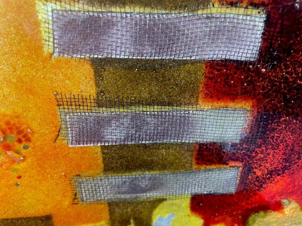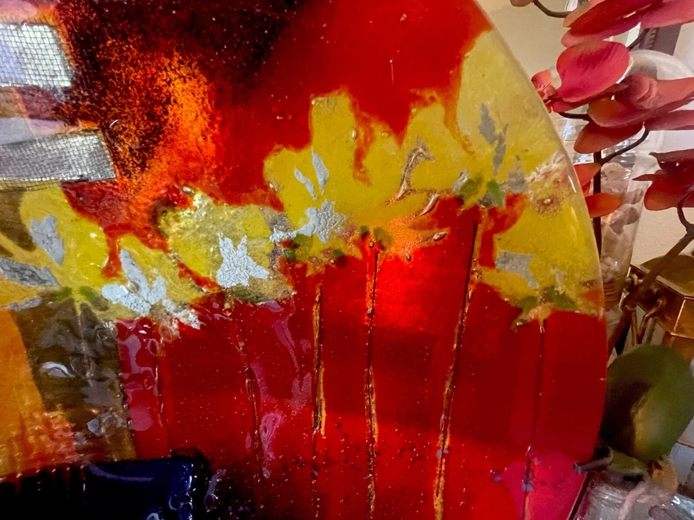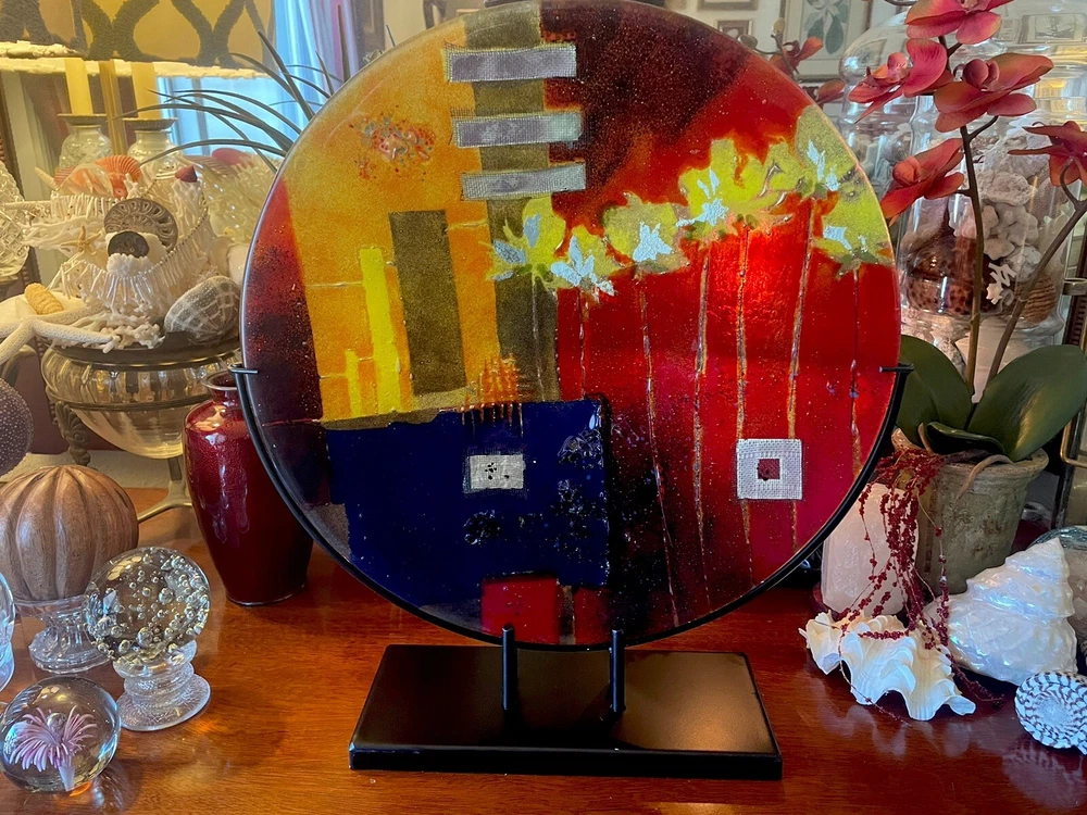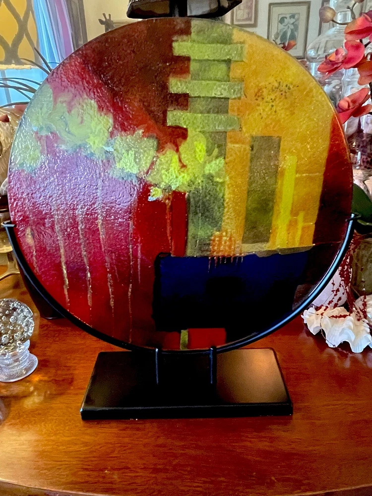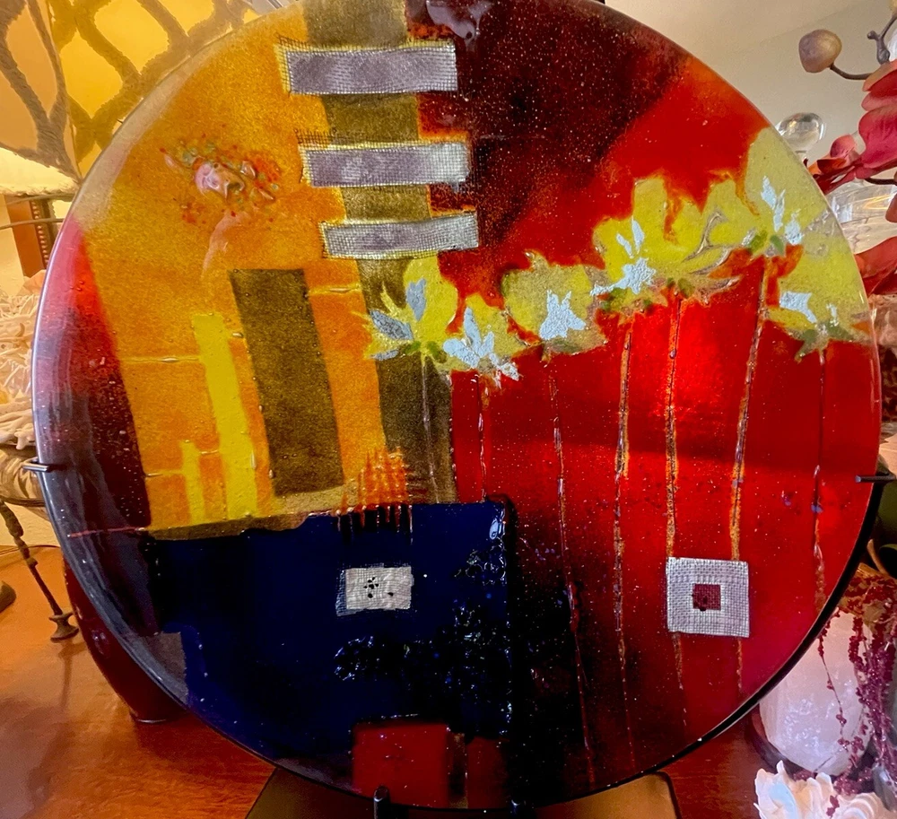 This is a gorgeous piece of art in the form of a fused glass platter, very pretty. I just love what looks like palm trees all in a row. The glass is just stunning, and I would recommend putting it somewhere that the light will come through it, either a window, or small spotlight behind it. The colors really pop all the more in the light. The square lighter colored places are made with a metal mesh. This piece was still on the website not that long ago, and the decorator plate, and the larger platter on a stand it still there. This -ice sold at 199.00 originally, so now’s the time to buy. The platter with no stand is also listed with me, so please take a look, there is a lot of nice things for sale.🌸Thanks for looking. This item is for the platter and stand only Reasonable offers always welcome🌸