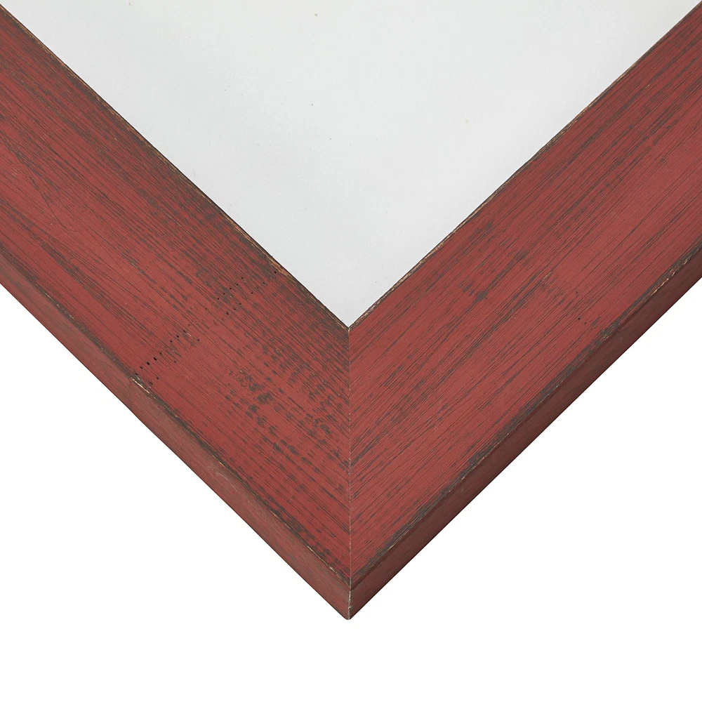 Rustic style; weathered red with visible wood grain; painted finish Frame includes: clear acrylic facing, rigid cardboard backing and wire hanging hardware kit (some assembly required) Frame holds a 14 by 18-Inch photo/print/poster (viewable area reduced by .25" on each side due to frame lip) Frame moulding is 1.5 inches wide; solid wood construction Frame is designed for WALL HANGING only (hanging hardware allows for portrait or landscape orientation)