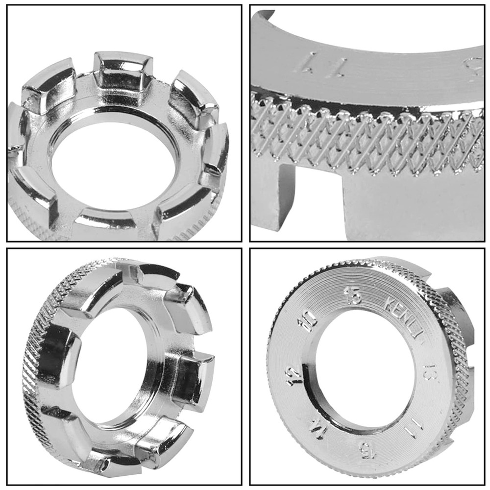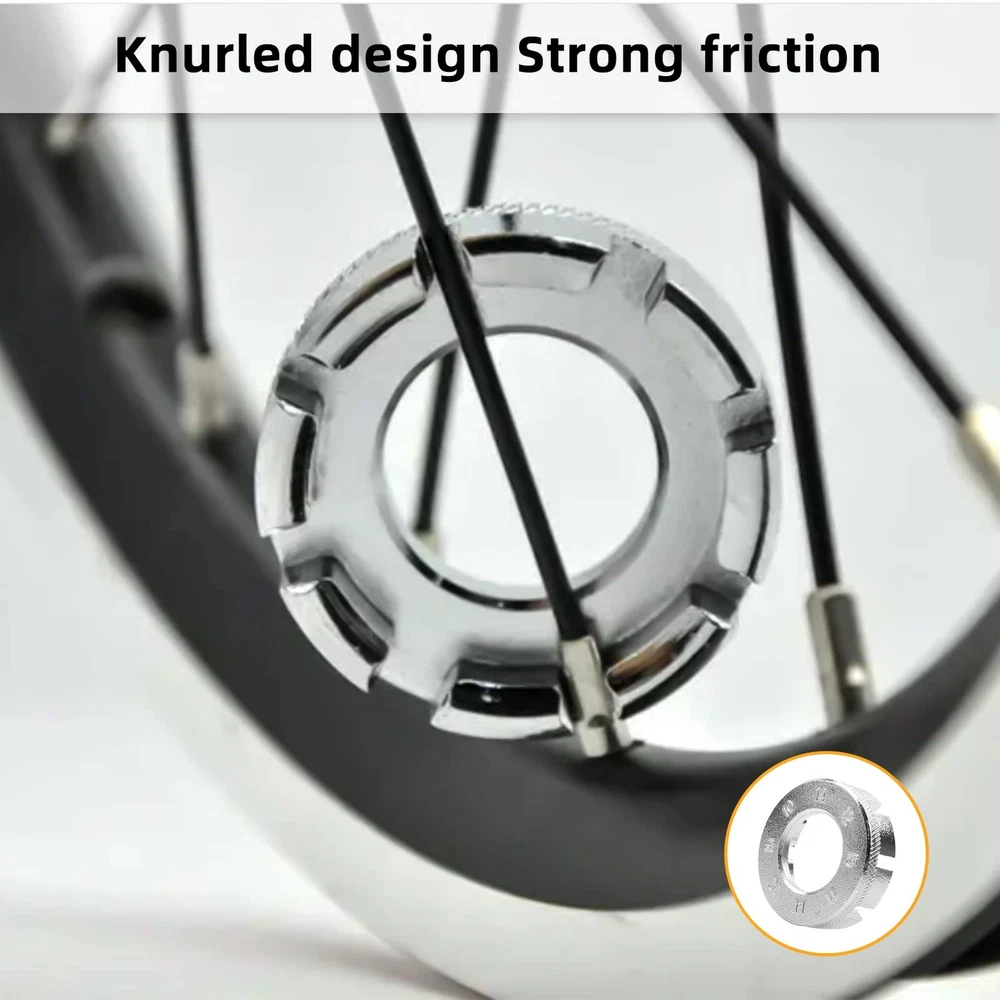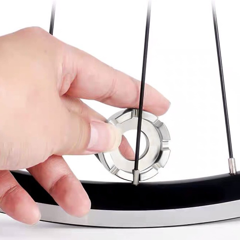 Jawflew Spoke Wrench - 8 Way Bike Rim Truing Tool Hard Steel Silver-1PC Product Details Includes All Common Sizes:The bike spoke wrench tool will fit over spoke gauges of 15, 14, 13, 12, 11, and 10; The wrench is designed to adjust and tension spoke nipple sizes of 3.23mm, 3.30mm, 3.45mm, 3.96mm, 4.40mm, and 5.00mm Essential Tools For Bicycles:icycle Spoke Wrench is a must-have tool for bike rim correction while you Tighten, Remove, Install Bike Wheels Spokes. Easy To Carry:The bicycle spoke wrench is 40mm (1.6 inches) in diameter, and weighs in at just 51 gram. Very easy to carry because of its light weight Hard Steel Construction:Extra tough 9H hardness hard steel construction. Chrome-plated finish. Anti-Slip Design:Anti-slip perimeter pattern design makes it stable to grip while working on your bike. This tool won't slip out of your hands easily when making adjustments to your spokes.