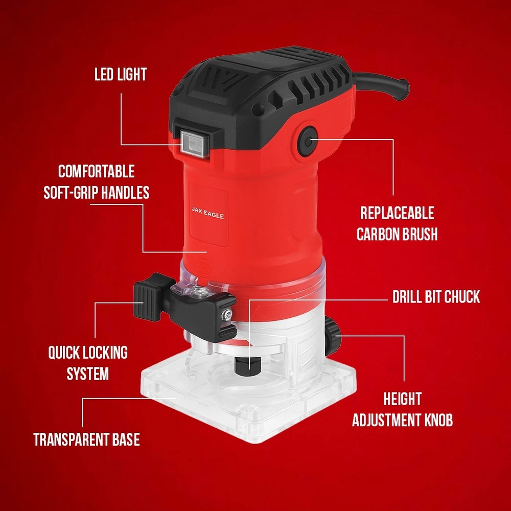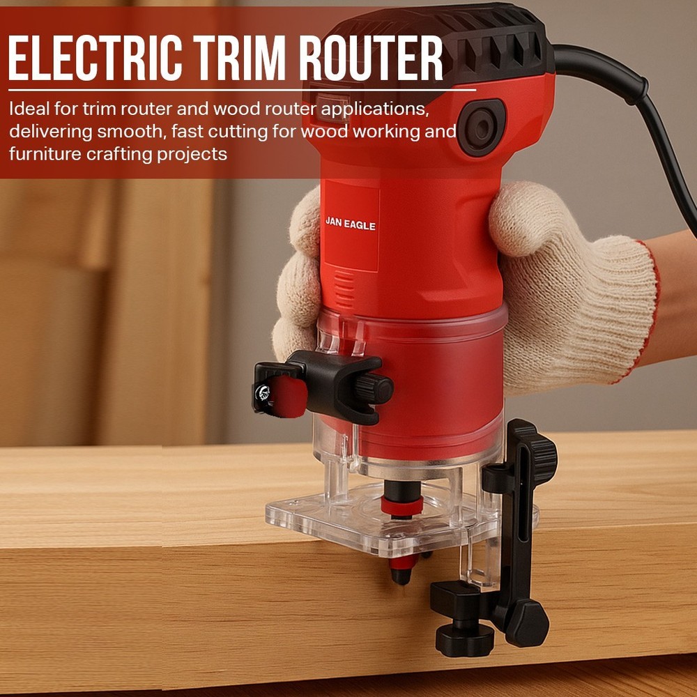 Upgrade your woodworking projects with the Jax Eagle WT635M Router Tool, designed for exceptional versatility, control, and precision. This powerful wood router features a 580W high-speed motor that reaches an impressive 32,000 RPM, making it ideal for wood routers for woodworking tasks like trimming, grooving, slot cutting, and edge finishing. Whether you are working on furniture, cabinetry, or fine detailing, this compact router ensures smooth, clean cuts in every pass. As a trim router and palm router, the WT635M offers ease of handling and improved maneuverability for precise work on edges and corners. Its 1/4-inch (6.35mm) collet size allows compatibility with a wide variety of router bits, suitable for both DIY woodworking and professional applications. Perfect for use as a plunge router, this versatile machine handles plunge cuts for grooves and decorative inlays with confidence. Built to meet the needs of serious craftsmen and hobbyists, this router woodworking tool is engineered for both wood working and shaping, ensuring high-quality finishes in a variety of materials. Its durable body and stable construction promise long-lasting performance, making it a great addition to any router table with router combo kit setup. Whether you're using the WT635M as a compact router or a dedicated router tool, it delivers professional results with every project. This machine is also compatible with multiple accessories for routers for woodworking, offering flexibility across projects like furniture building, trimming doors, or crafting custom wood pieces. Its lightweight design reduces fatigue during prolonged tasks, and the soft grip ensures comfort during operation. For precise, fine detail tasks or large furniture assembly, this wood router remains reliable and efficient. Technical Specifications: Voltage: 110V ~ 60Hz Power Input: 580W Variable Speed: 32,000 RPM Bit Size: 6.35mm (1/4 inch) Applications: Trimming, Slot Cutting, Grooving, Edge Finishing What’s in the Box: Jax Eagle WT635M Router Tool 1/4-Inch Collet Chuck Edge Guide Wrench for Easy Bit Changes User Manual Perfect for router woodworking, furniture crafting, and cabinet detailing, the WT635M router tool ensures flawless results in every cut. Equip your workshop with this essential wood router and experience true craftsmanship precision today.