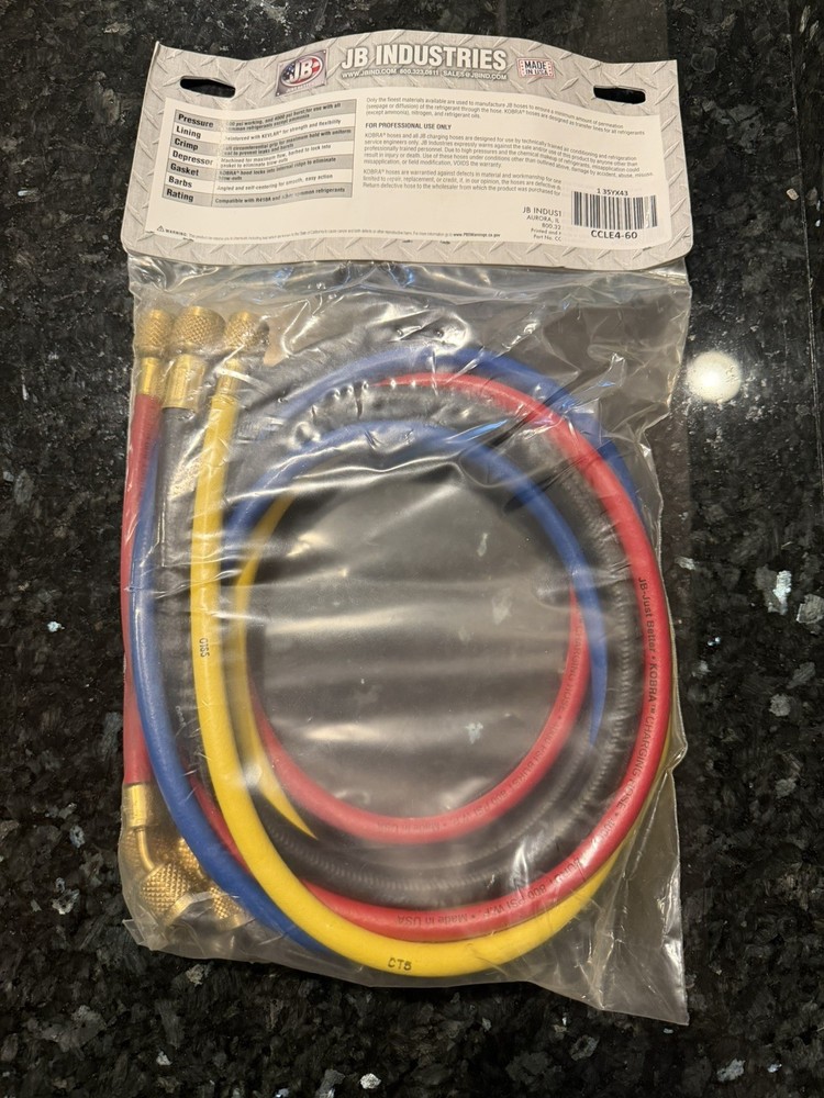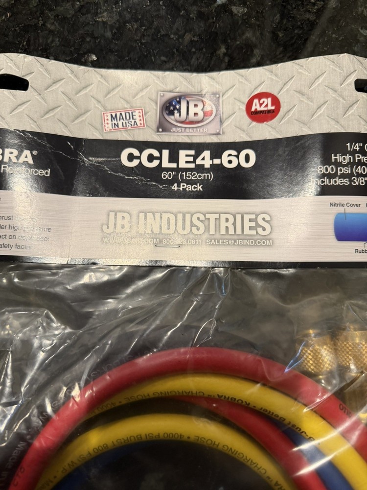 Depth:11.800Agency Compliance:ULMPN:CCLE4-60Brand:JB INDUSTRIESMotor Type:N/ANumberOfItems:1Item Length:10.300Hose Material:Kevlar(R)/RubberWorking Pressure:800 psiWorking Pressure (PSI):800California Prop 65 Warning:NItem Weight:2.1000Country of Origin:USWeight:2.1000Number of Batteries:N/Agtin13:00696333273398Power Source:N/AModel:CCLE4-60Connection Size:1/4" Female x 1/4" Female, 3/8" Female x 3/8" FemaleUPC:00696333273398Type:Manifold Hose SetFor Use With:Refrigerant Manifold Gauge SetsLength (In.):60Item:Manifold Hose SetBattery Life:N/AManufacturer Warranty:1 yearFitting Material:BrassBattery Included:NoWidth:11.800Battery Capacity:N/AItem Width:11.800Burst Pressure:4000 psiColor:Blue, Red, YellowLength:10.300Angle:30 DegreesApplication:HVACRestricted States:[]Battery Size:N/ACable Length:N/AFeatures:Hose Set, Connection Size Black Hose 3/8 in Female x 3/8 in Female, Red/Yellow/Blue Hose 1/4 in Female x 1/4 in Female, 45 Degrees Angle, Number of Hoses 4, Length 60 in, Color Blue, Red, Yellow, Hose Material Rubber/Kevlar(R), Fitting Material Brass, Working Pressure 800 psi, Burst Pressure 4, 000 psi, For Use With Refrigerant Manifold Gauge Sets, Features Includes 3/8 Vacuum HoseVoltage:N/AStyle:Manifold Hose Set