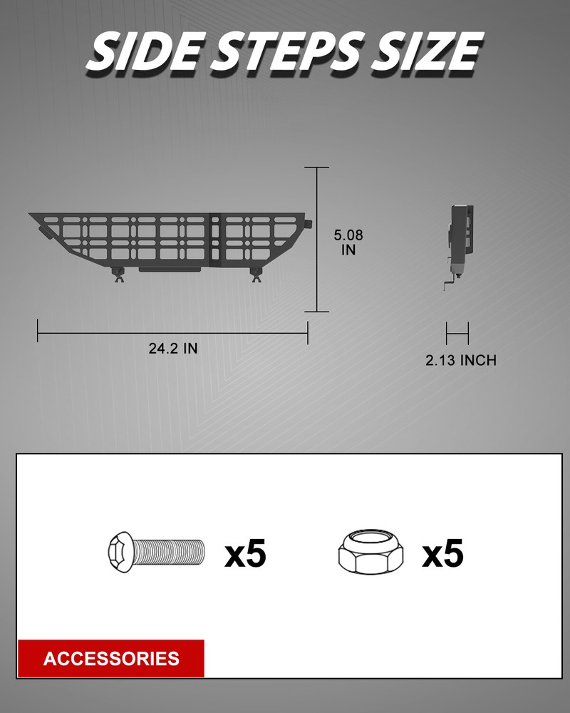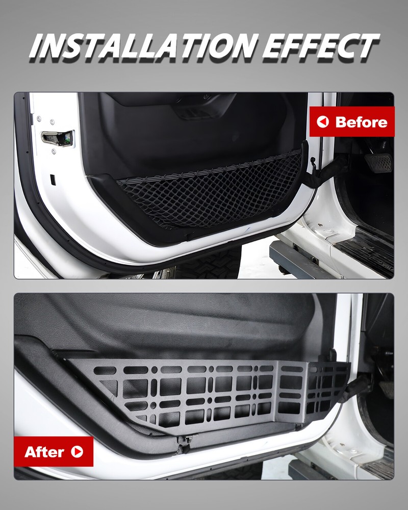 Store Categories Other Car Refrigerator Front Bumper Rear Bumper Fender Flares Inner Fenders Side Steps Running Board A-Pillar Light Mount Brackets Headlights Taillights Fog Lights LED Headlights LED Taillights LED Fog Lights Jeep Chevrolet Ford Toyota Dodge GMC More Molle Panel: https://www.ebay.com/itm/405300953367 https://www.ebay.com/itm/405333410958 About this item π γVehicle FitmentγOur front door pocket molle panels are designed to fit for 2018 2019 2020 2021 2022 2023 2024 2025 Jeep Wrangler JL 4 Door and fit for Jeep Gladiator JT 2020 2021 2022 2023 2024 2025. Before completing your purchase, kindly verify that the front door pocket molle panels fit for your wrangler JL vehicle. π γ High Quality MaterialsγOur Jeep Front Door Molle Panel Pockets replace weak OEM nets, offering a rigid steel design for durable, sag-free storage. The outward-protruding front panel maximizes space, perfect for water bottles and similar items. π γSimple Bolt-on InstallationγNo need to remove the door panel for installation, as these feature a snap-in design with locking tabs to secure the molle pocket into place. Please Note: Cutting/Removal of factory netting is required for installation. π γComplete Packageγ2 X Front Door Pocket Molle Panels (w/mounting hardware kit).If there are any problems, please contact us at any time, we would provide you with efficient timely customer service and solution. Front Door Pocket Molle Panel Features π Made of 2.5mm thick steel plate. π Painted with a double layer of black textured powder coat for beauty, wear resistance, and corrosion resistance. π Our Jeep Front Door Molle Panel Pockets replace weak OEM nets, offering a rigid steel design for durable, sag-free storage. The outward-protruding front panel maximizes space, perfect for water bottles and similar items. π No need to remove the door panel for installation, as these feature a snap-in design with locking tabs to secure the molle pocket into place. Please Note: Cutting/Removal of factory netting is required for installation. Front Door Pocket Molle Panel Fitment π For 2018 Jeep Wrangler JL 4 Door π For 2019 Jeep Wrangler JL 4 Door π For 2020 Jeep Wrangler JL 4 Door π For 2021 Jeep Wrangler JL 4 Door π For 2022 Jeep Wrangler JL 4 Door π For 2023 Jeep Wrangler JL 4 Door π For 2024 Jeep Wrangler JL 4 Door π For 2025 Jeep Wrangler JL 4 Door π For 2020 Jeep Gladiator JT π For 2021 Jeep Gladiator JT π For 2022 Jeep Gladiator JT π For 2023 Jeep Gladiator JT π For 2024 Jeep Gladiator JT π For 2025 Jeep Gladiator JT Front Door Pocket Molle Panel Specification π Color: Black π Materials: Aluminum Alloy π Placement on Vehicle: Front , Left, Right π Installation: Bolt-on, π Attachment Type: Screw-On π Items Included: Mounting Hardware π Surface Finish: Black Powder Coated Steel π Fitment Type: Direct Replacement π Product Size: 24.2*5.08*2.13 inch π Package Size: 6.5*6.5*25.59 inch π Package Weight: 5.51 lbs Front Door Pocket Molle Panel Package π 1*Front Door Pocket Molle Panel π 1*Set of Mounting Accessories Payment Delivery details Terms of sales About us Contact us Payment We accept PayPal, credit card , Apple Pay & Google Pay etc. Delivery details All items will be shipped within 1-3 business days after payment received, we will try our best to ship out as soon as we can, hope for your understanding. Please double confirm your address and contact information, which will help the delivery faster and more accurately. Note οΌbuyers who purchase international products need to pay import tariffs!!! Terms of sales Professional installation is highly recommended. Any problem of the item please feel free to contact us first , please D o Not leave negative feedback before that, or simply return it within 60 Days in original condition. We will resolve it for you ASAP. About us Any questions please do not hesitate to contact us directly by eBay message . We will reply you within 24 hours asap, thanks for your understanding. Contact us Should you have any problem or require any further information please feel free to contact us . If you are satisfied with our product and service, please kindly leave us a positive feedback. Popular Categories On Apr 13, 2025 at 19:54:11 PDT, seller added the following information: