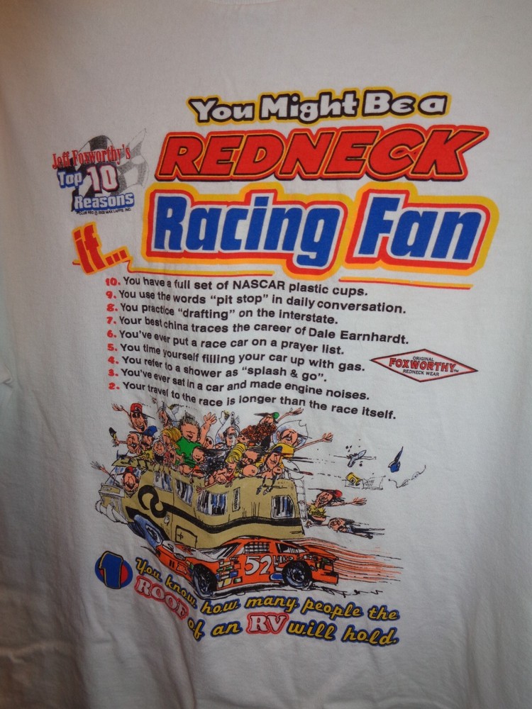 Hello :) Up for sale is a Jeff Foxworthy You Might be a Redneck Racing Fan Vintage Shirt Size Large' 100% cotton Great condition Approximate measurements: armpit to armpit 22" top to bottom 25" (pb26/w789/mec)