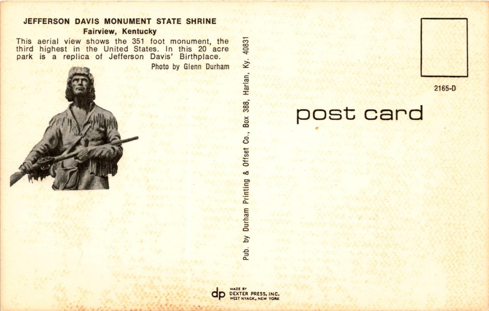 MAKE AN OFFER. THE MORE YOU BUY THE BETTER DEAL I WILL ACCEPT The postcard features an aerial view of the Jefferson Davis Monument State Shrine in Fairview, Kentucky. The monument stands at 351 feet, making it the third highest in the United States. The 20-acre park surrounding the monument also contains a replica of Jefferson Davis' Birthplace.