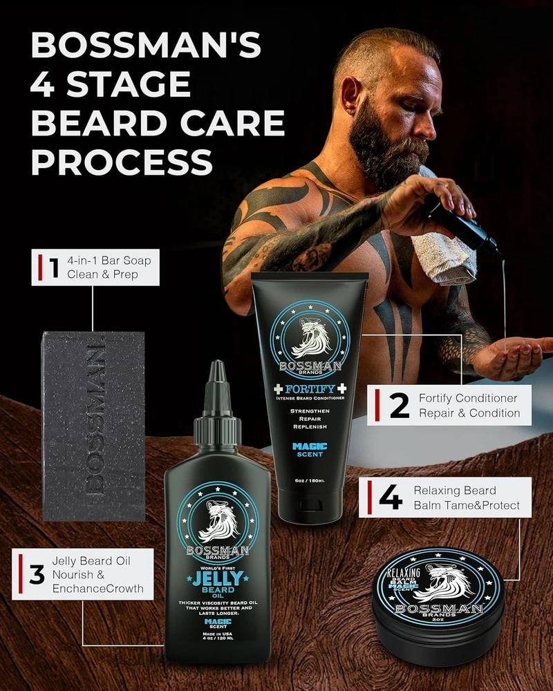 Jelly Texture: Thicker consistency locks in moisture and nourishes beard hair for a fuller, healthier look. Major upgrade over traditional beard oil for men, with performance that sets a new standard. Softening & Taming: Our jelly acts as a beard softener, thickener, tamer, and moisturizer, all in one. The carefully chosen natural oils moisturize and stimulate hair follicles and pores to improve beard health so you can rock a polished look. Natural Ingredients: Our beard lotion uses organic ingredients like beeswax, avocado oil, and soybean oil, which hydrate at the roots and lock in moisture to keep your beard looking and feeling as legendary as you are. Made in USA, Double the Quantity: Our beard moisturizer jelly comes in a 4 oz bottle, double the amount and lasts twice as long as other beard oil products. Combining our Jelly with our beard balm and fortifying conditioner creates the ultimate beard grooming kit. Magic Scent: A signature Bossman beard lotion features a warm and redolent blend of rich sandalwood and vanilla oils that create a clean base to highlight the bergamont, patchouli, and frankincense accents. Product description 1 Effective Beard Care 2 All Natural Power 3 7 Signature Scents 4 24-Hours Strength 1 Shake That Bottle 2 Drop a Small Amount 3 Rub to Activate 4 Massage Into Beard 5 Pro Tip Run Your Boss Care Add to Cart Add to Cart Add to Cart Add to Cart Customer Reviews 4.5 out of 5 stars 14,699 4.4 out of 5 stars 4,714 4.5 out of 5 stars 2,967 4.5 out of 5 stars 9,808 4.2 out of 5 stars 38 Price $14.99 $ 14 . 99 $9.99 $ 9 . 99 $15.99 $ 15 . 99 $17.95 $ 17 . 95 $13.99 $ 13 . 99 Scent Magic Lavender + Patchouli Magic Magic Unscented Top Notes Vanilla, Sandalwood - Vanilla, Sandalwood Vanilla, Sandalwood - Heart Notes Bergamot - Bergamot Bergamot - Base Notes Frankincense, Patchouli Lavender, Patchouli Frankincense, Patchouli Frankincense, Patchouli - Natural ✔ ✔ ✔ ✔ ✔ Cruelty-Free ✔ ✔ ✔ ✔ ✔ Made in the USA ✔ ✔ ✔ ✔ ✔ Purpose Moisturizing Cleansing Conditioning Softening Soothing and Cooling The video showcases the product in use. The video guides you through product setup. The video compares multiple products. The video shows the product being unpacked. Upgrade Your Beard Game Merchant Video Elevate your beard game with Bossman Achieve a thicker, faster-growing beard with our groundbreaking Beard Jelly! Our unique formula makes your beard grow faster and fuller by creating strong bonds with your hair and skin due to increased viscosity. It's a comprehensive solution that not only softens and thickens, but also smooths and hydrates. Our natural oils are a game-changer when it comes to improving overall beard health for a polished, irresistible look. Don't settle for mediocre products. Choose our Beard Jelly and witness your beard game soar to new heights!