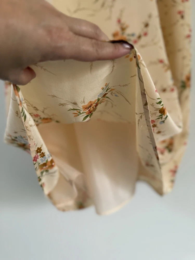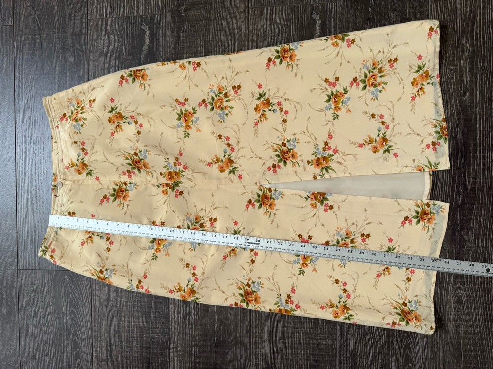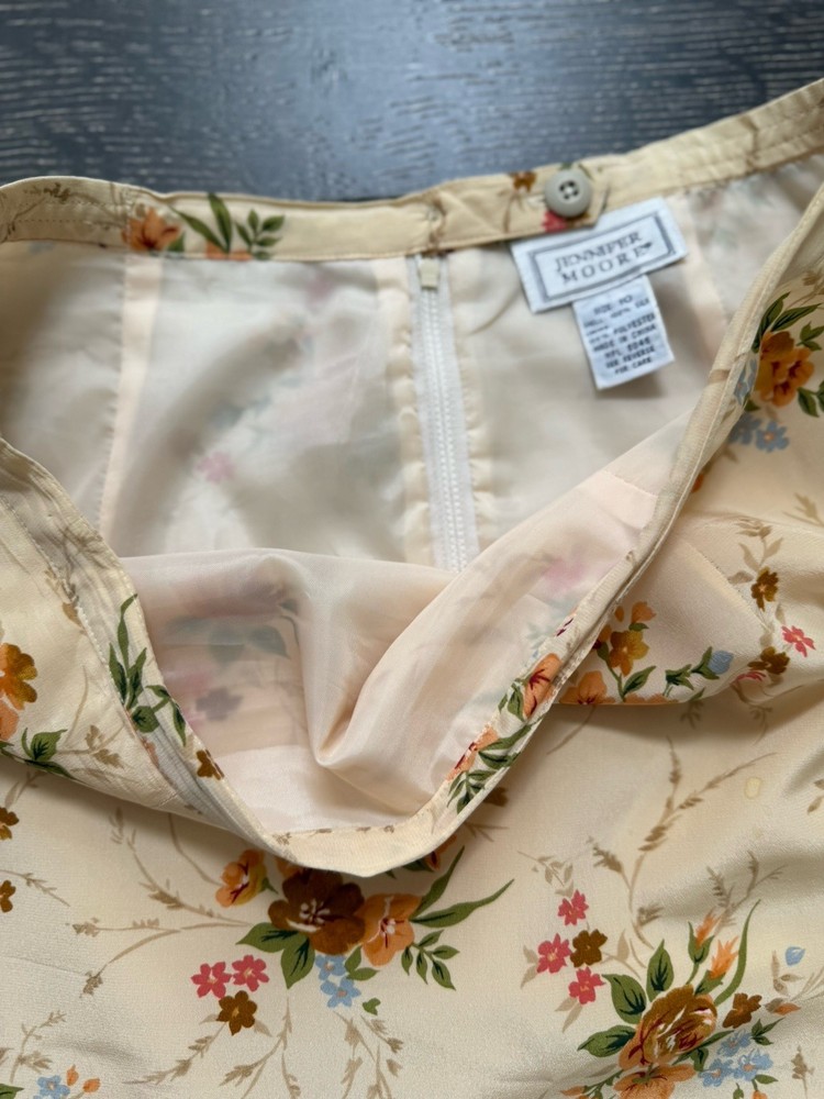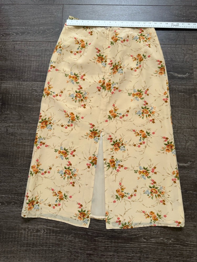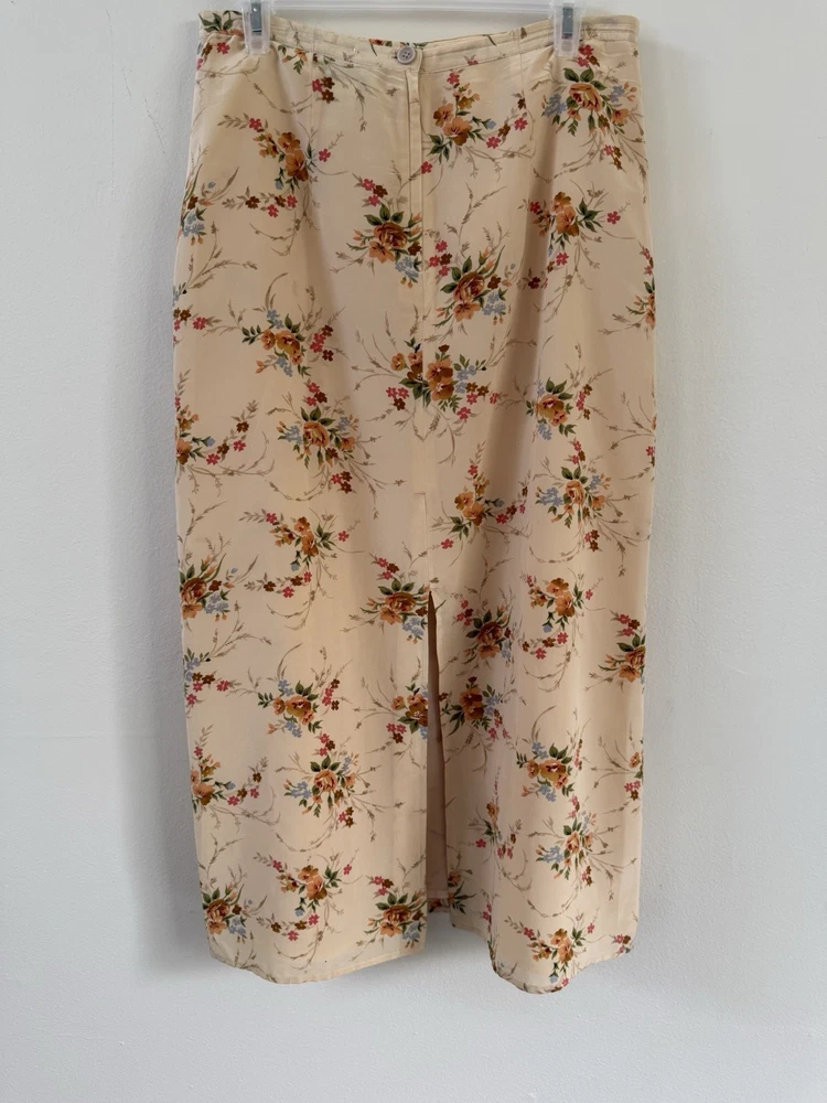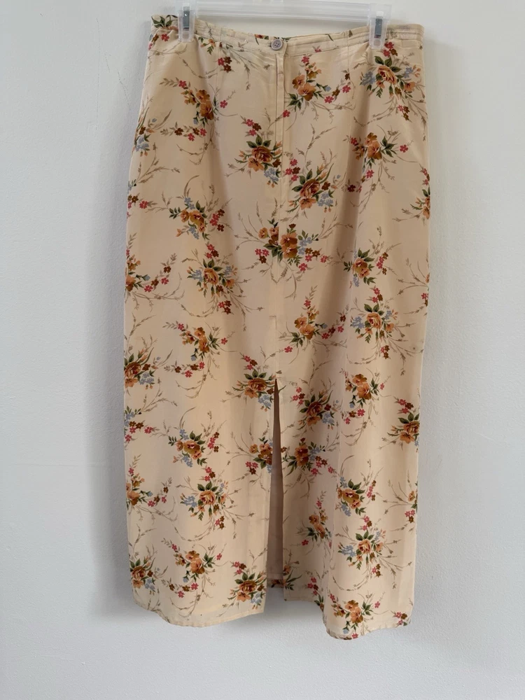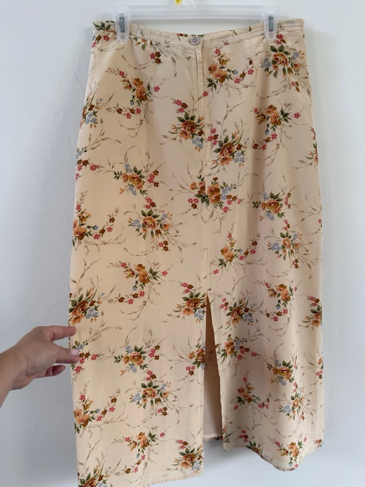 The Jennifer Moore Women's Beige Silk Floral Lined slit Skirt in size 10 is a stylish and versatile piece perfect for various occasions such as parties, casual outings, workwear, and business meetings. Made from luxurious silk, this long skirt features a beautiful floral pattern with a zip closure for easy wear. The lightweight design and mid-rise waist make it comfortable for all-day wear, while the lined interior adds an extra touch of sophistication. This chic skirt is ideal for the summer, fall, and spring seasons, adding a touch of elegance to any wardrobe. Condition of the skirt is Pre-Owned in great shape! Shipped asap by USPS ground advantage mail.