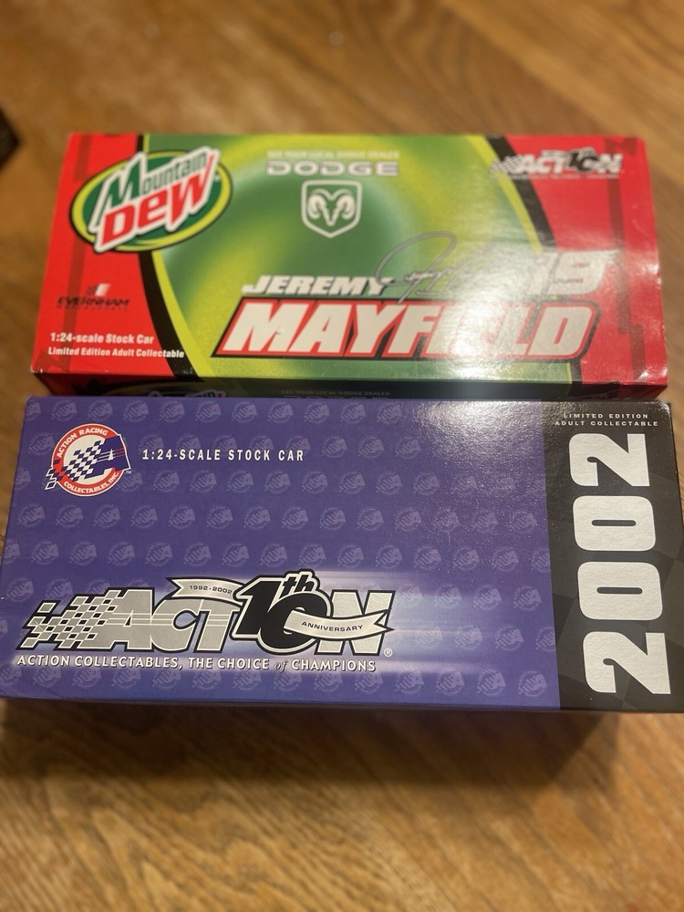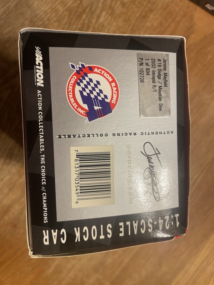 The product is a 1:24 scale diecast model of Jeremy Mayfield's #19 Dodge Dealers Mountain Dew 2002 Dodge Intrepid NASCAR racecar. It is a green-colored replica of the actual racing car driven by Mayfield during the NASCAR races. The model is a bank, which suggests it has a slot for storing coins. Produced by Action, this collectible item is part of the "Cars" character family and is made in China. It is suitable for ages 17 years and up.
