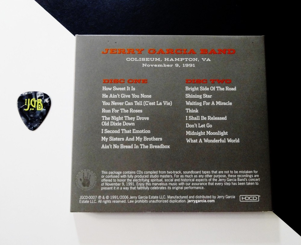 Jerry Garcia - Jerry Garcia Band : Hampton Coliseum - Hampton, Virginia ( VA ) : November 9, 1991 ( 11/9/1991 ) : Pure Jerry Series Volume 7 ( Pure Jerry 7 / JGCD0007 ) ' Jerry Made Live Recordings ! ' : 2 CD + " Collectible JGB Guitar Pick !!! " : Fall Tour '91 - at the Hampton Coliseum !!! Extremely-Rare !! Out of Print ' Pre-Order ! ' ( Early-2006 ) 2-CD Set ( with " JGB Guitar Pick !!! " ) ... Amazing !!! Fall '91 J.G.B. !!!!!!! * ** This 2-CD Set also Includes the " Extremely-Rare !!! " Jerry Garcia Band ( JGB ) Guitar Pick ! - which was Only-Included inside a Very-Small-Portion ( & Not-All ! ) of the ' Initial ' 2006 Pre-Ordered CD Sets !!! *** Jerry Fans, Deadheads & All Music Collector's of Great Live Rock 'n Roll : Fall-in for this one . . . Wow ... just about 30-years-ago !?! now. Hard to fathom, indeed. Well, I can say this -- I was fortunate enough to catch the very 1st two ( 2 ) dates on this East Coast / Midwest 1991 Fall Tour ( 11/6/91 & 11/7/91 at the Capital Centre in Landover, MD ! ) and if you were there, you can probably back me up in the fact that the anticipation & intensity from the crowd was unlike anything the Jerry Garcia Band had ever seen regarding rabid fans craving their Garcia Band. This was a Huge ! fourteen date ( 14 ) East Coast / Midwest swing that the fans were very, very anxious for. Since the J.G.B. had not played once in the East dating back to the 1989 Summer Tour, anyone Back East had to travel to the West Coast to catch the Garcia Band ( in much smaller venues ). Another thing, as you likely already know - at this point the whole scene and massive fan following led to unfortunate problems regarding the ongoing " fans versus security " thing escalating. I just remember being there and thinking oh my gosh, are we going in to see Garcia, or The Grateful Dead tonight !!?! I mean the scene nearly matched the Hockey-rink East Coast Tour the Dead delivered during the 1990 Spring Tour. I even remember thinking what kind of pressure this would put on Garcia ? I mean this scene is light-years from the Warfield & Wiltern crowds from a standpoint of sheer intensity. So, What Would Jerry Do ? Deliver. Of course ... Naturally. I mean just completely delivering-the-goods - unbelievable performances !!! Both nights at the Cap Centre, and again at this Hampton show ( where the positive energy ante was definitely upped with a very special guest appearance by Bruce Hornsby ) definitely adding some extra musical spice ! Bruce sits in for the whole night joining Jerry, along with John Kahn, Melvin Seals, David Kemper, Jackie LaBranch & Gloria Jones. This delightful energy just continued to keep up for the rest of this great Tour. I've both heard & seen plenty of it on tape & video -- eleven more nights on the East Coast, and then in the Midwest ! This 2-CD Set offers an amazingly spirit-filled musical performance during the now historic 1991 East Coast Tour & excellent show at the Hampton Coliseum. Many Deadheads consider this night to be the best of the fourteen ( 14 ) shows, especially with the surprise addition of Hornsby showing up & playing real-hard for this ' hometown ' show. Garcia Band Fans definitely need this one, absolutely no doubt - and without any question ... Enjoy !!!!! TRACK LISTING >>> Jerry Garcia Band ' Live ' at the Hampton Coliseum in Hampton, Virginia on November 9, 1991 ( 11/9/91 ) : with Bruce Hornsby : Disc 1 : How Sweet It Is He Ain't Give You None You Never Can Tell ( C'est La Vie ) Run For The Roses The Night They Drove Old Dixie Down I Second That Emotion My Sisters And My Brothers Ain't No Bread In The Breadbox Disc 2 : Bright Side Of The Road Shining Star Waiting For A Miracle Think I Shall Be Released Don't Let Go Midnight Moonlight What A Wonderful World * Item Condition * : This ' Extremely-Rare !! ' Out of Print ( 2006 Jerry Garcia Estate, LLC release ) Jerry Garcia Band - Hampton Coliseum - Hampton, Virginia ( VA ) - November 9, 1991 ( 11/9/1991 ) " Pure Jerry 7 " 2-CD Set ... ' With ' the Extremely-Rare ! & Collectible " JGB Guitar Pick ! " Included !! is in Like New (Near Mint/Mint!) condition. CD's ( Disc 1 & Disc 2 ) are in Like New (Near Mint/Mint!) condition. CD Case ( 2-CD Tri-Fold ) is in Like New (Near Mint/Mint!) condition. Collectible JGB Guitar Pick is in Like New (Near Mint/Mint!) condition. Please Note : The " JGB Guitar Pick " was Only-Included inside a Very-Small-Portion of the 2006 ' Pre-Ordered ' Sets ( & Not-All ! ) - and ... This-Set ' Has ! ' the JGB Guitar Pick " Included ! This 2-CD Set is in " Collector's Grade " condition - played only one-time, and very carefully stored inside protective plastic in my professional CD rack. Garcia Band ! - Hampton Coliseum !! - on the '91 Fall Tour - with Good Ol' Bruce ! Sittin' In - Enjoy !!! * Please Note ! * : This " JGB Guitar Pick " which was included-inside this 2006 " Pre-Ordered " 2-CD Set was Only-Included inside a Very-Small-Portion of the 2006 ' Pre-Ordered ' Sets ( & Not-All ! ). And ... This-Set ' Has ! ' the JGB Guitar Pick " Included ! " ( please see photos of " JGB Guitar Pick " provided ! ) ... Extremely-Rare !! Each JGB Pick Issued is " Unique ! ". The " JGB " print-design is always the same/similar, but each individual JGB Guitar Pick has a different & unique ' marble-pattern ' on the Pick plastic ( see Pick ' backside ' - Photo # 5 provided ). I am fully-aware that some Pre-Order Sets ' Had ' the JGB Pick Included-Inside, and some Pre-Order Sets ' Did-Not-Have ' the JGB Pick Included-Inside - but, I am uncertain on the actual quantities. And, from my own personal experience with these Sets ( in 2006 ) - I am inclined to believe that ' many ' of these Pre-Order Sets ' Did-Not-Have ' the JGB Pick - but, I cannot confirm the exact quantities ( ratios ) with certainty - even despite my efforts at the time of this release/issue ( in 2006 ). Please ask any questions before bidding/buying & Best of Luck ! ( also ... please feel free to click the 'see other i