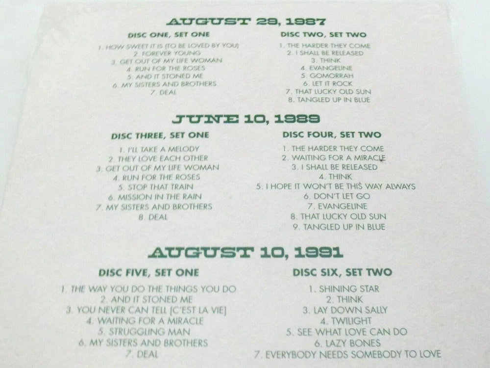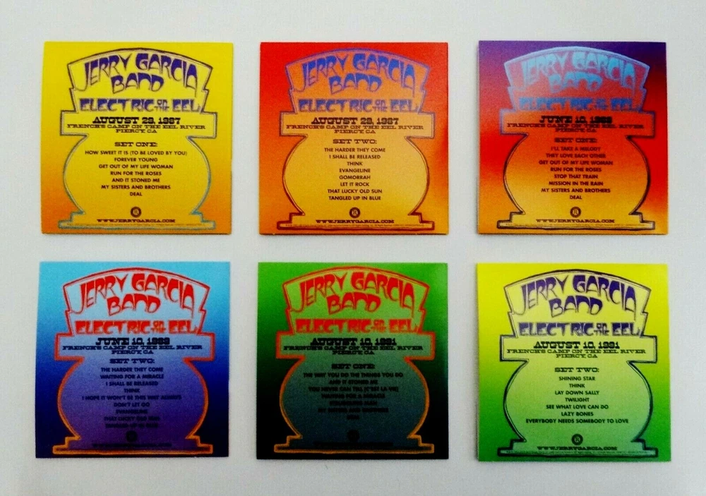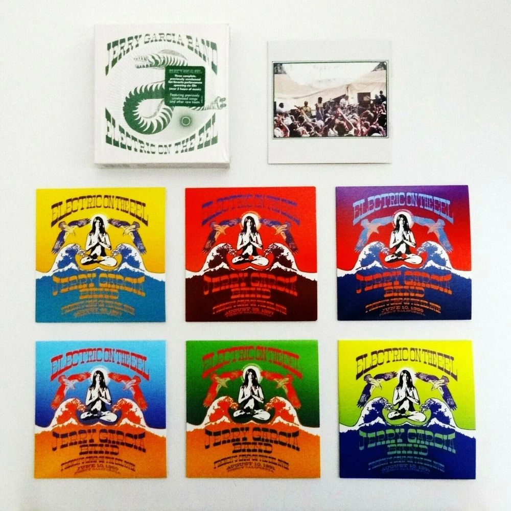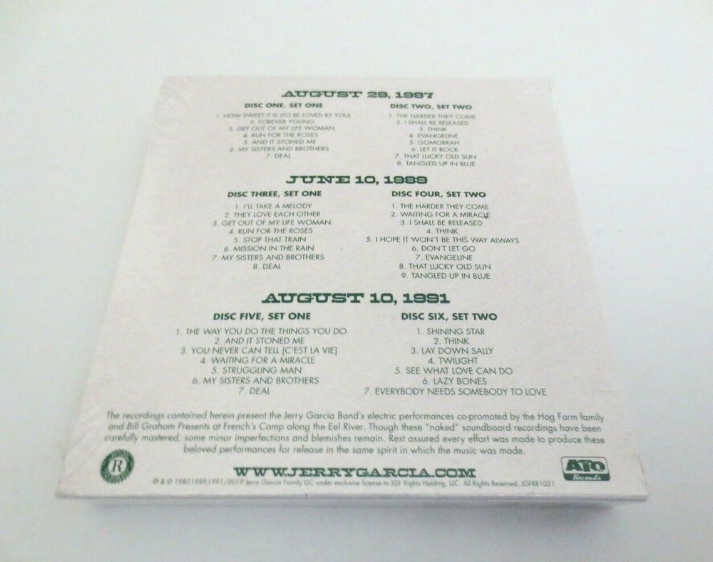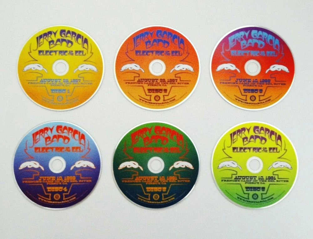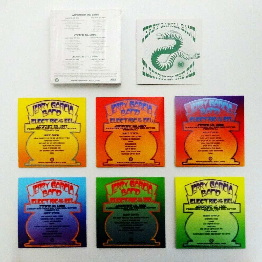 Jerry Garcia - Jerry Garcia Band - Electric On The Eel - Three ( 3 ) Live J.G.B. Shows - French's Camp on the Eel River - Garberville, California ( CA ) ) - 1987 ( August 29, 1987 ( 8/29/1987 ) ) - 1989 ( June 10, 1989 ( 6/10/1989 ) ) - 1991 ( August 10, 1991 ( 8/10/1991 ) ) - 6 CD Set - 2019 Jerry Garcia Family, LLC - Round Records - ATO Records (1987-1991/2019) - JGFRR1021 1987 - 1991 Jerry Garcia Band ( Jerry Garcia / John Kahn / Melvin Seals / David Kemper / Jaclyn LaBranch / Gloria Jones ) JGB - 8/29/87 - 6/10/89 - 8/10/91 ( CA ) August 29, 1987 ( 8/29/1987 ) - French's Camp - Eel River - Garberville, California ( CA ) June 10, 1989 ( 6/10/1989 ) - French's Camp - Eel River - Garberville, California ( CA ) August 10, 1991 ( 8/10/1991 ) - French's Camp - Eel River - Garberville, California ( CA ) Three ( 3 ) Complete & Amazing ! Jerry Garcia Band ( J.G.B. ) Shows from the Summers of 1987, 1989 & 1991 at French's Camp on the Eel River - just 9-Miles South of Garberville, California ( CA ) Brand New / Factory Sealed - ( 6-CD Set ) ( Photos 1 through 5, and 11 & 12 are of the actual-item ( the Brand New / Factory Sealed 6-CD Set ) you will receive / Photos 6 through 10 are of another ( opened ) Set - so you can also easily-see the " Color-Art " inside this 6-CD Set )