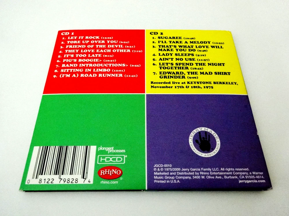 Jerry Garcia - Jerry Garcia Band : Let It Rock : Jerry Garcia Band - Keystone Berkeley - Berkeley, California ( CA ) : November 17 & 18, 1975 ( 11/17/1975 & 11/18/1975 ) : 2 CD : The Jerry Garcia Collection - Volume 2 ( JGCD 0010 ) : 2009 (1975/2009) Jerry Garcia Family, LLC / Rhino ( JGF / Rhino ) : Very-Rare !!!!! The Jerry Garcia Band Live in '75 ! ... at the Keystone-Berkeley !! - " Let It Rock ! " - as the Title says it All - WOW !!?! LET IT ROCK !!!!!!!!! LET IT ROCK !!!!! People, this ' Title ' here is no-joke. And whoever it was that coined this simple, yet perfectly accurate title for this '75 Keystone Berkeley release deserves a ' Deadhead & Garcia-Fan Medal of Honor ' ... of some sort ?!? I mean there are days when I'm thinking " Hmm ... what should I listen to now ? " Oh yeah : Let It Rock, naturally ... - I mean why was I confused anyways ?! It sort of has the same title-effectiveness as " Don't Let Go " which we all know is yet another Tried & True J.G.B. Treasure. No, but on a serious note - this release came out back in 2009 and it is a Masterpiece in all contexts of the word. This 2-CD release might just define Rock 'n Roll perfection ?! This is the early ( & really the very 1st ) coming of age of the Jerry Garcia Band, taking the baton and running ( fast ! ) to the next stage of J.G.'s development as THE ! Bandleader. This is a stripped-down quartet with merely Jerry - John Kahn - Ron Tutt ( of the Elvis Presley Band ), and Nicky Hopkins ( of Rolling Stones Fame - just think ' Jamming w/ Edward ' ! ). This band is dead-sync tight, the recording is immaculate ( close to perfection ), and Garcia is just at a purely unique ( and Very comfortable ) best of all time. There are no back-up vocals here, and you'll see why none are needed, as Nicky Hopkins can do the job on his own with his fancy finger-work. Because it's a quartet, obviously there are copious amounts of musical space available for Jerry's guitar to penetrate at high volumes throughout, but there is something even more unique with this unit. The unique ( and consistent " down(lowered)-tempos " allow more crystal clean amp tone than your speakers, ears & mind can even handle. I'm pretty certain this is one of the last stands of Jerry playing through his '65 black-face Fender Twin pre-amp, before his ( almost ) 100% switch over to the silver-face ( '68 ) twin religiously in Late-'76 / Early-'77 ? He sounds so good it will blow you back. Another cool thing on the matrix-mix, is that you can hear just enough faint-crowd to feel that you are in the room. Actually, I take that back -- it really feels like you are standing on-stage, smack dab between Jerry & Nicky and you are listening to the stage monitors only. This could almost be one of those very special ' head-phones only ' situations. Catch my drift ? There are sixteen ( 16 ) tracks on this 2-CD release, and my feeling was that I got my money's worth after the very 1st song : Let It Rock ! Since I was a kid, I just about wore my treasured 12/20/75 Winterland SBD out ! When this November 17th & 18th Keystone-Berkeley release hit the shelves, I almost could not even believe it ?!? Pure ! Bliss ... Yet another Garcia Fan dream come true ! This is something special, and if you have yet to attain it ? Do yourself a gigantic favor & treat yourself, as every note played feels worthy of its weight in gold. Please do ... Enjoy !! this Very-Fine ! Jerry Garcia Band Masterpiece !!! A truly-superb release !!! ... Let It Rock !!!!! TRACK LISTING >>> Jerry Garcia Band recorded ' Live ' at the Keystone-Berkeley in Berkeley, California ( CA ) on November 17th & 18th, 1975 ( 11/17/1975 & 11/18/1975 ) : CD 1 : Let It Rock Tore Up Over You Friend Of The Devil They Love Each Other It's Too Late Pig's Boogie > Band Introductions > Sitting In Limbo (I'm A) Road Runner CD 2 : Sugaree I'll Take A Melody That's What Love Will Make You Do Lady Sleeps Ain't No Use Let's Spend The Night Together Edward, The Mad Shirt Grinder Item Condition : This Very-Rare ! Out of Print ( 2009 Jerry Garcia Family, LLC release ) Jerry Garcia Band - Let It Rock ( The Jerry Garcia Collection, Volume 2 : Jerry Garcia Band, Keystone Berkeley, November 17 & 18, 1975 ( 11/17/75 & 11/18/75 ) ) 2-CD Set is in Very Good condition. CD's ( Disc 1 & Disc 2 ) are in Very Good condition with light marks/scratches on the playing surfaces (cosmetic-only) - please see photos. Liner Notes ( Insert Booklet ( 16-Pages ) ) are in Very Good condition with cover/inside pages indentations (please see photos). CD Case ( 2-CD Tri-Fold Case ) is in Very Good condition with light surface/edge wear indentations (please see photos). Please see all photos provided. Photos included are of the actual item you will receive. Enjoy !!! ... and Let It Rock !!!!! Please ask any questions before bidding/buying & Best of Luck !! ( also ... please feel free to click on the 'see other items' button above & check out my other live listings - Thanks ! ) U.S. & International buyers welcome (additional shipping charges & delivery time will apply for international destinations). Shipping charges include delivery confirmation on every item. Returns accepted within 14 days of purchase if item is returned unused & undamaged (buyer pays return shipping). All items will be shipped as merchandise with the winning bid entered as item value (2023-2024).