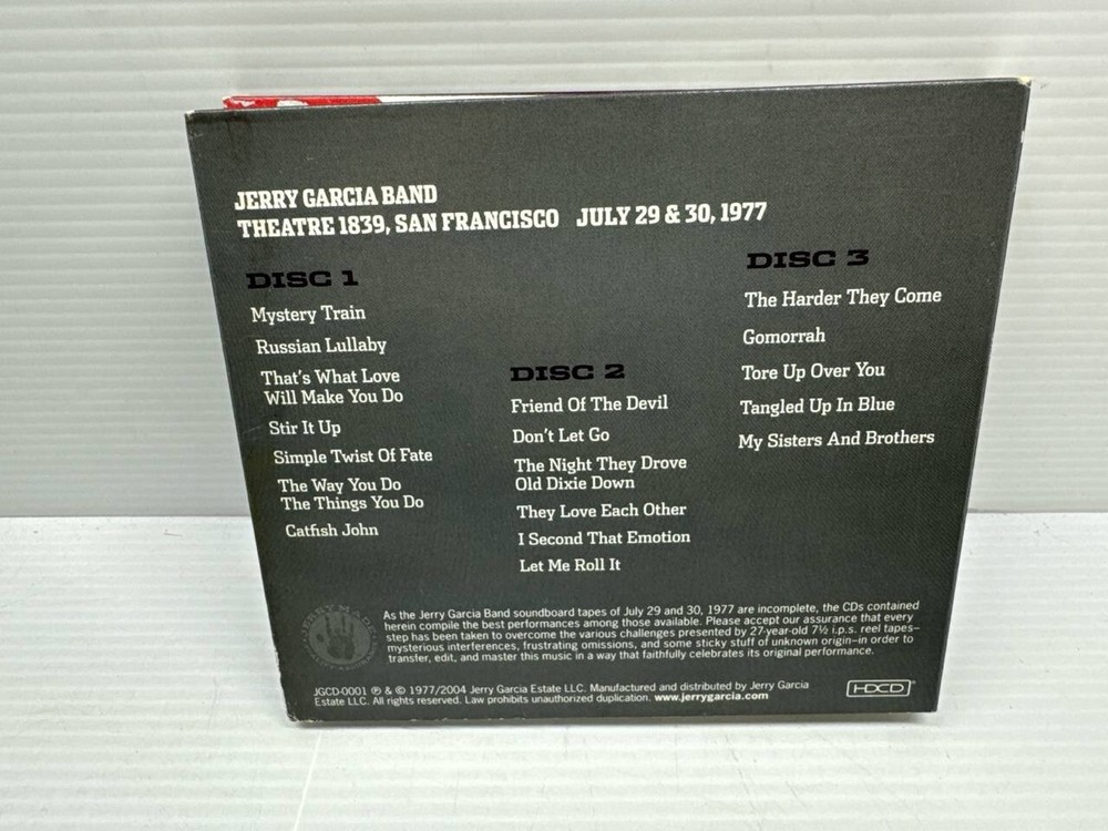 This is a rare and collectible 3 CD set of Jerry Garcia Band's live performance at Theatre 1839 in San Francisco, California on July 29 & 30, 1977. The set features the iconic artist Jerry Garcia and includes some of the best tracks like Country Blues, Jazz Pop, Experimental Rock, Electric Folk, and many more. The release title is Jerry Garcia Band Theatre 1839 San Francisco 1977 and is part of the Pure Jerry series. This collector's edition CD set, released in 2004 by Jerry Garcia Estate (LLC), is a must-have for any true fan of Jerry Garcia or Grateful Dead. It is a first edition and comes with several features like HDCD and JGCD-0001 (JGCD-0001). The CD set is in English and has been manufactured in the United States.
